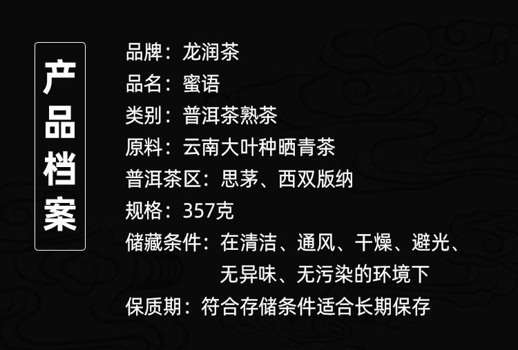 龙润丨蜜语熟茶 普洱熟茶 熟普 2019年 357g 饼茶