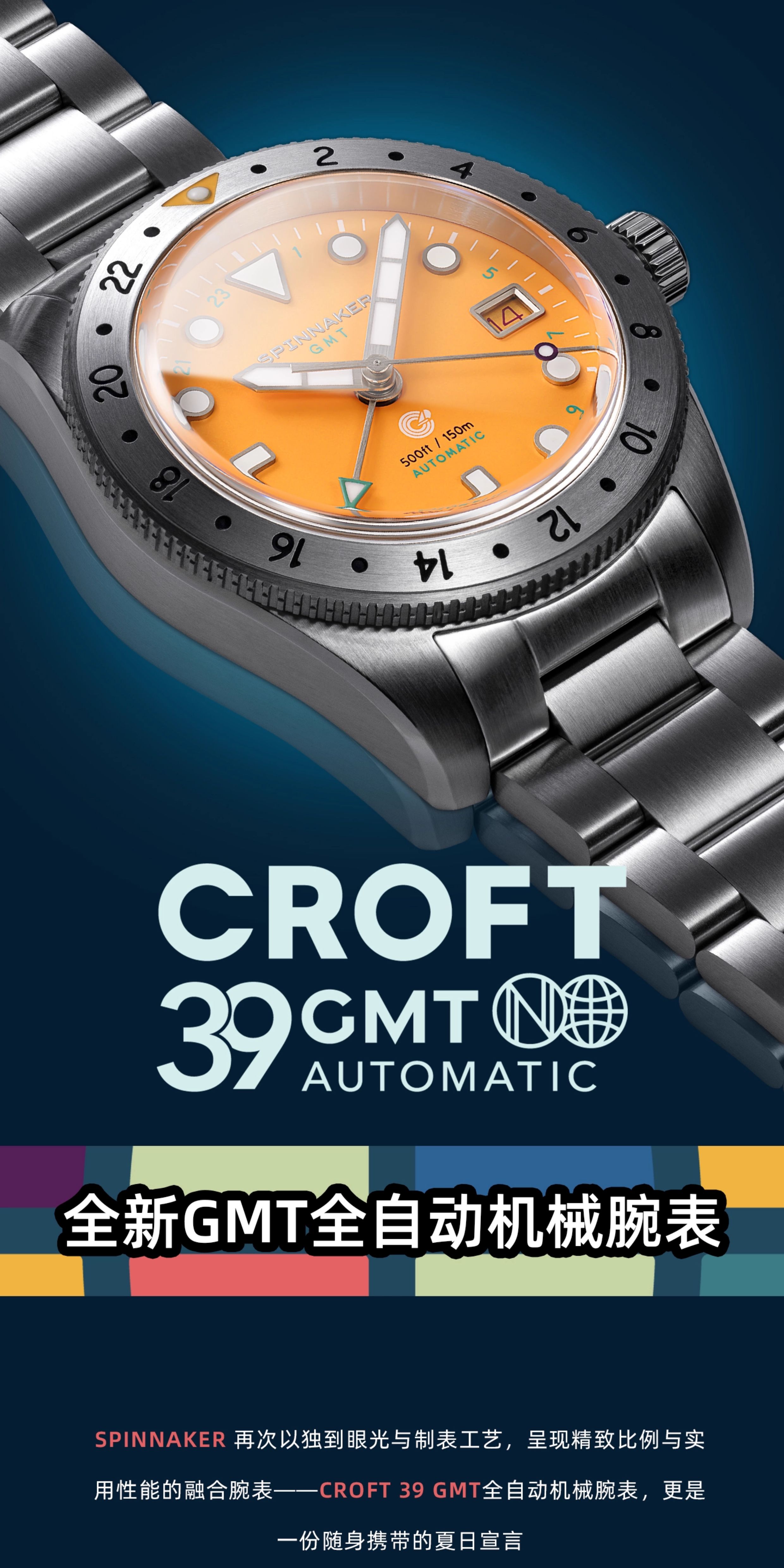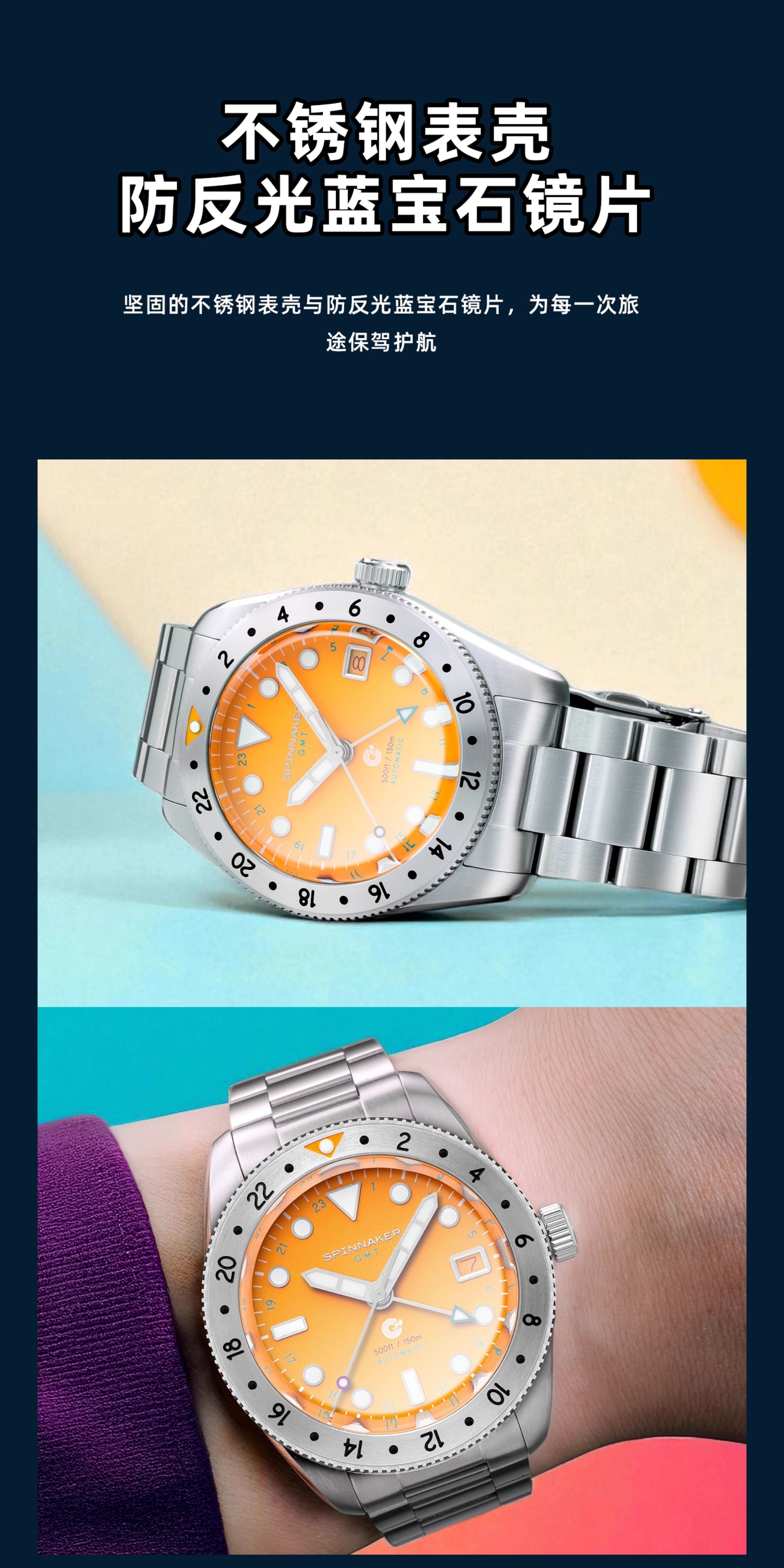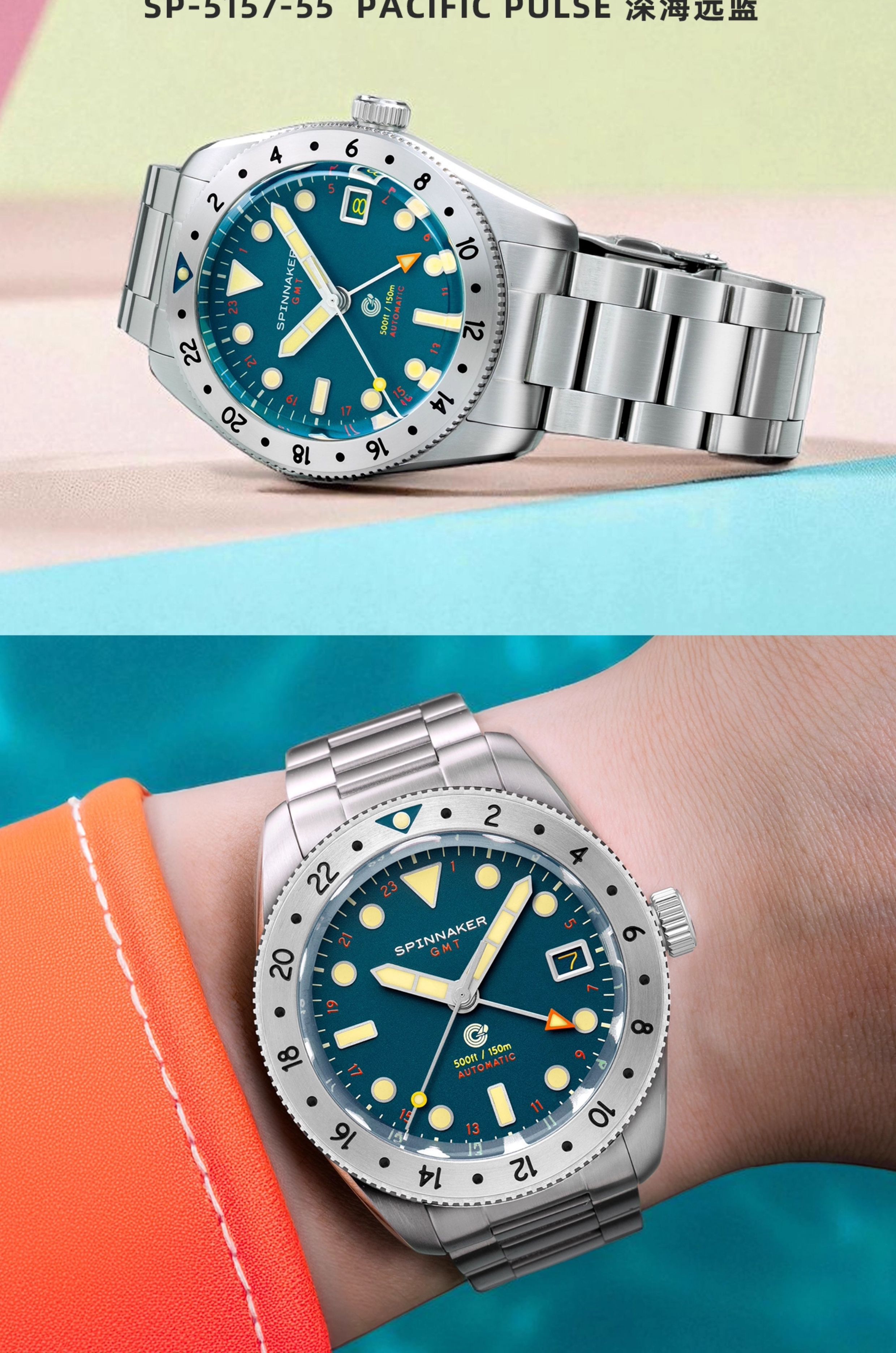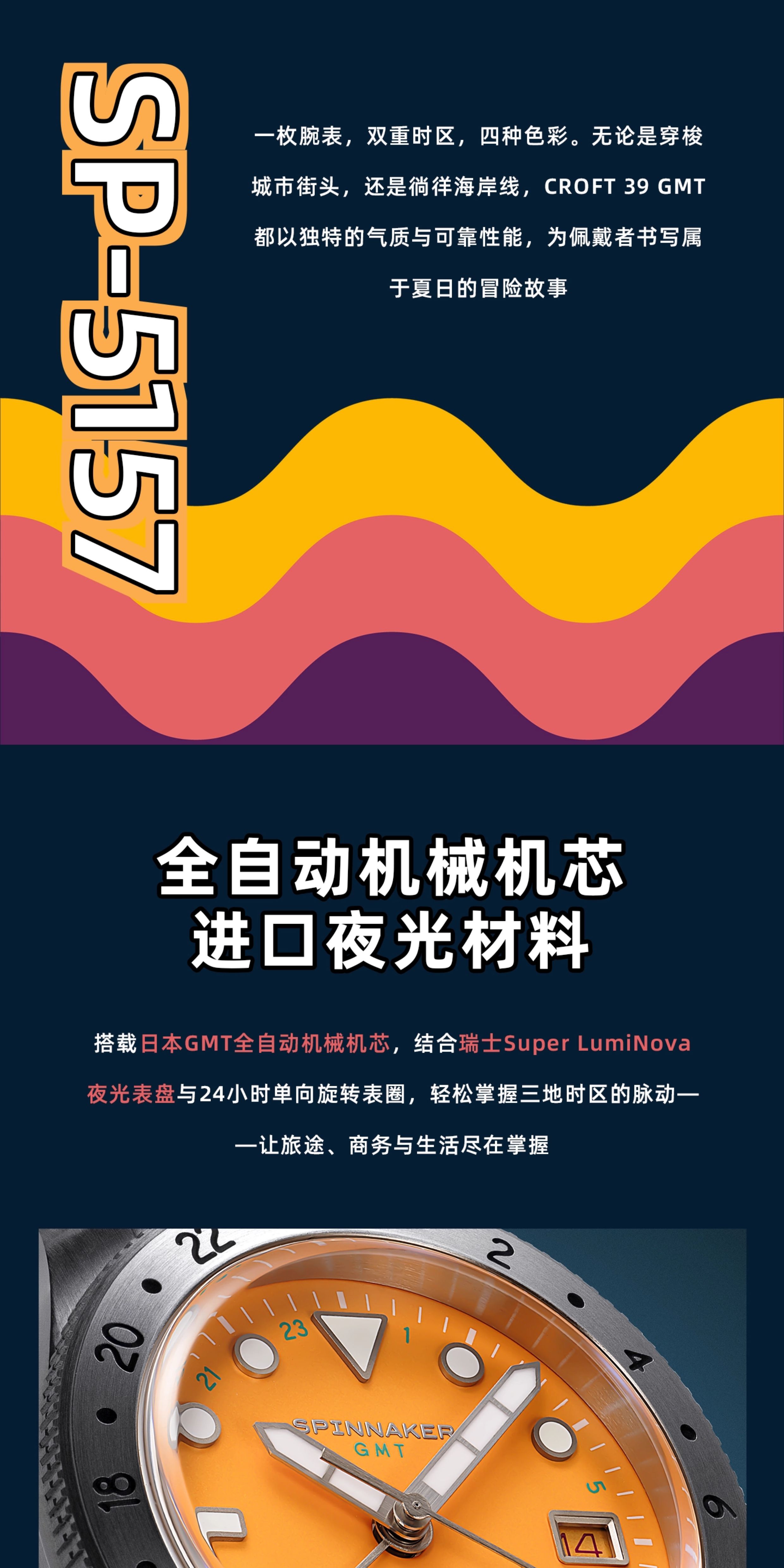 SPINNAKER三角帆39毫米复古GMT两地时自动机械手表5157夜光防水