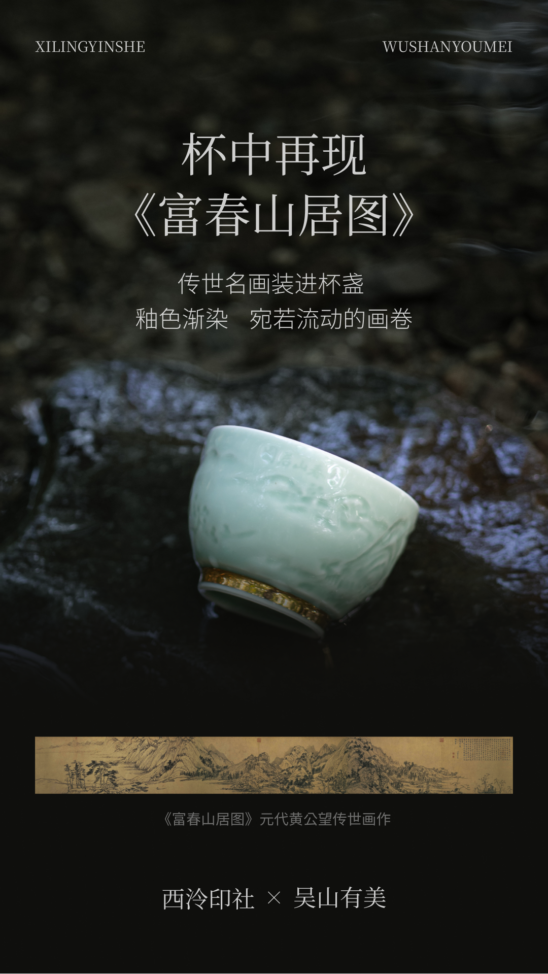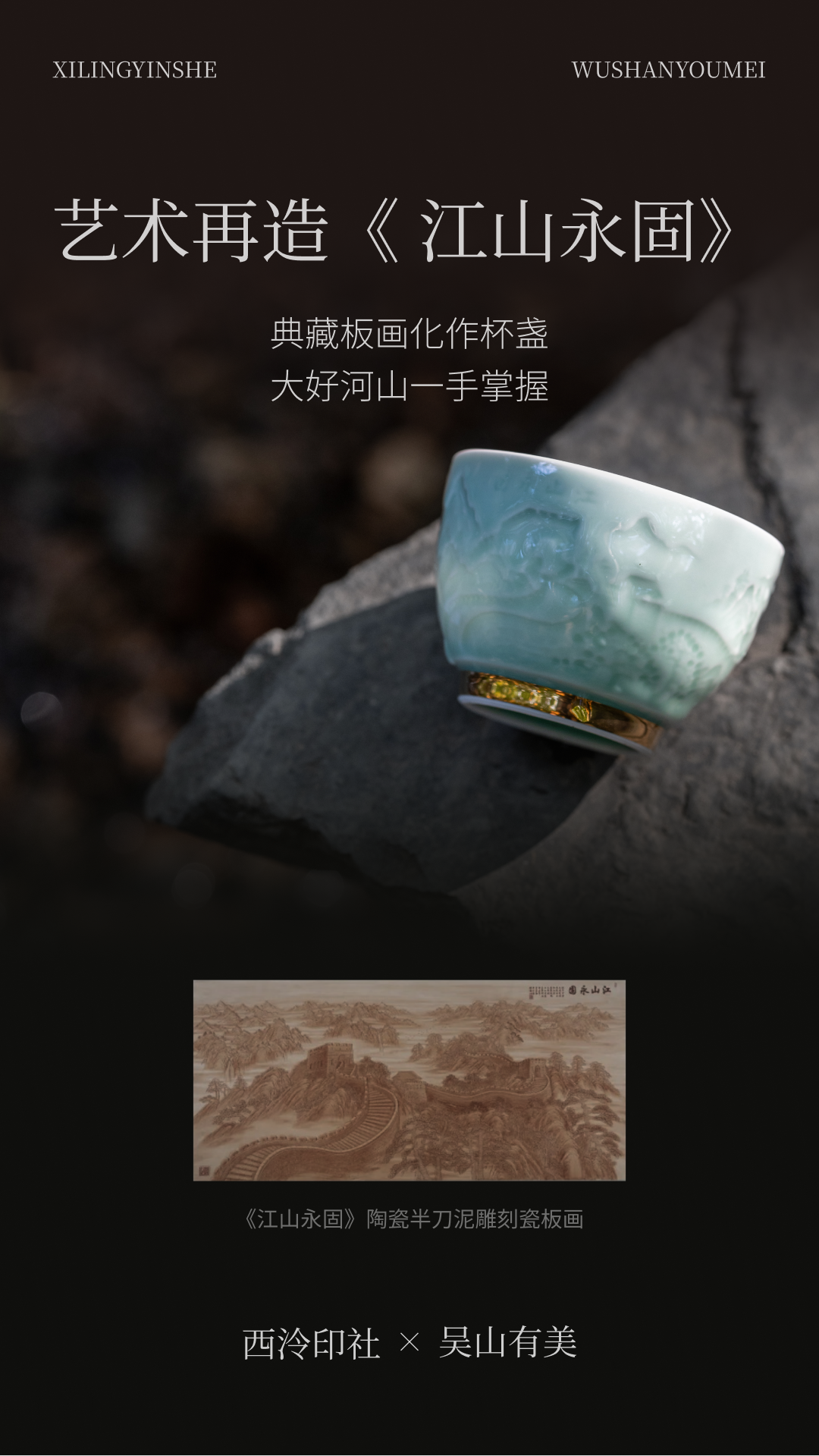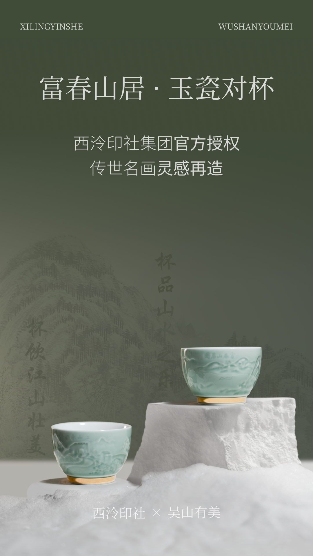 西泠文创倾情推出富春山居图元素玉瓷对杯,将传世名画《富春山居图》与大型泥雕版画《江山永固》微缩于掌上;