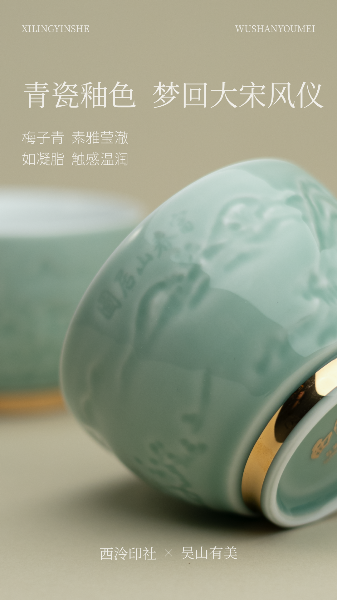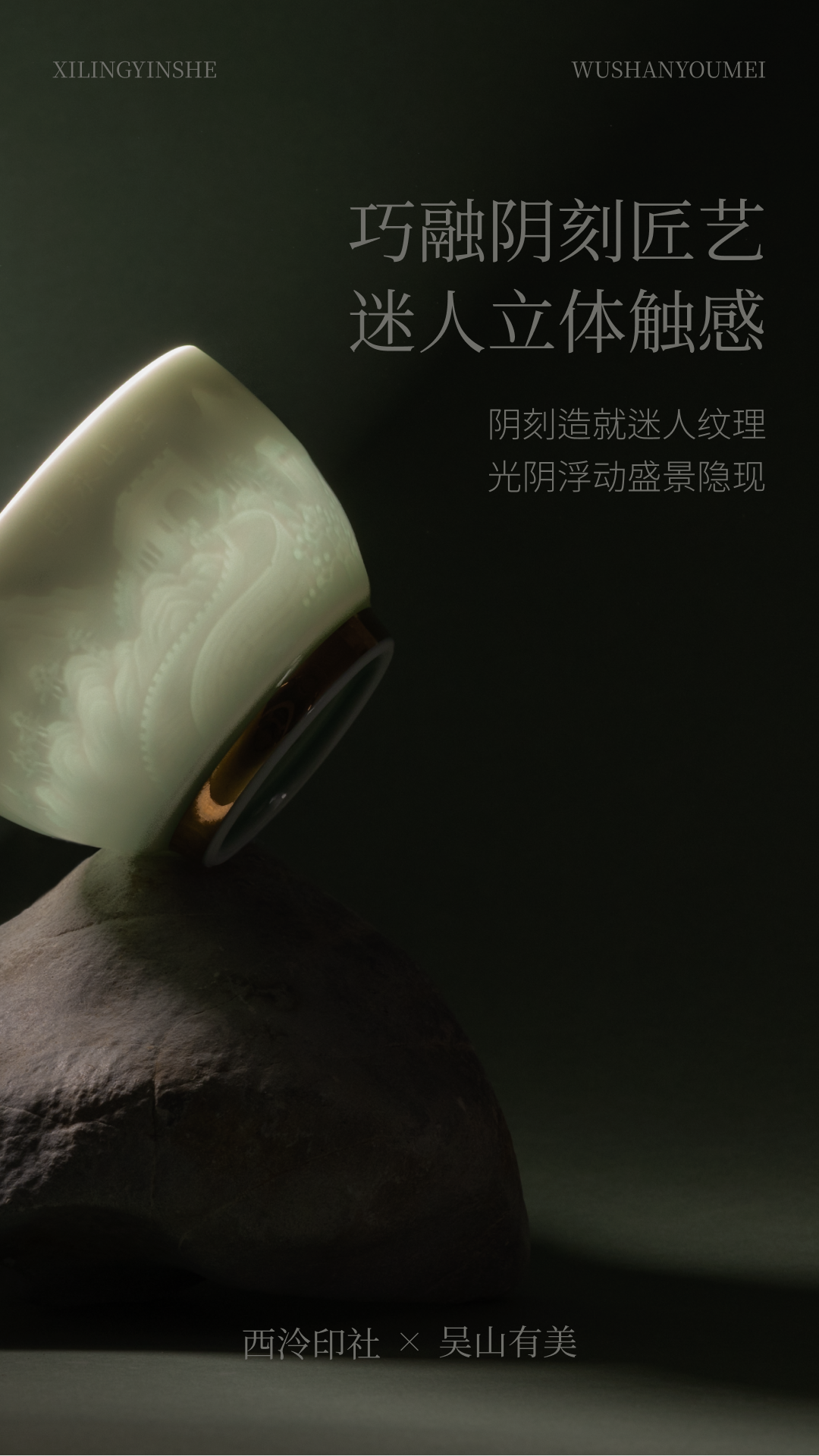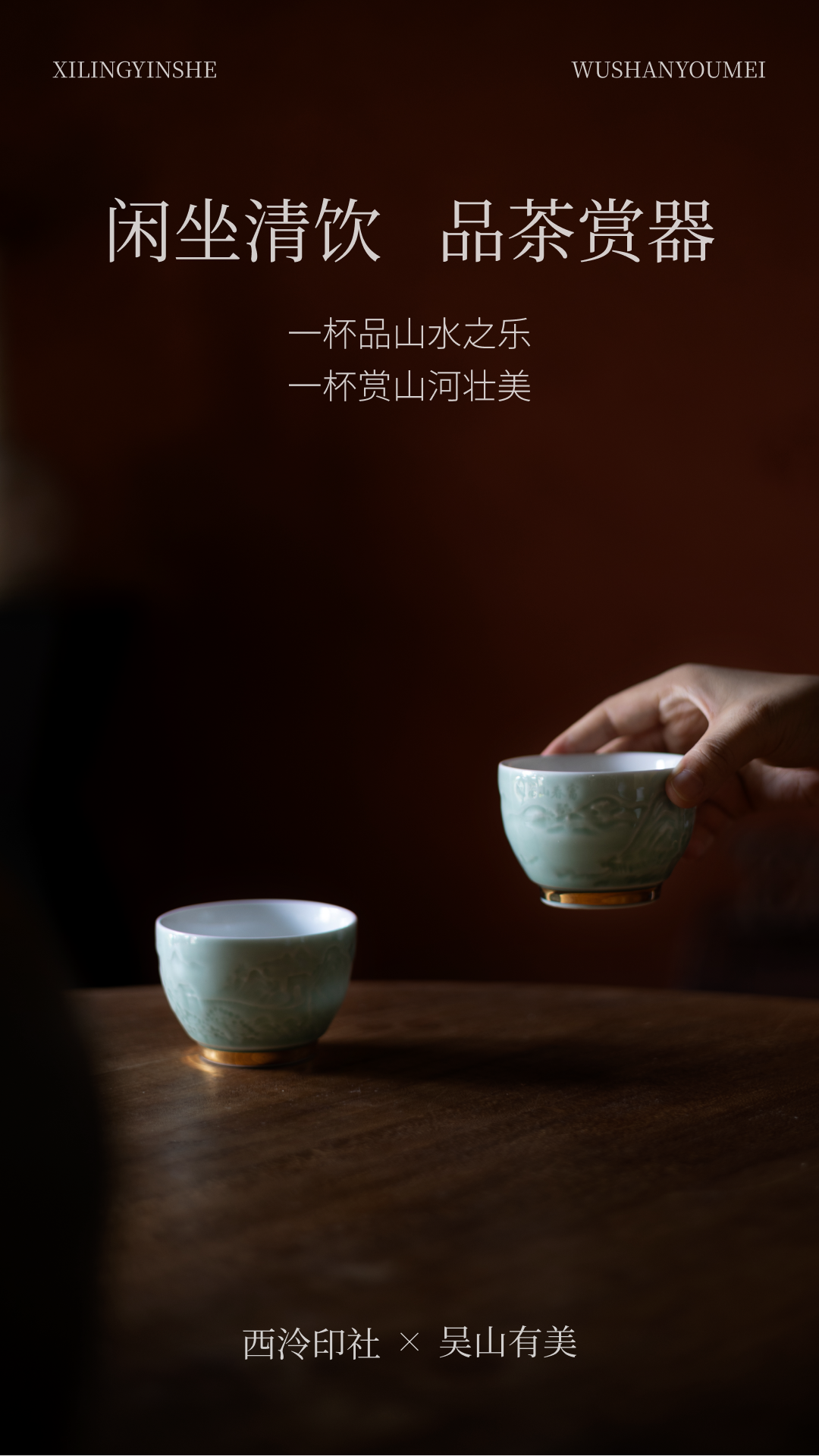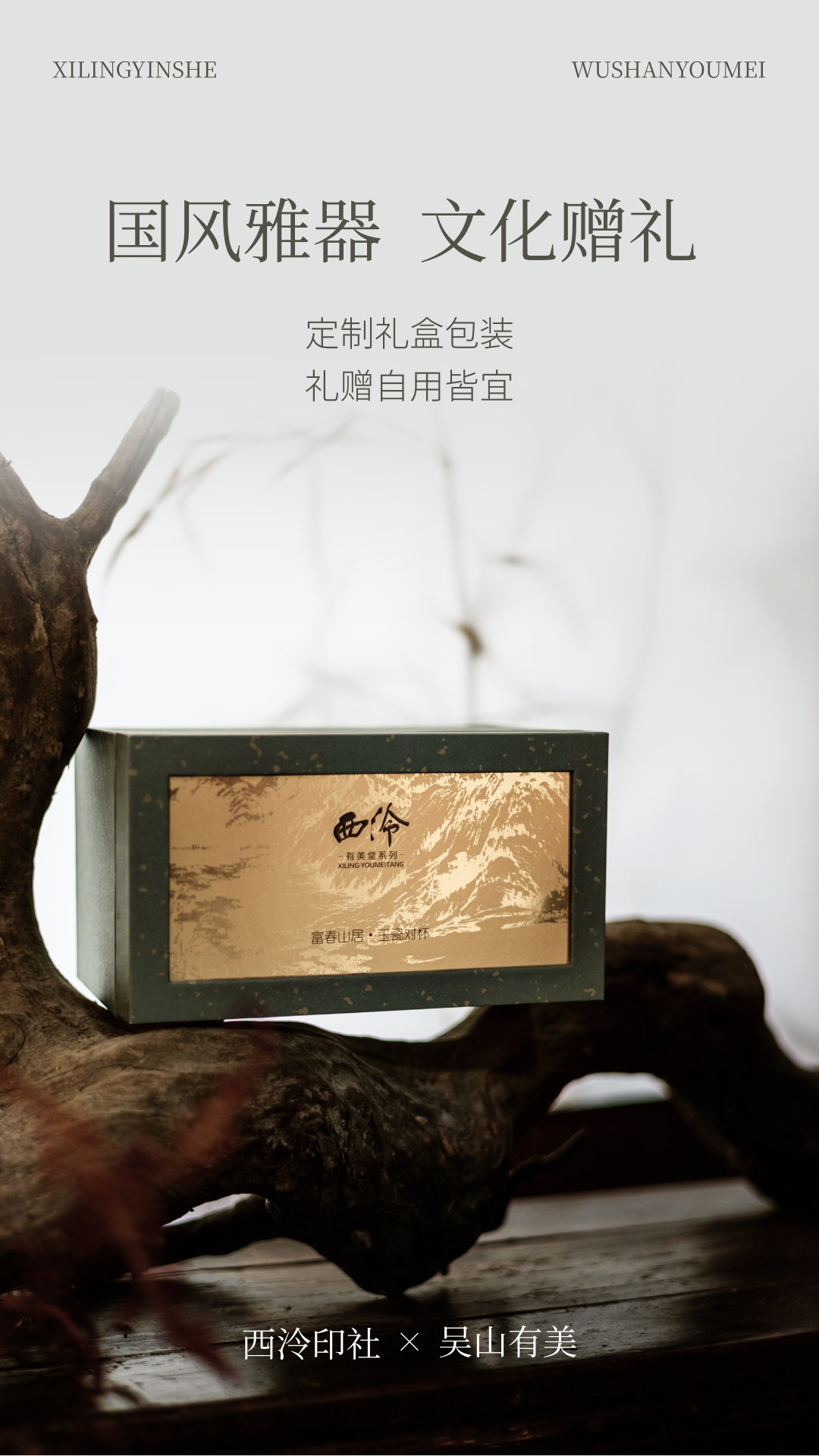 西泠文创倾情推出富春山居图元素玉瓷对杯,将传世名画《富春山居图》与大型泥雕版画《江山永固》微缩于掌上;