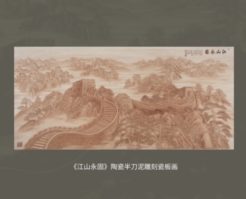 《江山永固》是中国工艺美术大师曹爱勤创作的陶瓷半刀泥雕刻瓷板画,以万里长城为主题。作品采用锗红色调,象征红色江山,展现了长城的雄伟与山川的壮丽。