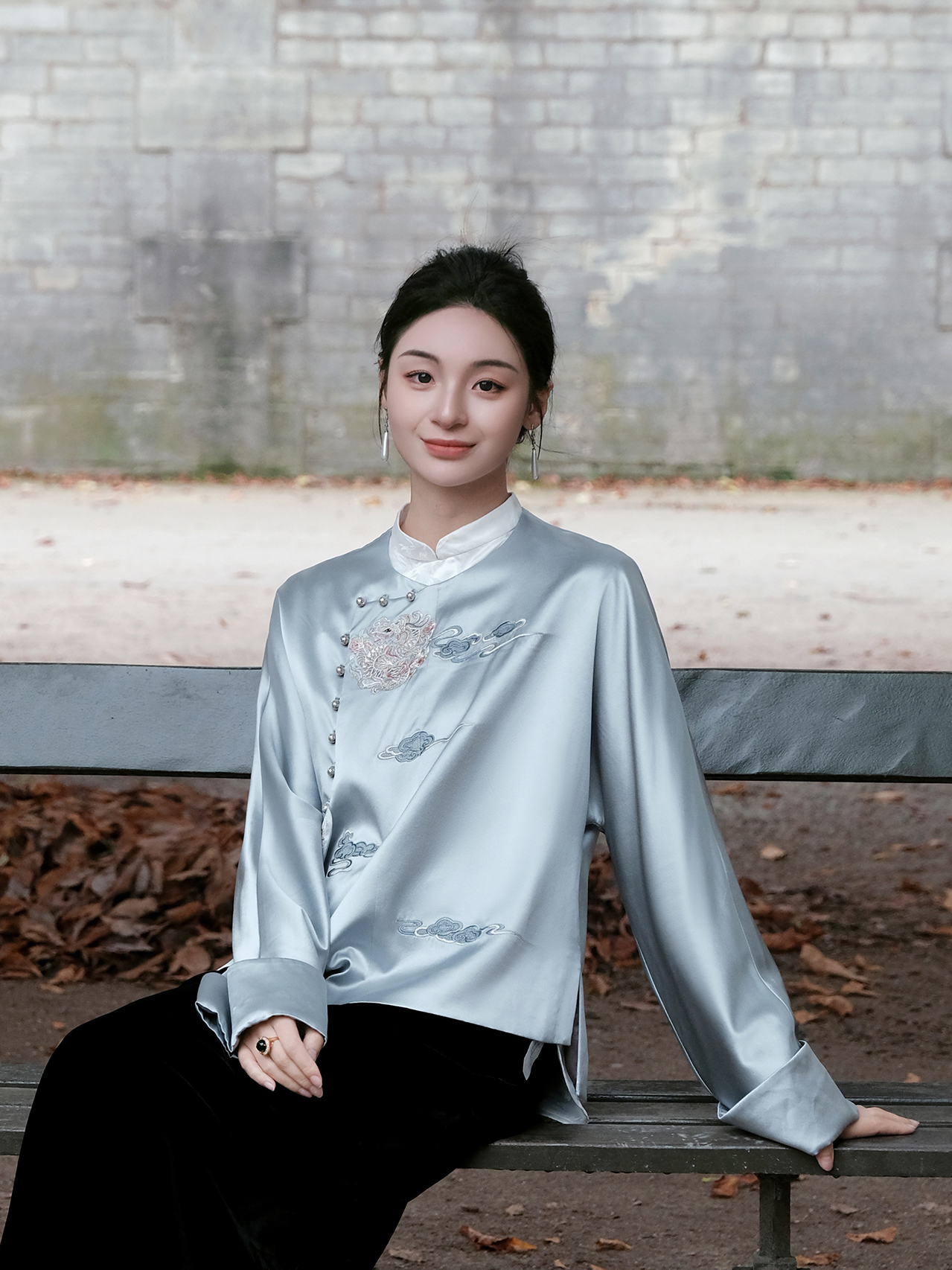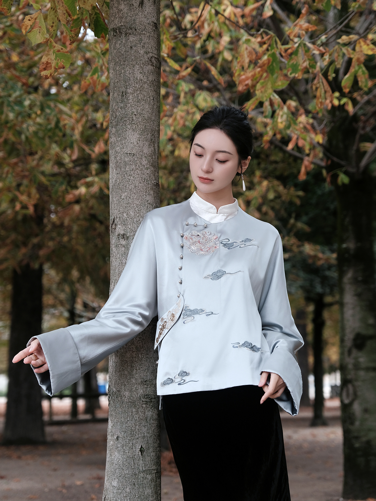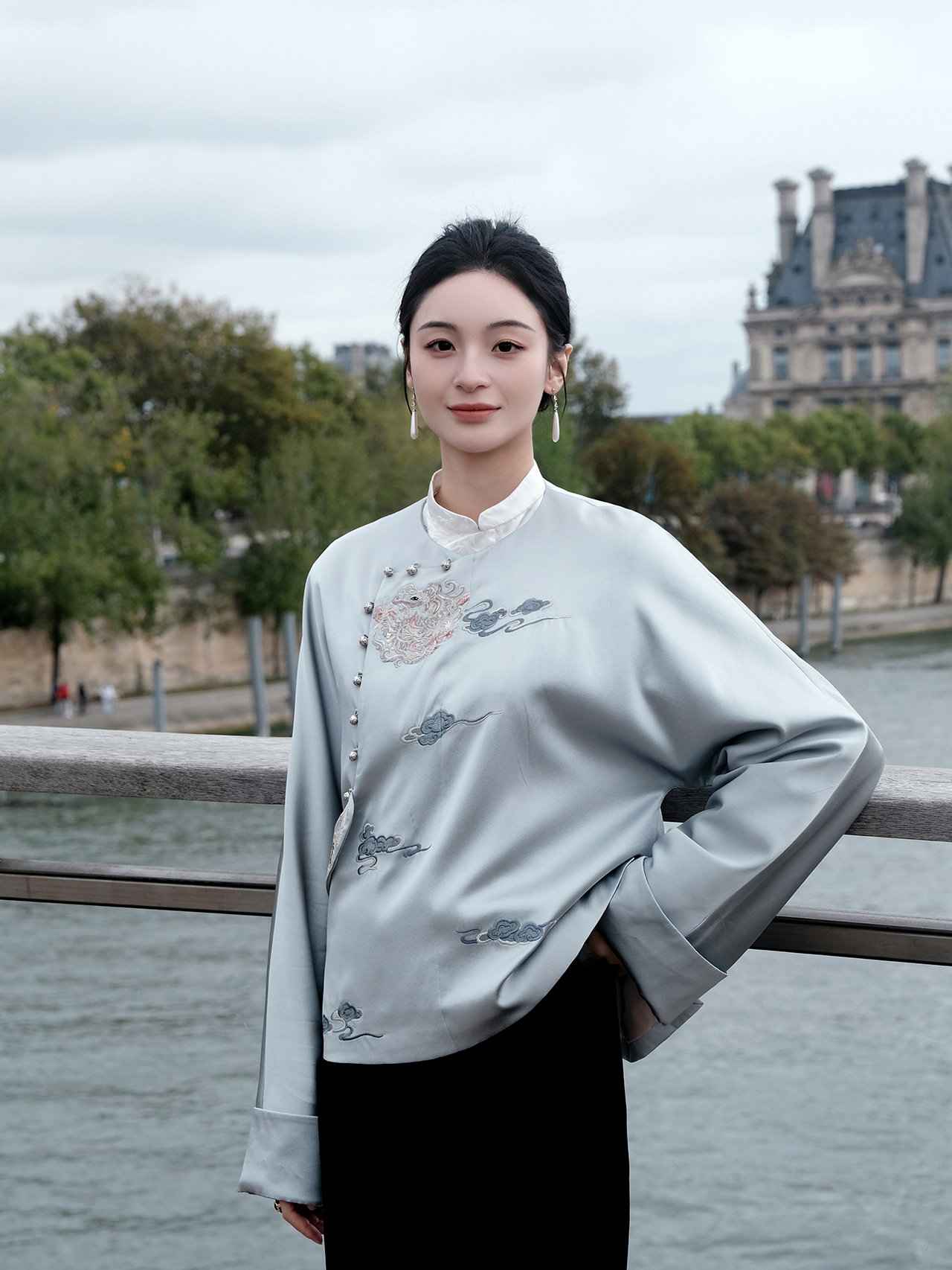 东方境X郭培| 团龙祥云真丝刺绣新中式外套-蓝色