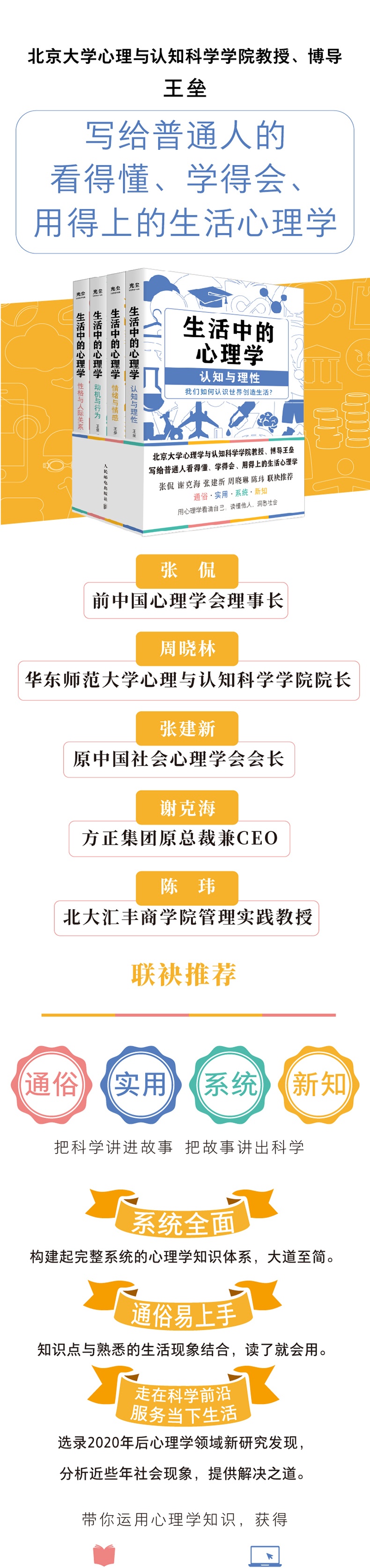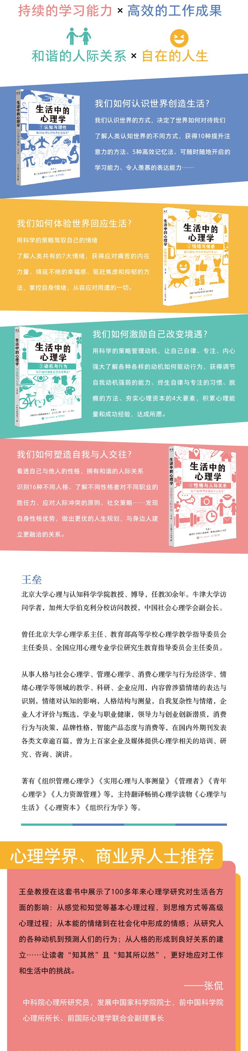 本书作者北京大学心理学教授王垒,基于自己多年的心理学研究与积淀,并结合当下中国人存在的生活现象来解读心理学重要知识,将抽象枯燥的认知心理学鲜活化、生活化、通俗化。更重要的是,作者赋予了认知心理学知识的应用场景,能够让读者在提升心智的同时学以致用。 《生活中的心理学1:认知与理性》告诉我们如何认识世界创造生活,我们认识世界的方式,决定了世界如何对待我们。读这本书,你将了解人类认知世界的不同方式,获得10种提升注意力的方法、5种*记忆法、可随时随地开启的学习能力、令人羡慕的表达能力。 《生活中的心理学2:情绪与情感》告诉我们如何体验世界回应生活,用科学的策略驾驭自己的情绪。读这本书你将了解人类共有的7大情绪,获得应对痛苦的内在力量、绵延不绝的幸福感、驱赶焦虑和抑郁的方法,掌控自身情绪,从容应对周遭的一切。 《生活中的心理学3:动机与行为》告诉我们如何激励自己改变境遇,用科学的策略管理动机,让自己自律、专注、内心强大。读这本书,你将了解各种各样的动机如何驱动行为,获得调节自我动机强弱的能力、*自律与专注的习惯、脱瘾的方法、夯实心理资本的4大要素,积累心理能量和成功经验,达成所愿。 《生活中的心理学4:性格与人际关系》告诉我们如何塑造自我与人交往,看透自己与他人的性格,拥有和谐的人际关系。读这本书你将识别16种不同人格、了解不同性格者对不同职业的胜任力、应对人际冲突的原则、社交策略……发现自身性格优势,做出更优的人生规划,与身边人建立更融洽的关系。