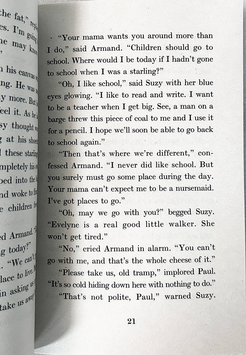 But the children who lived under the bridge recognized a true friend when they met one, even if the friend seemed a trifle unwilling at the start. And it did not take Armand very long to realize that he had gotten himself ready-made family; one that he loved with all his heart, and one for whom he would have to find a better home than the bridge.