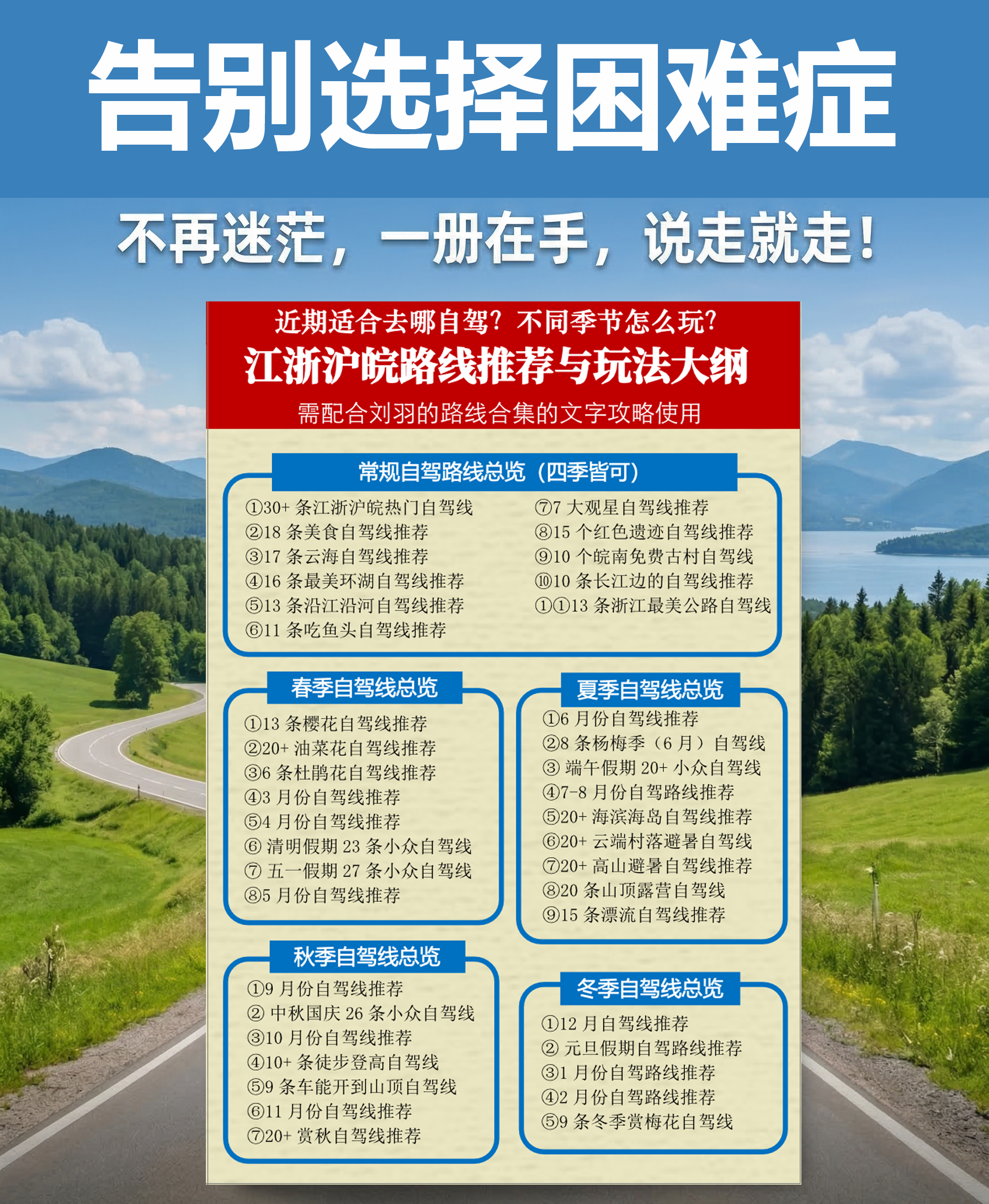 - 老司机都在用的自驾游路书宝典,主理人刘羽,旅游从业15年,每条路线都实地踩线,精心制作了这套自驾路线攻略合集,我们的使命是:让每个人都能“更轻松地”享受到自驾游的乐趣。【山川湖海,羽你同行】