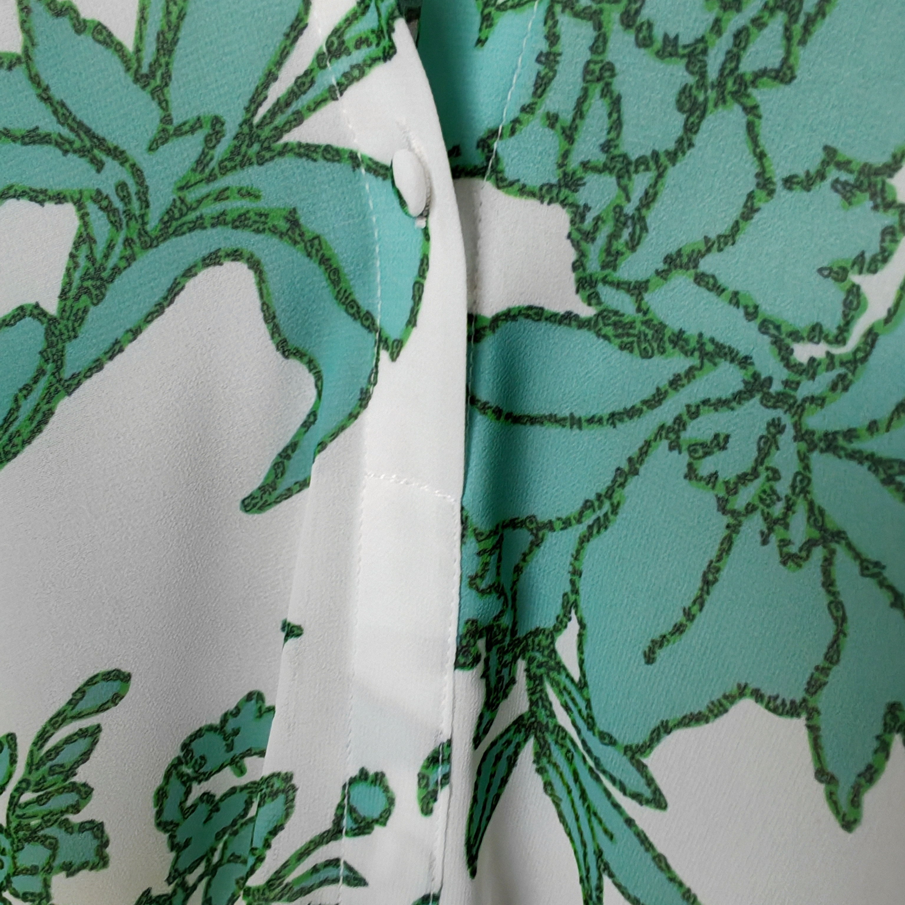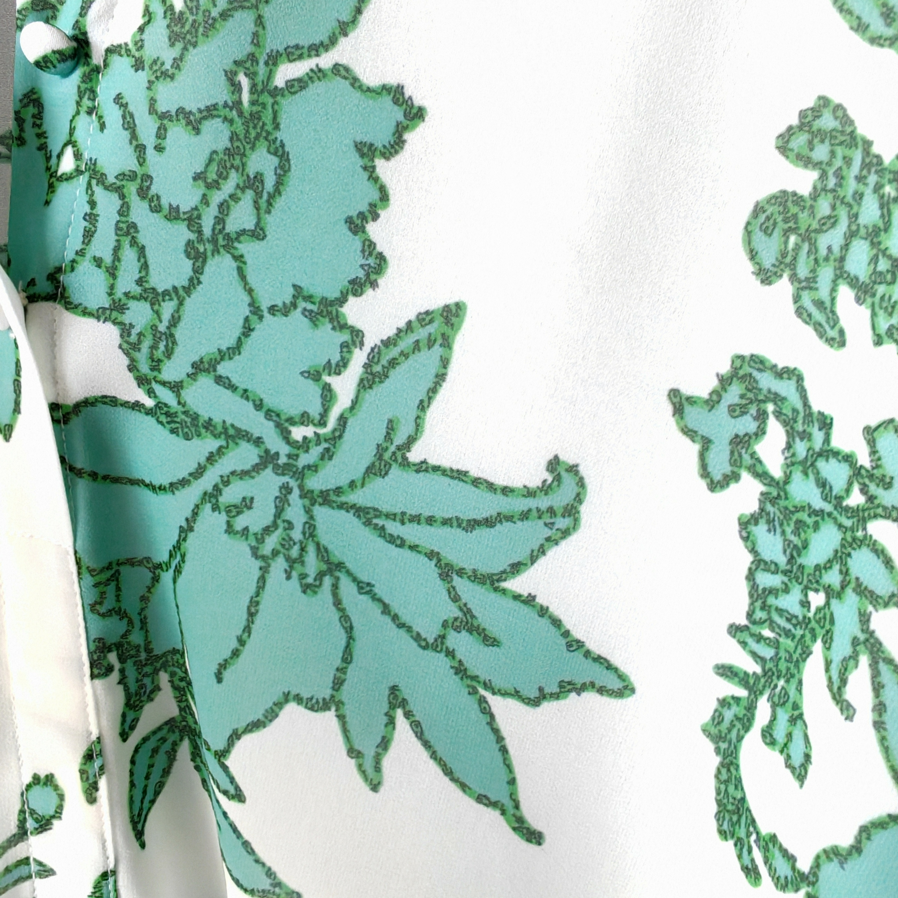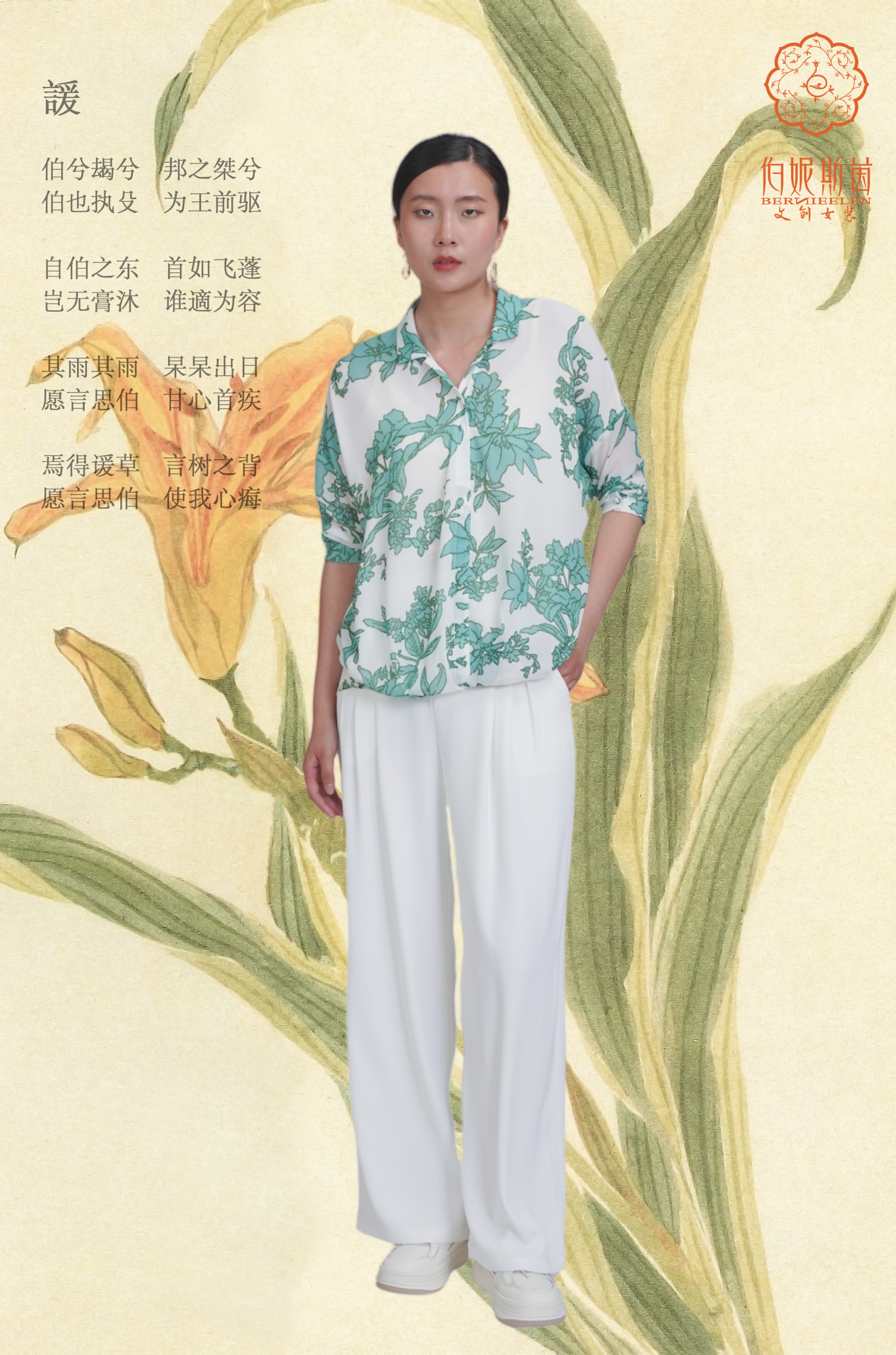 伯妮斯茵 | 温柔清雅 白底绿花雪纺上衣 诗经《谖》主题纹样 透气飘逸 气质出游款 SZ3F01-铜青色衬衫