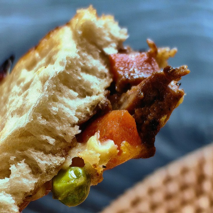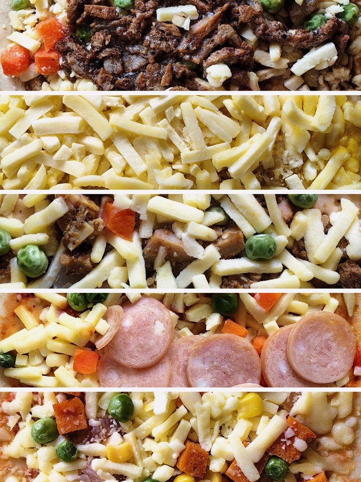 肉香满溢披萨:连绵不断的拉丝芝士下,藏着满满的馅料,肉香四溢,满足肉食动物的狂热欲望。