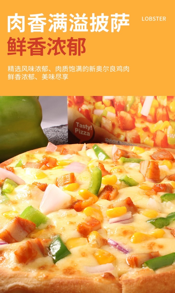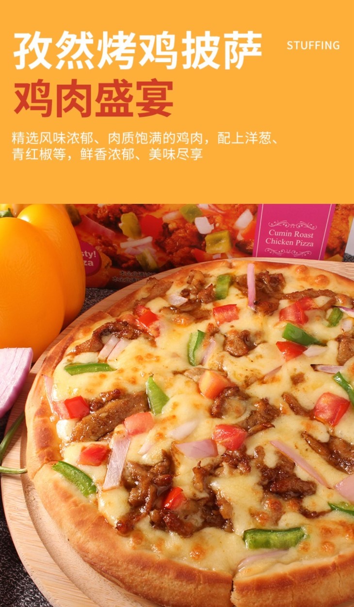 孜然烤鸡披萨:孜然鸡肉粒在高温烘烤后散发鲜香,搭配马苏里拉芝士和意式风味披萨酱,青红椒提鲜,让美味直线上升。
