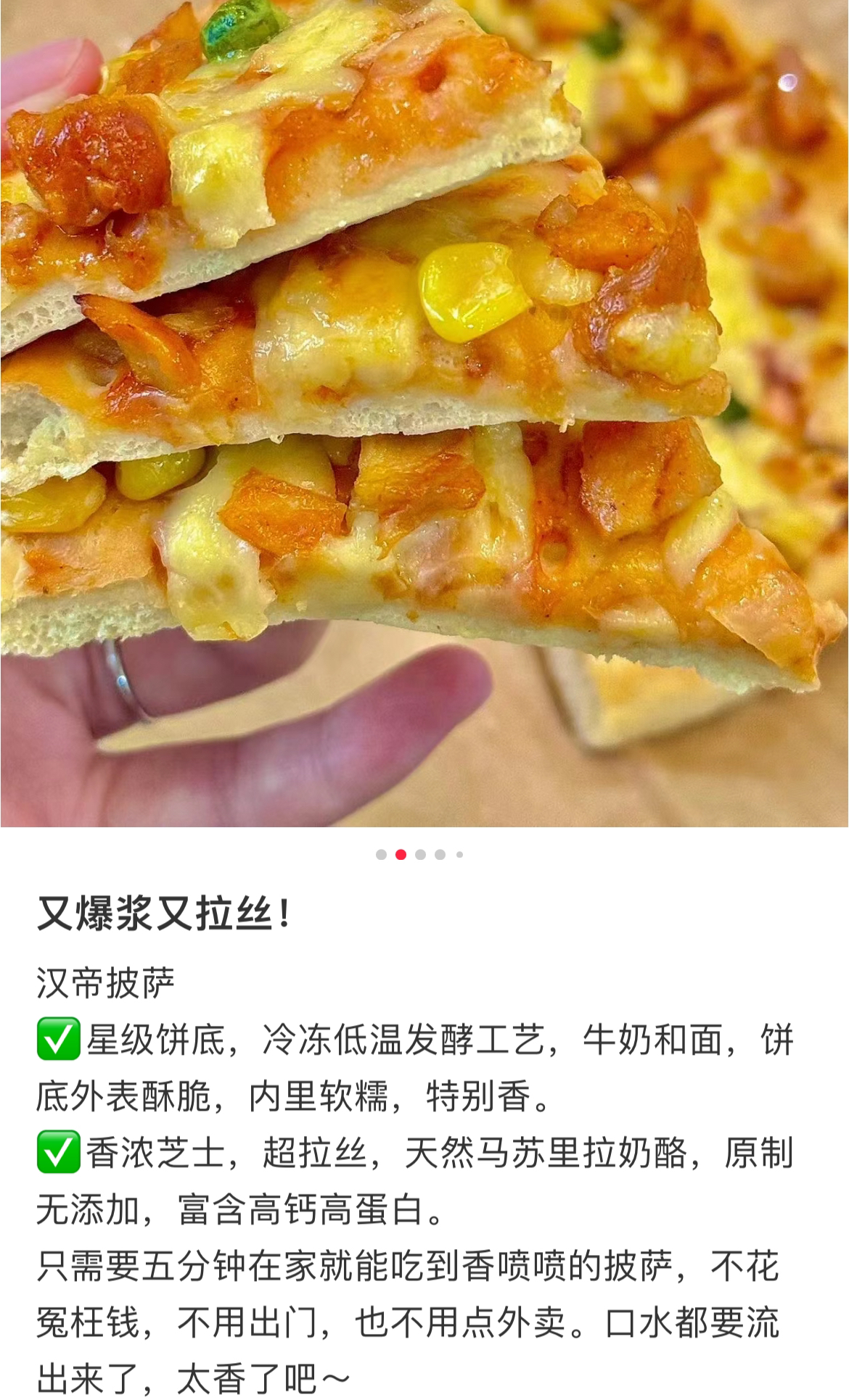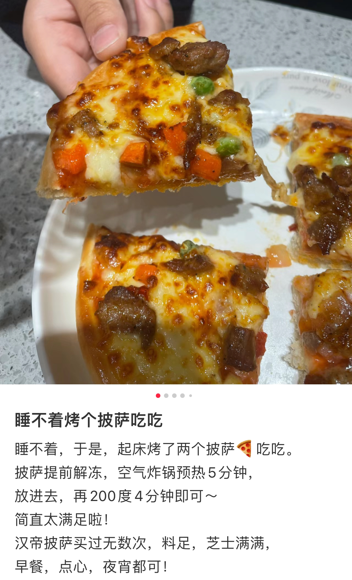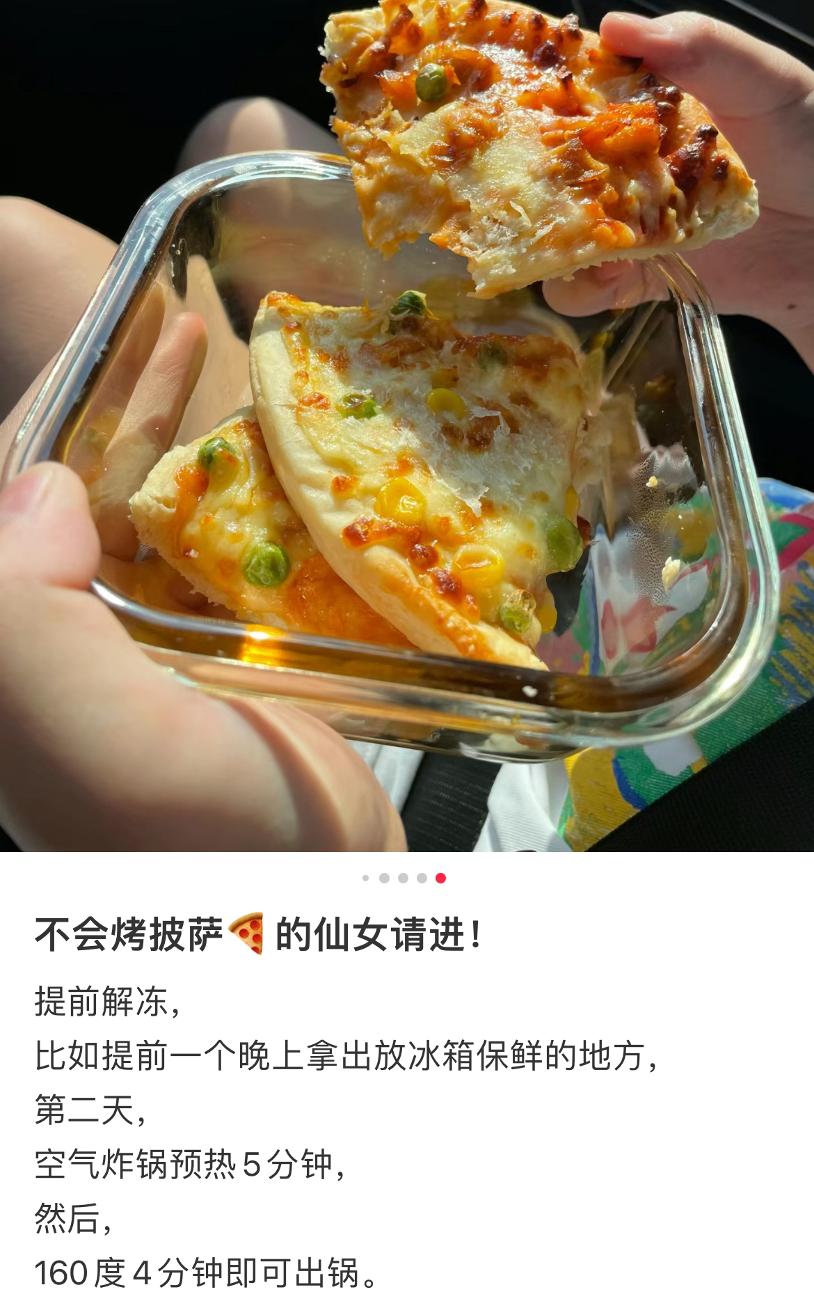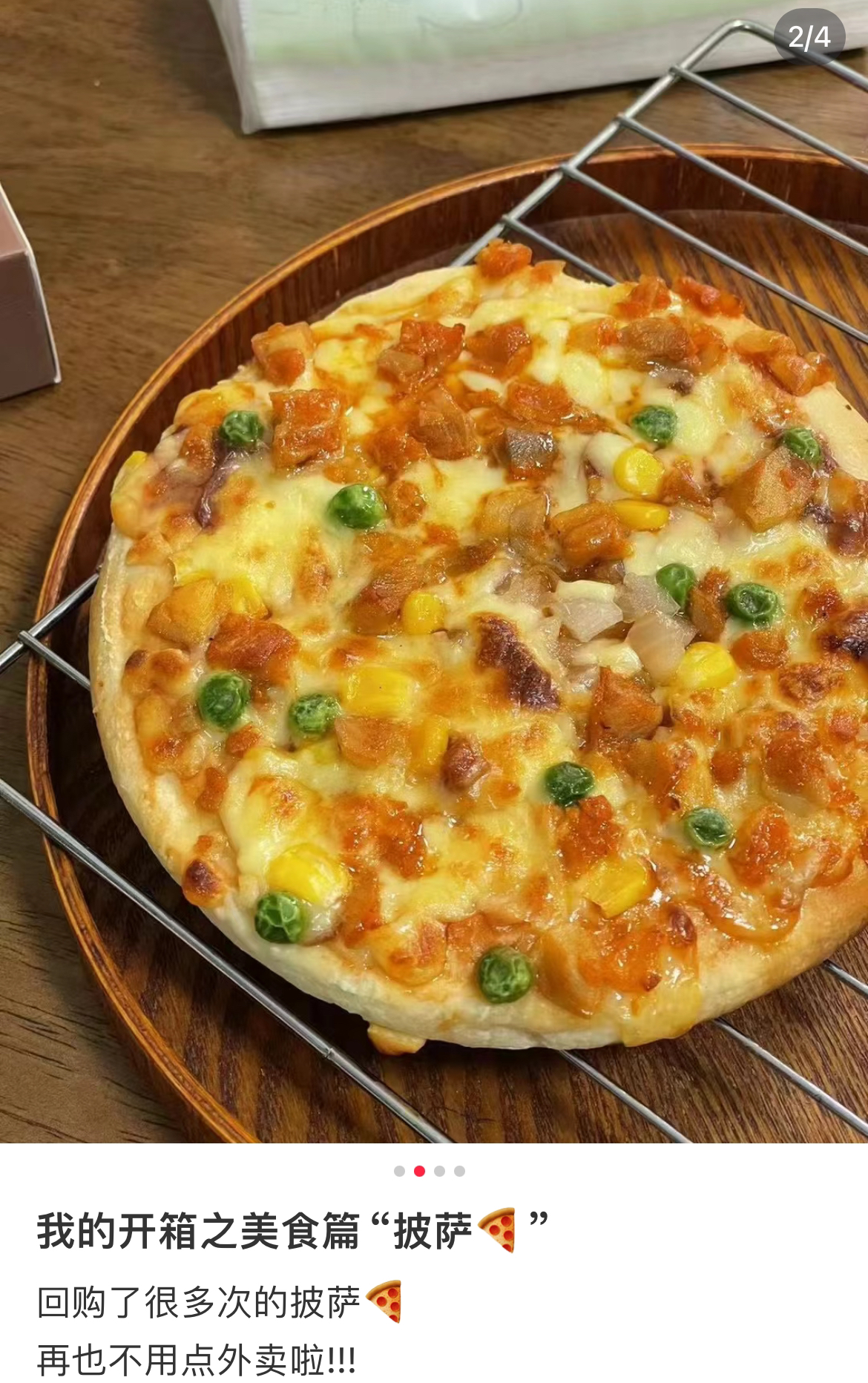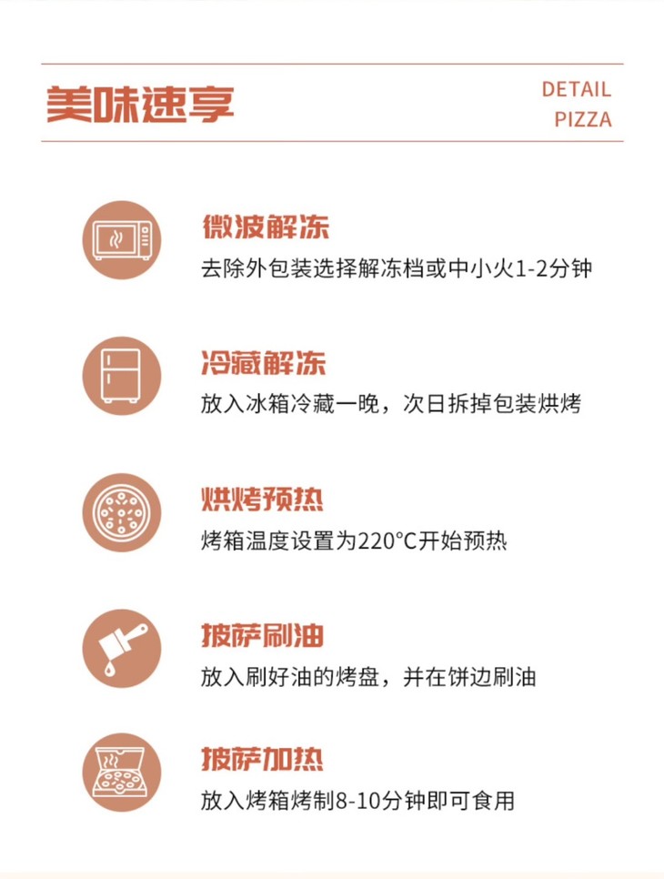 收到后记得及时冷冻保存哦!想吃时建议扔烤箱以220度上下火烤8-10分钟,或者空气炸锅220度10分钟,就能吃上酥脆的披萨啦。一人份量,口味都蛮不错,主要真的是方便!价格也很可了,59.9元五盒,一盒不到12元,懒人小白可以一囤!
