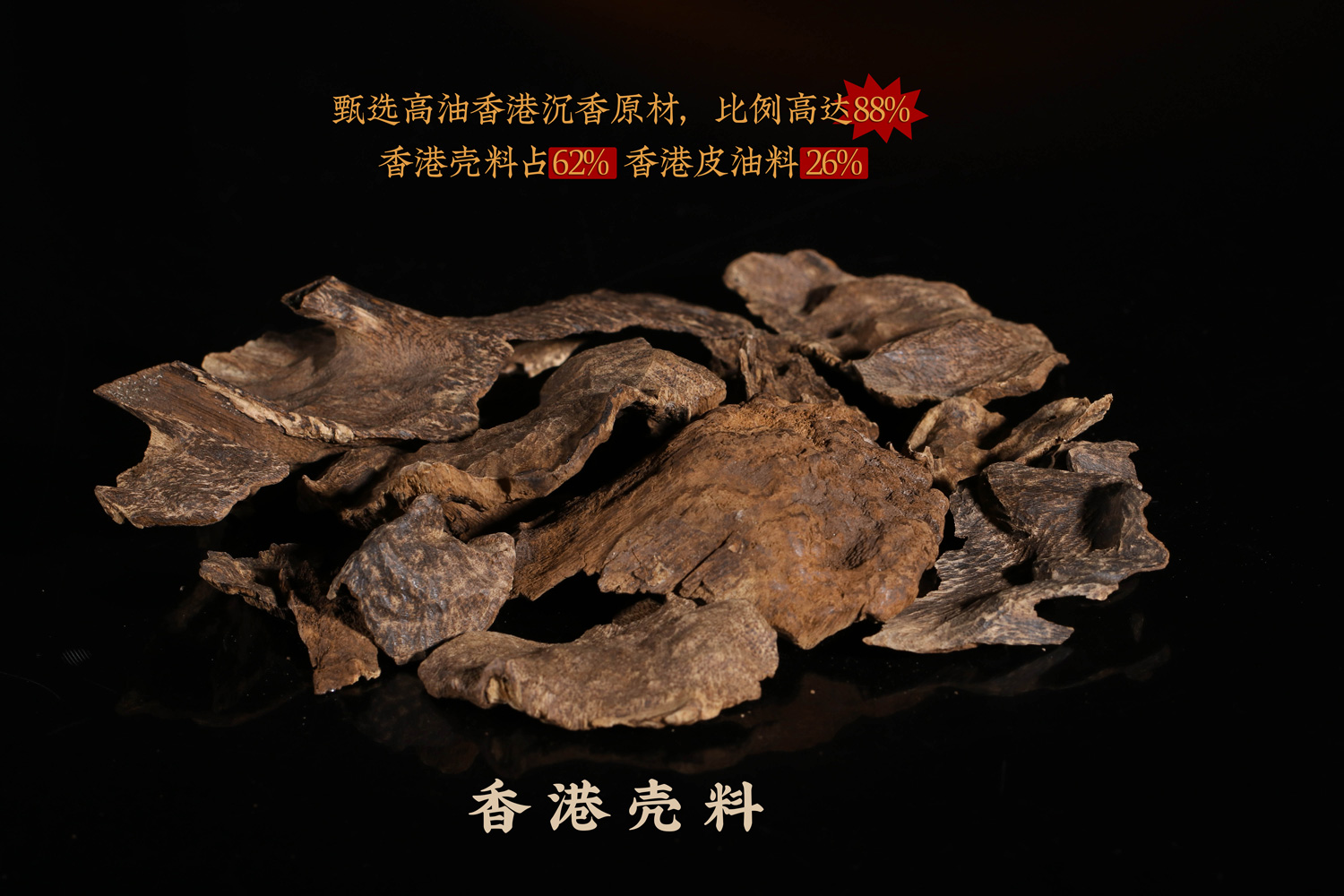 香港沉香多以野生为主,香树树龄长,香脂醇厚,药用、香用效果上乘。本款线香,甄选油脂饱满、香韵标准的上等香港沉香原材,其中香港壳料62%、香港皮油26%,合计占比高达88%,粘粉比例低至12%,保留更纯美干净的香港沉香香韵。