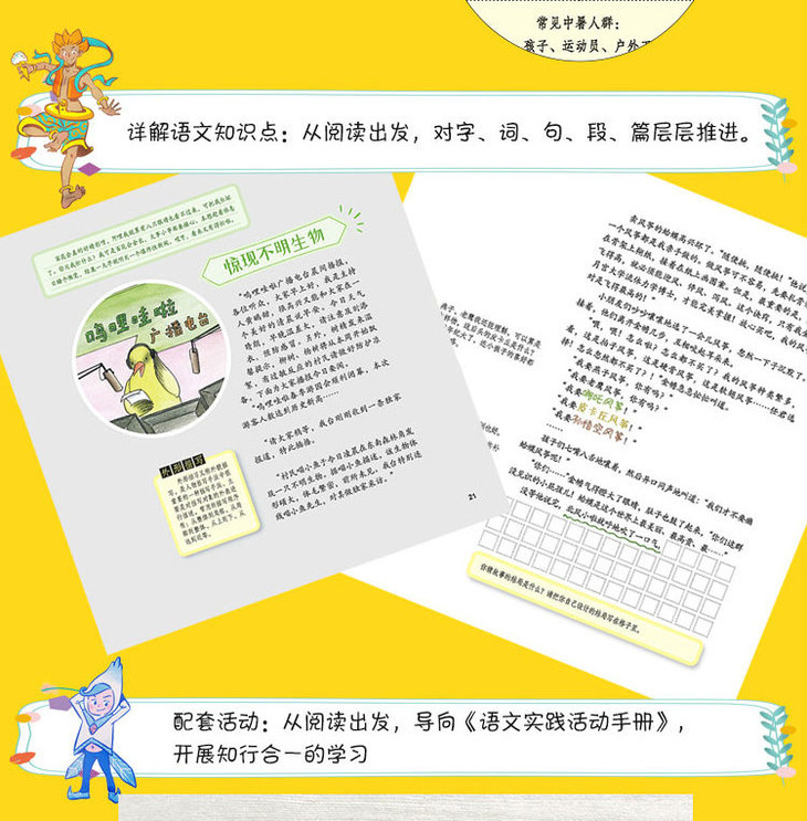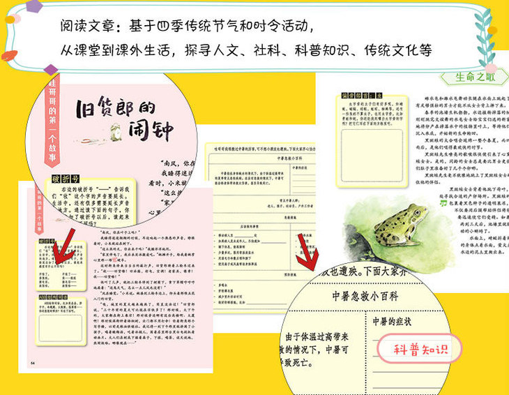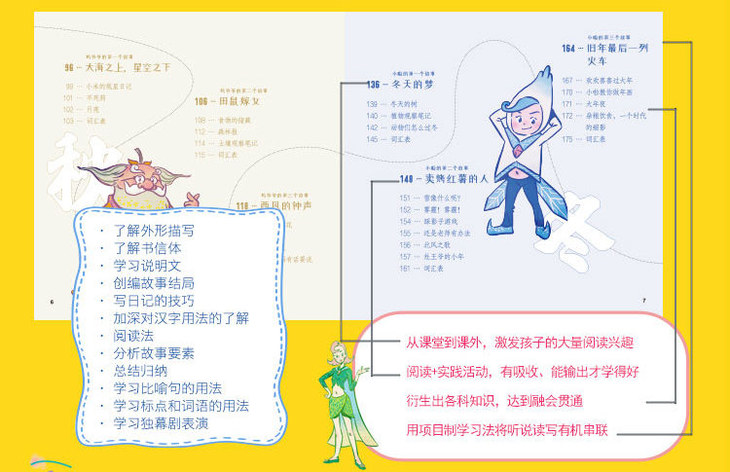 通过四位风神的讨论和呜哩哇啦村的一些人物带出语文知识点,每篇阅读材料的旁边有语文学习相关的笔记和涂鸦。每个季节里的文章经过轮班风神的叙述可以串联起来,形成一个有序的组织。