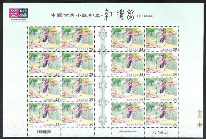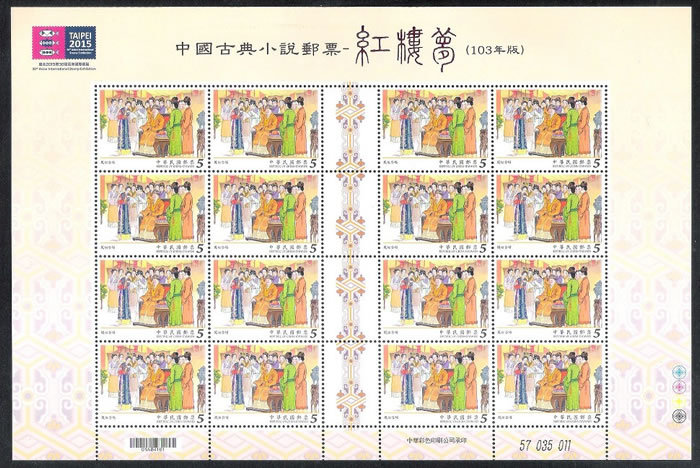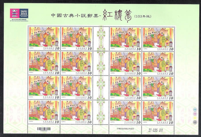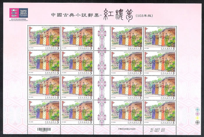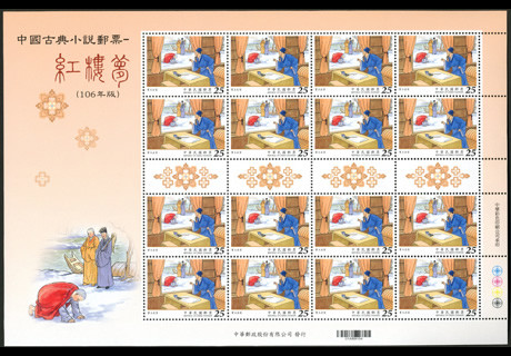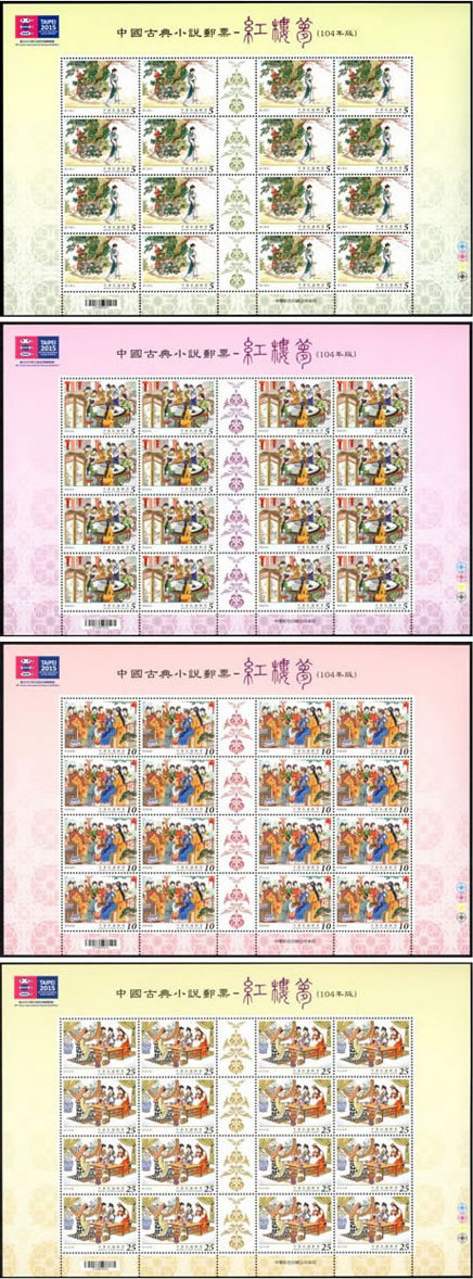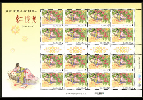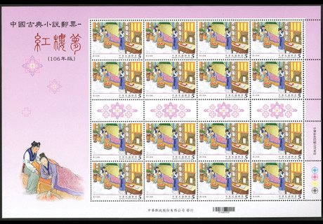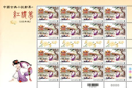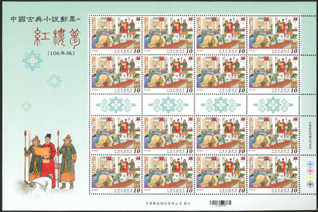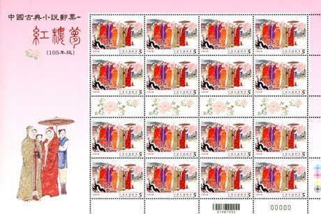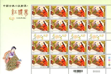 大版票每一组由四张组成,每张有16枚邮票,纸边带有红楼梦邮票的各种色标和铭记,因此更具收藏价值!如下图: