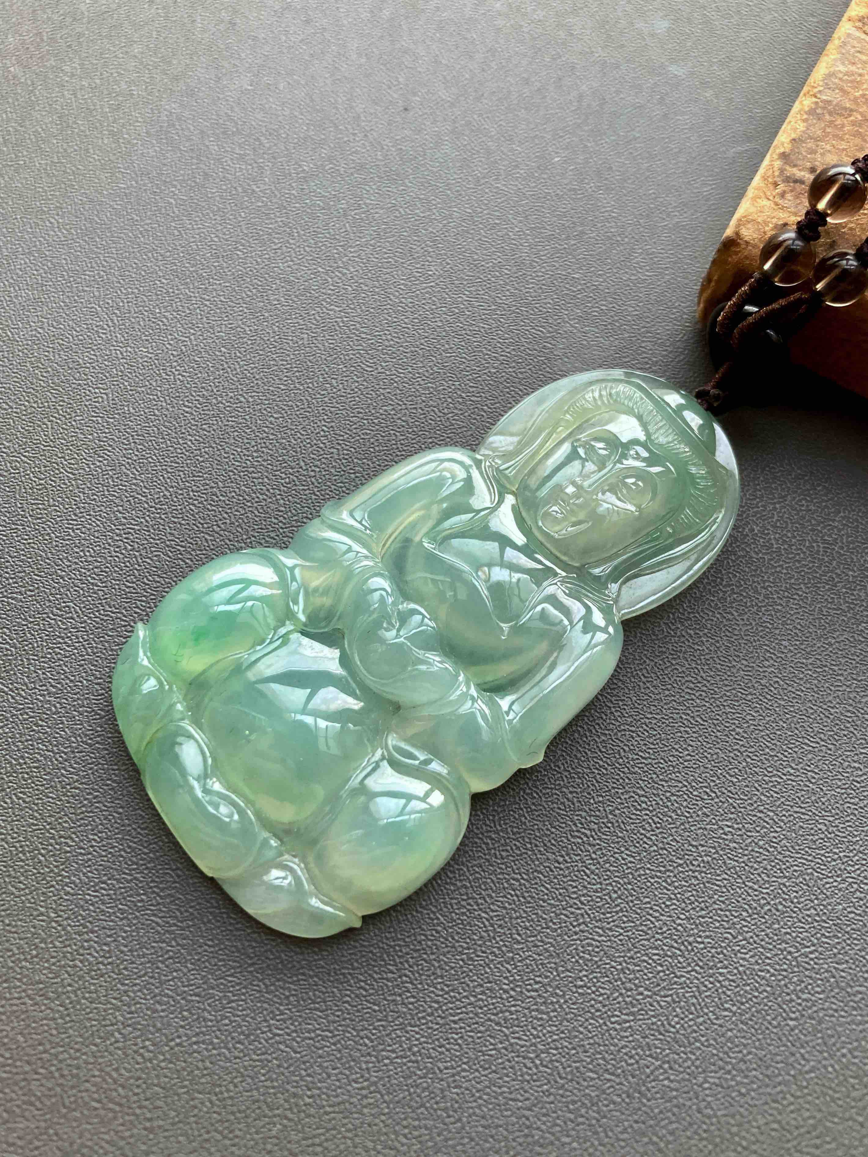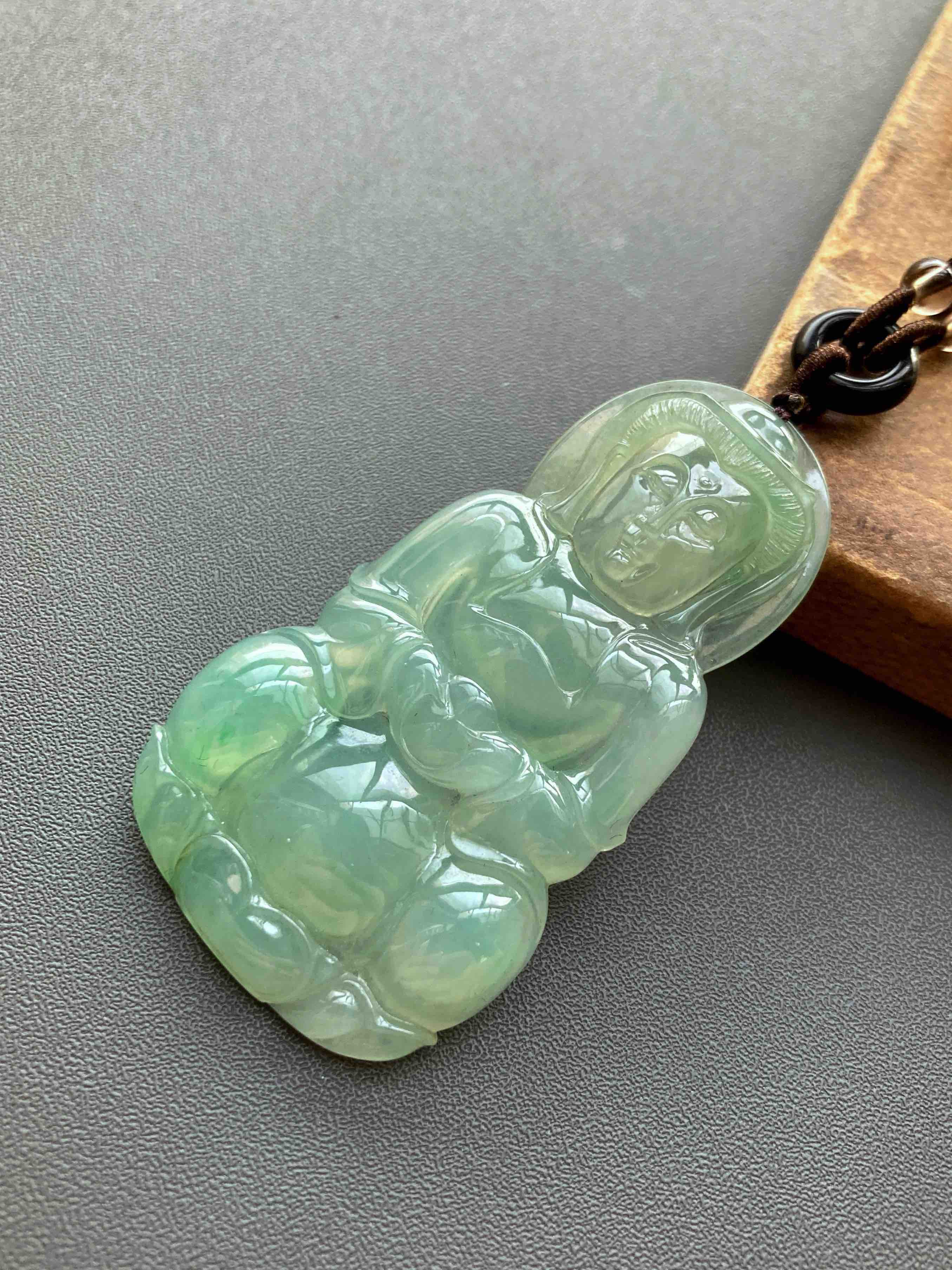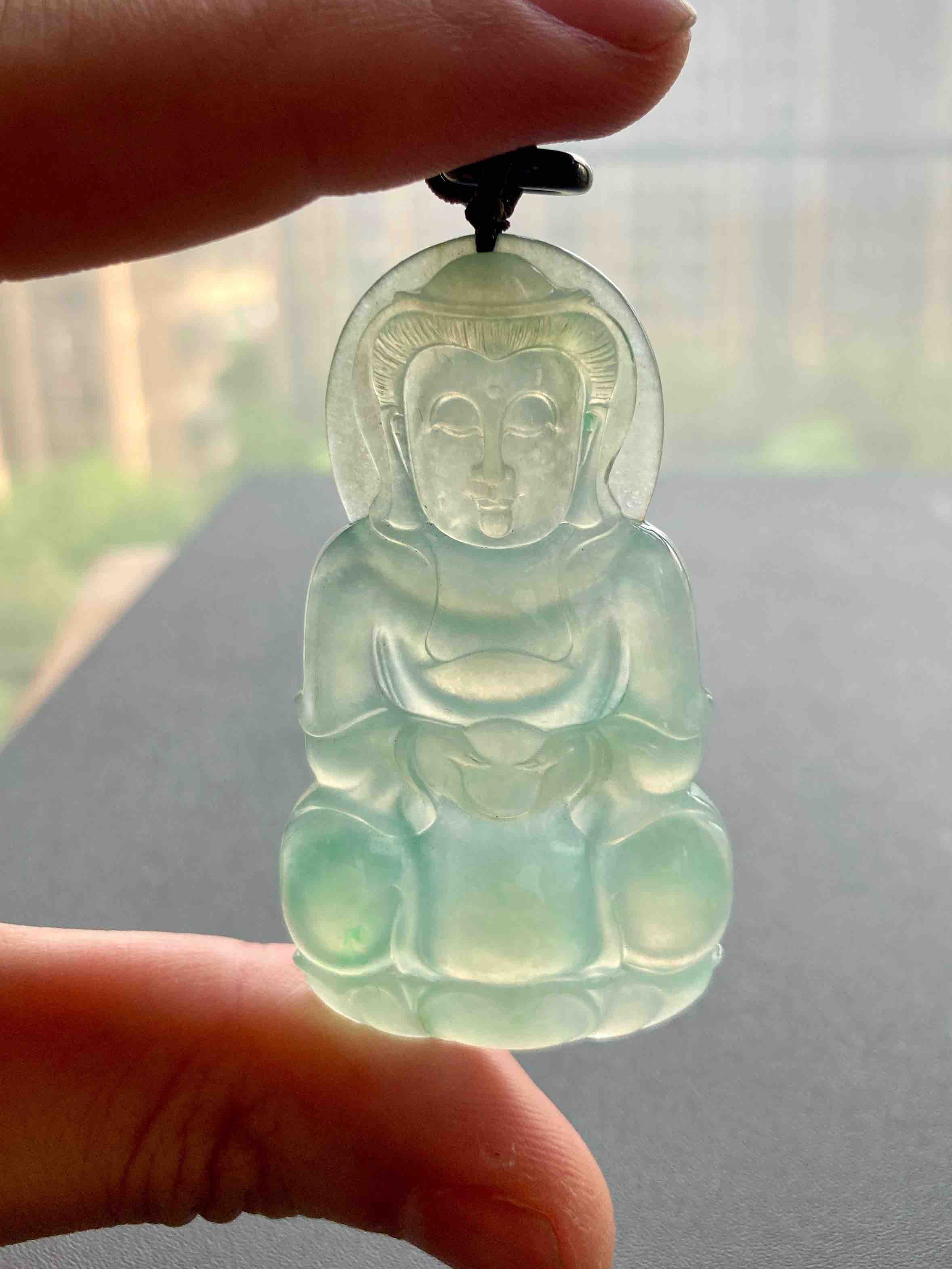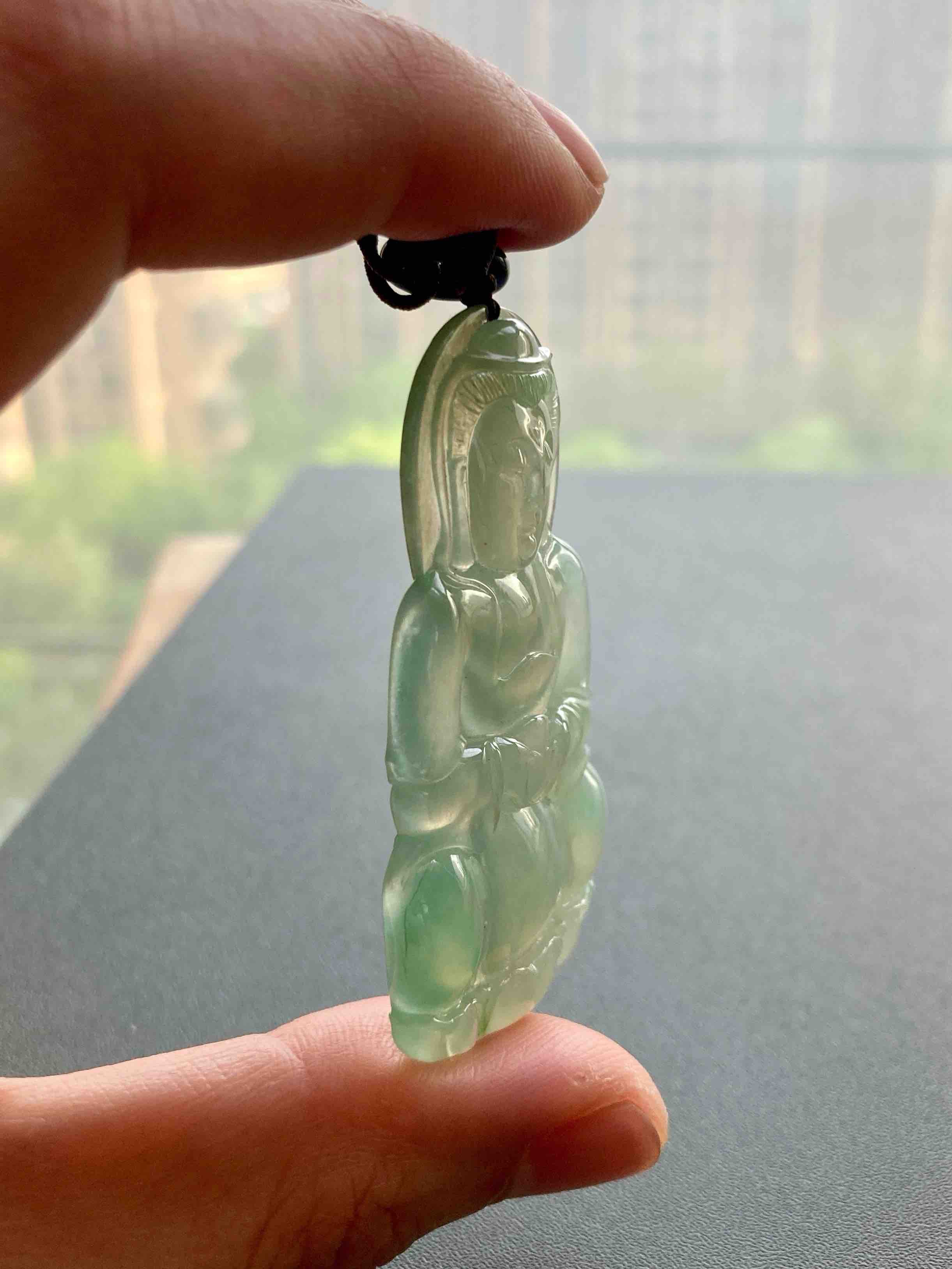 冰种淡晴水飘阳绿翡翠大观音,正装尺寸的大观音,56.7×31.2×6mm,不是网上那些玩闹性质的大路货,这个长度过50,种水晶莹剔透,丝绸般柔滑的质感,纯手工精雕细刻,从雕工到种水样样好,男士佩戴,保平安,冰种淡晴水,飘阳绿,优雅大气的气质