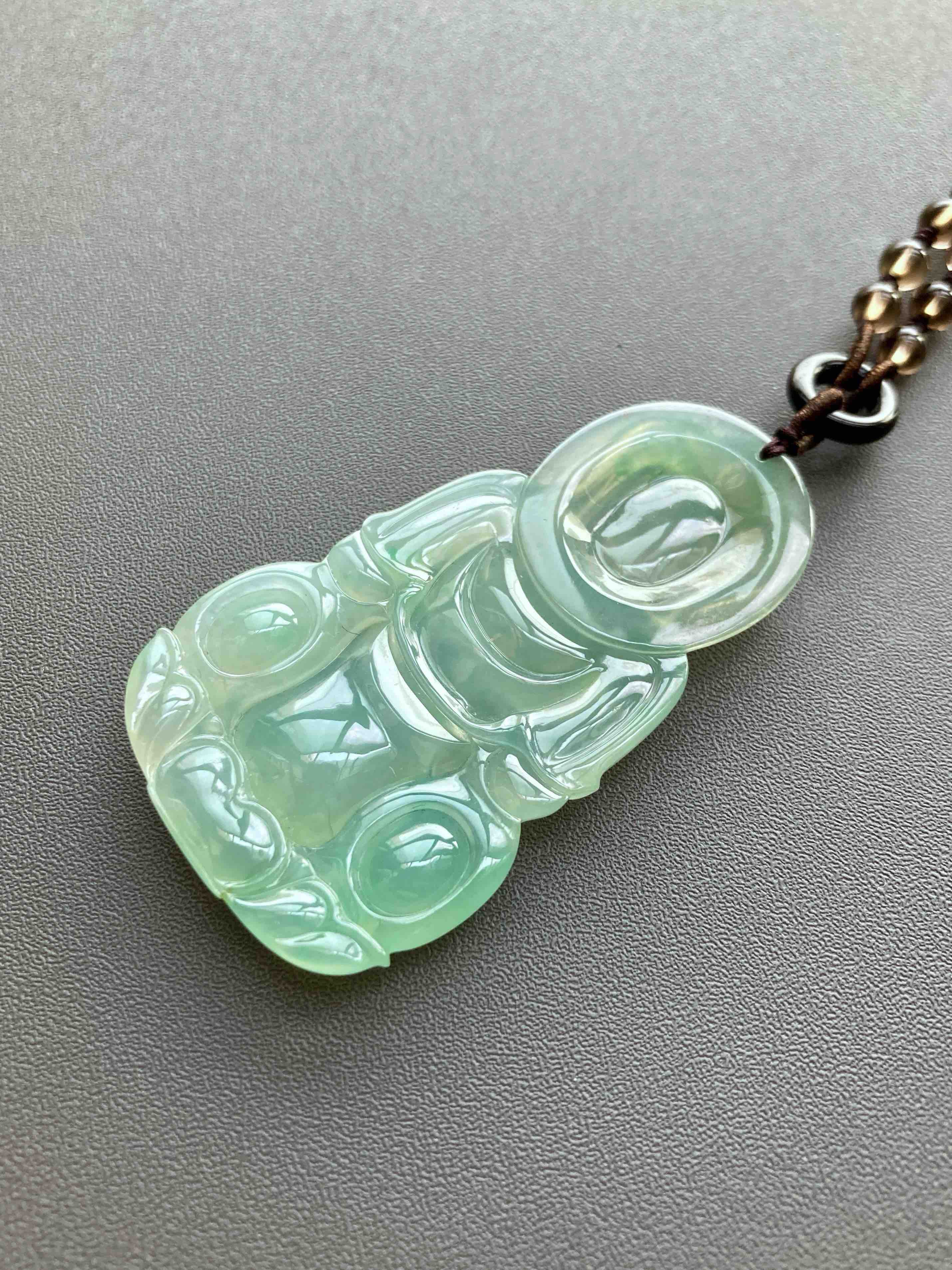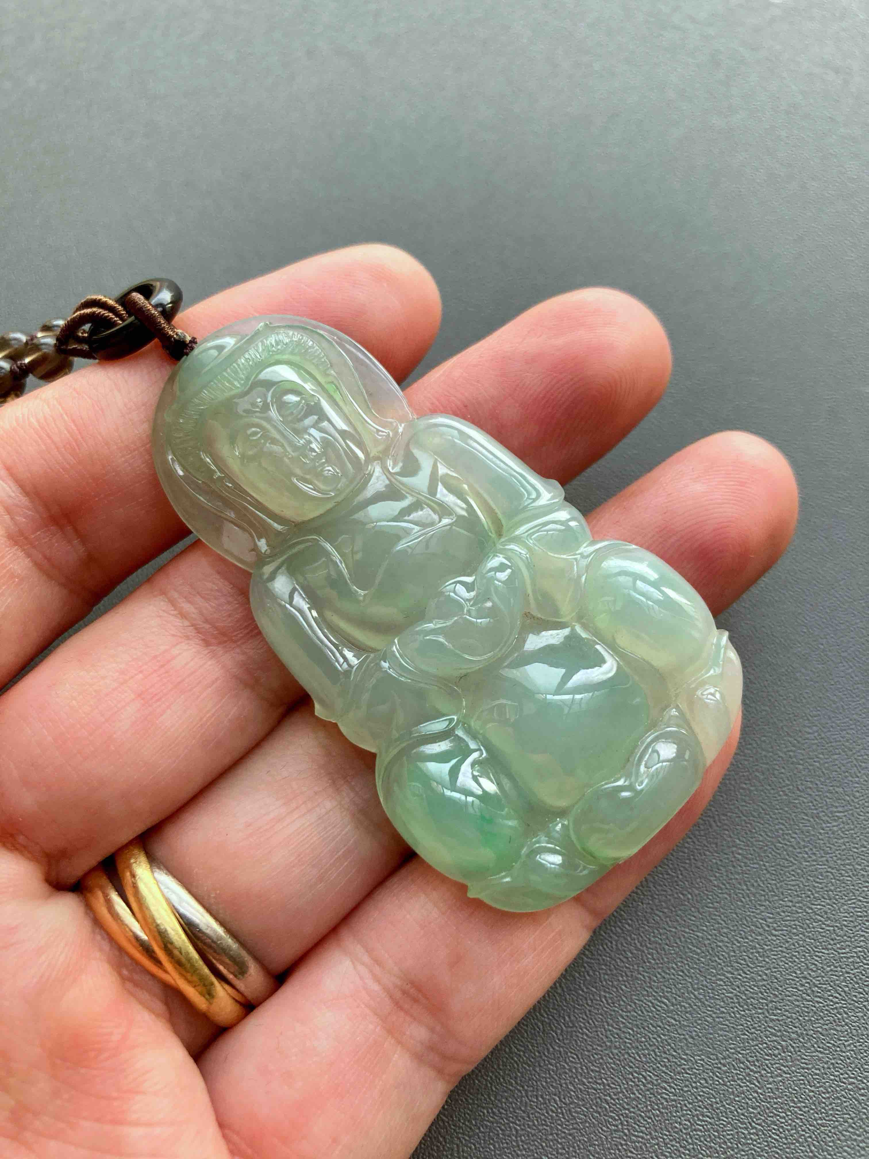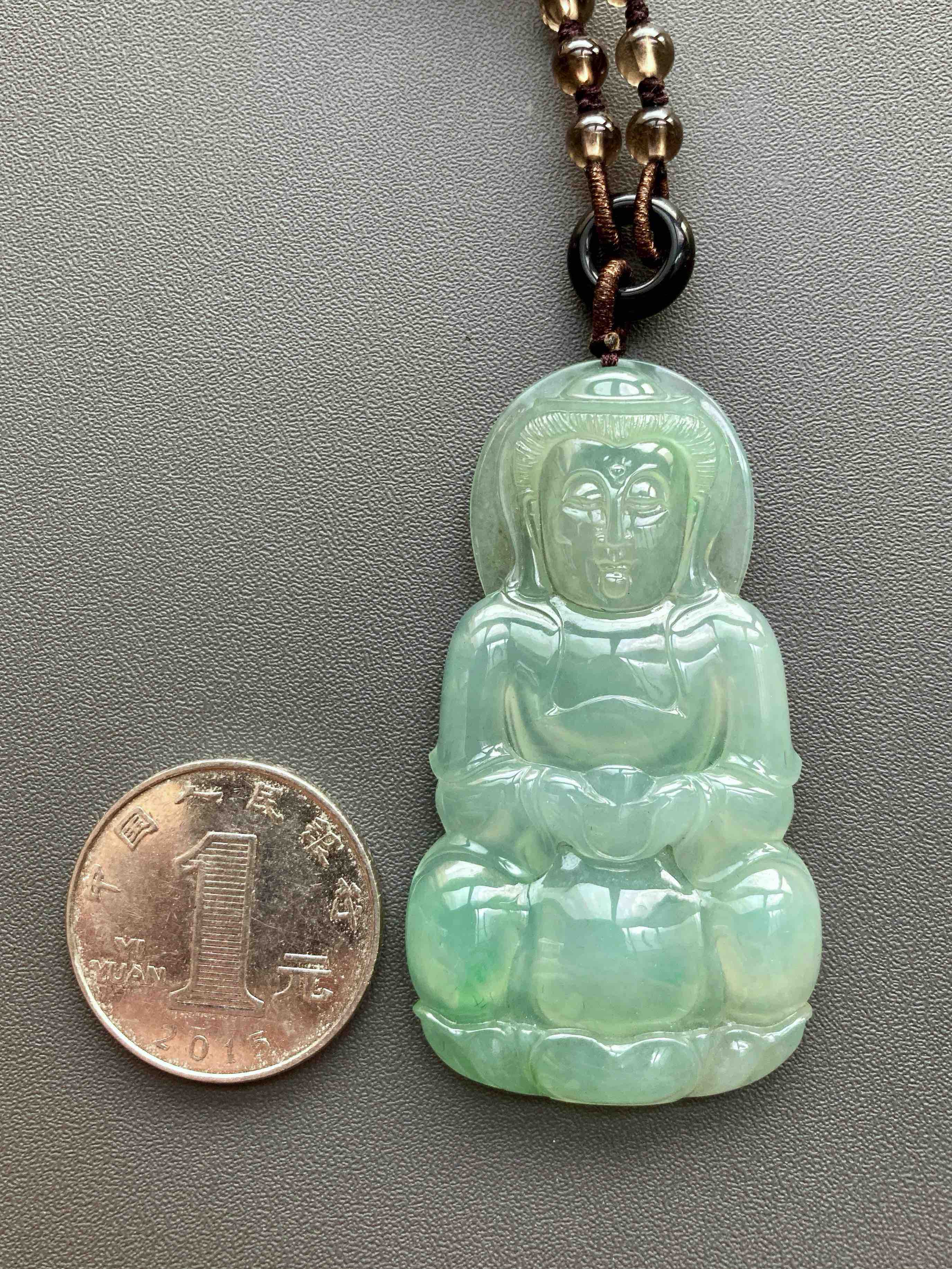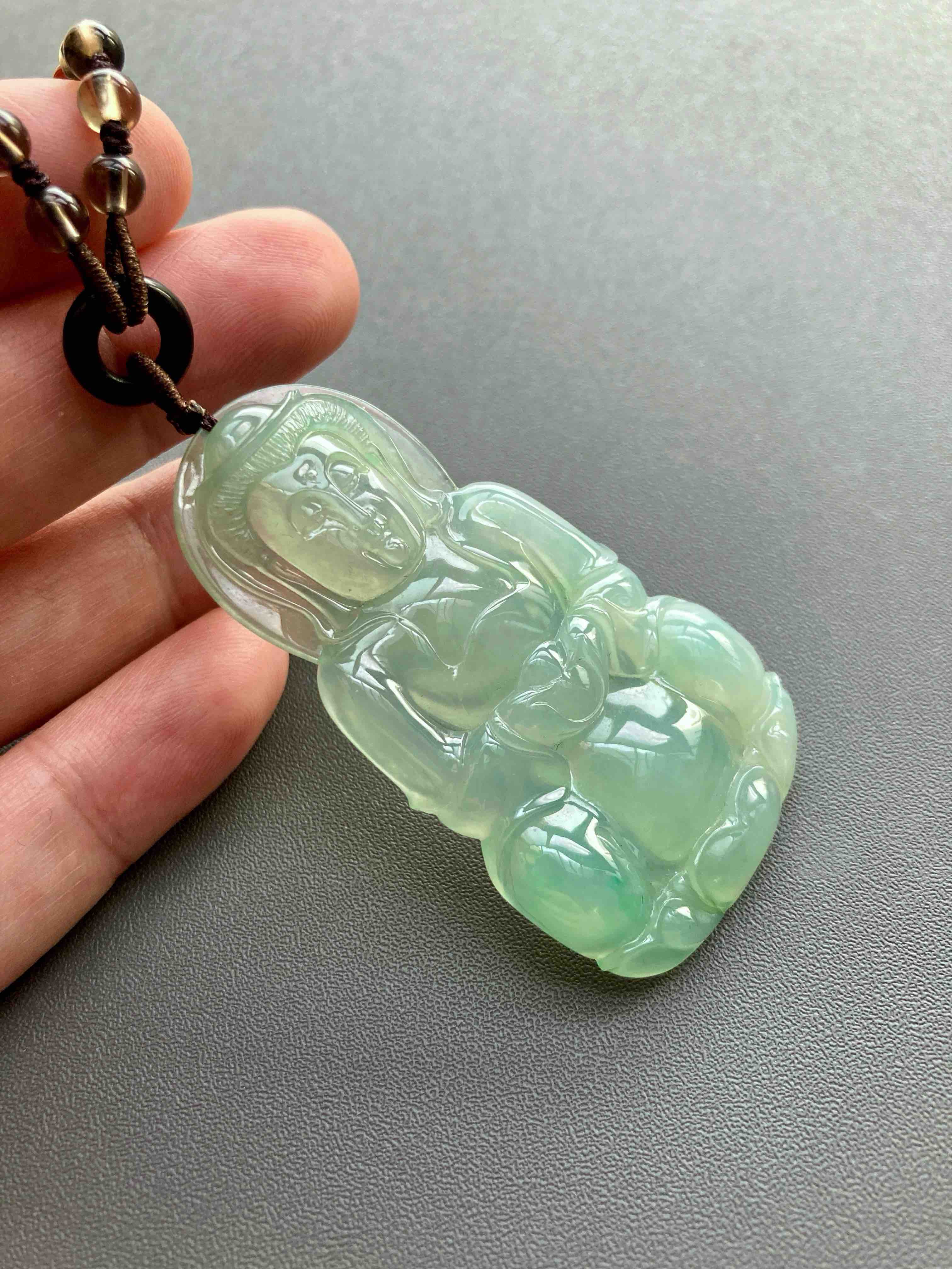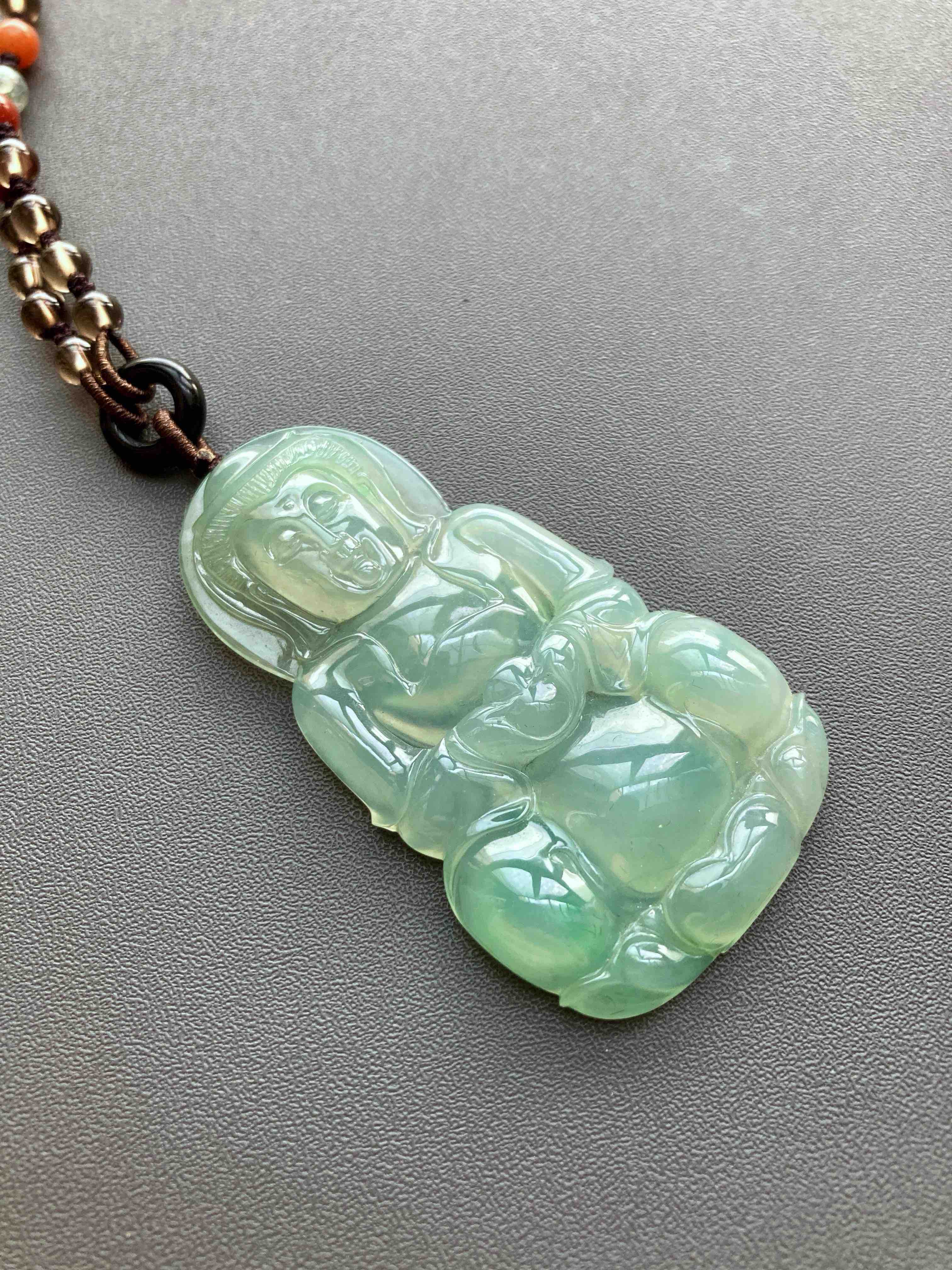 冰种淡晴水飘阳绿翡翠大观音,正装尺寸的大观音,56.7×31.2×6mm,不是网上那些玩闹性质的大路货,这个长度过50,种水晶莹剔透,丝绸般柔滑的质感,纯手工精雕细刻,从雕工到种水样样好,男士佩戴,保平安,冰种淡晴水,飘阳绿,优雅大气的气质