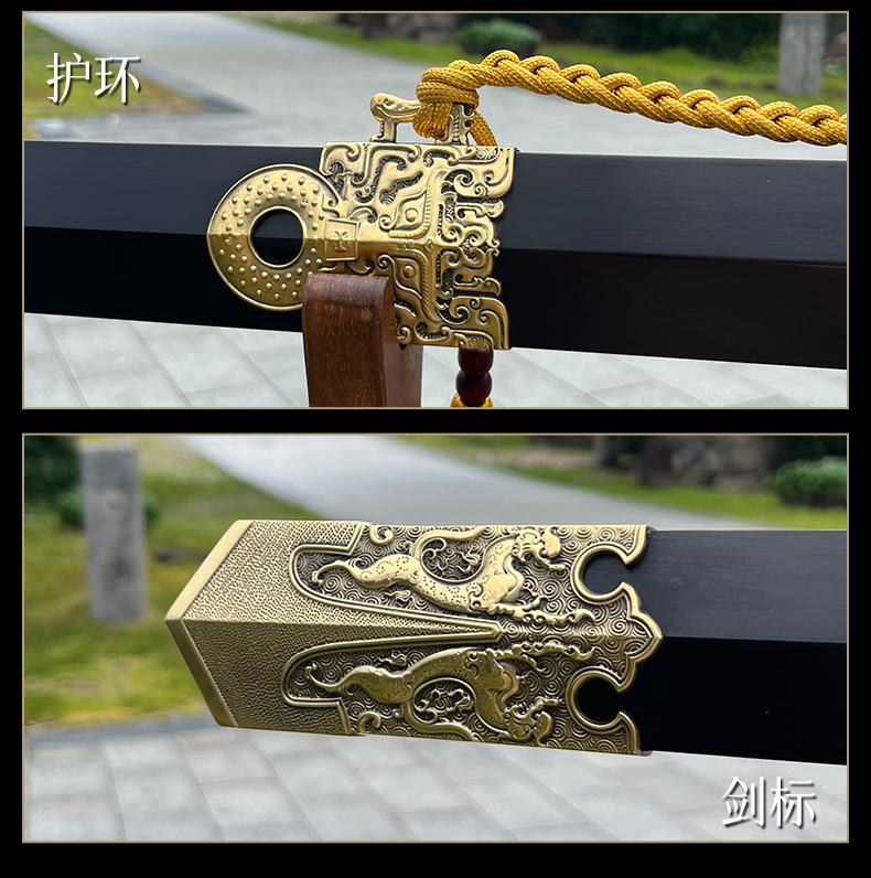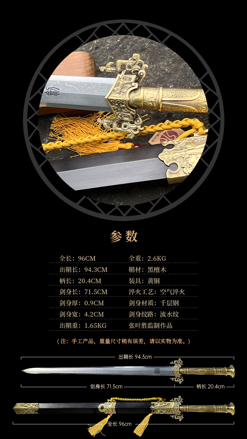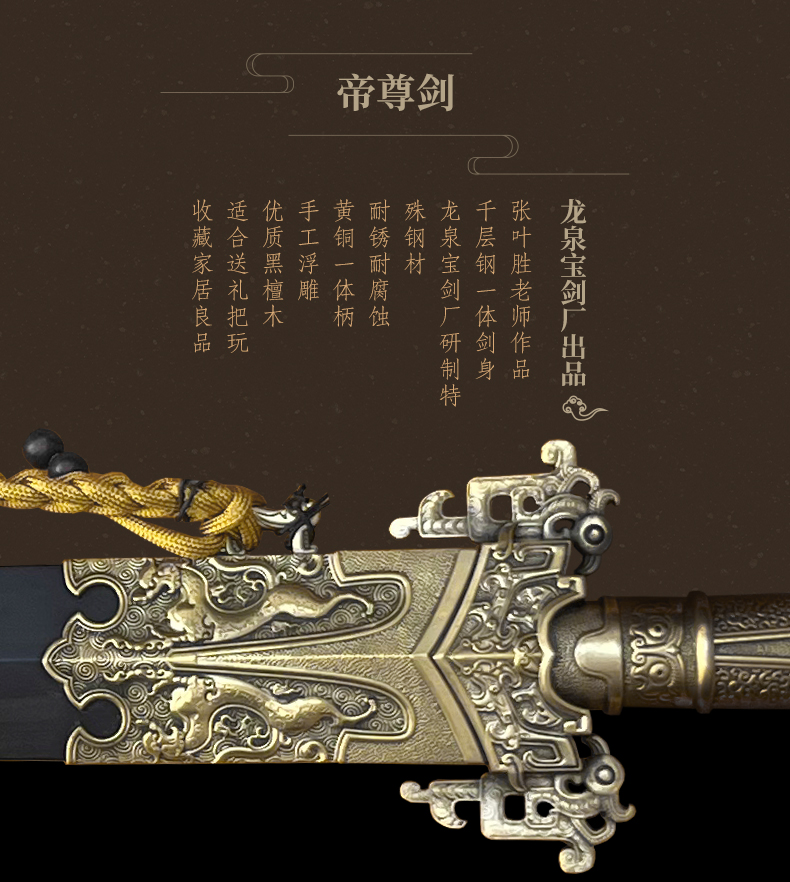 青龙清剑 ▏ 张叶胜大师监制 纯铜手雕黄铜剑装 名贵黑檀木鞘 百炼花纹钢剑刃(未开刃)