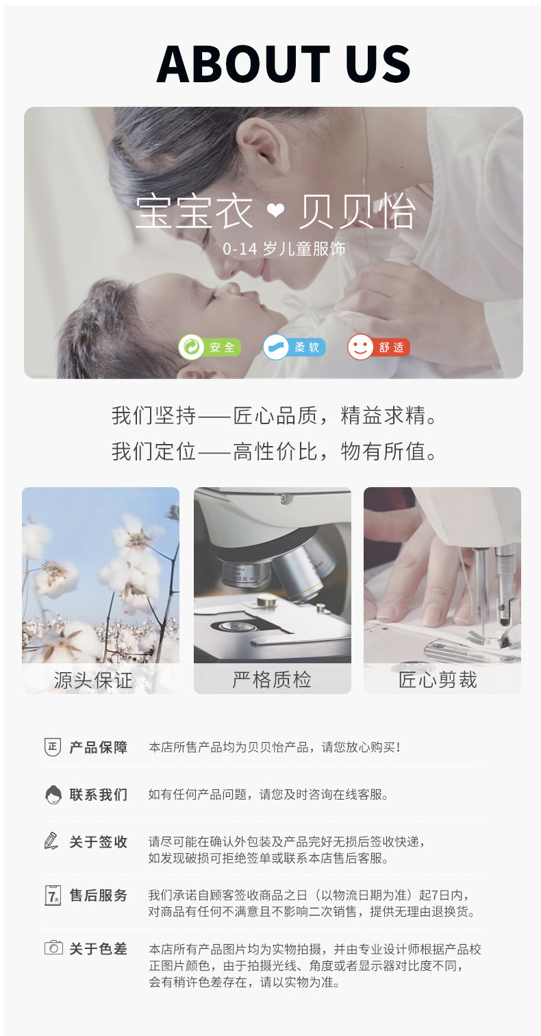 - 贝贝怡专注0-6岁婴幼儿服饰,坚持安全、柔软、舒适的产品理念,为千万中国家庭提供超高品质、安全可靠的婴幼儿服饰产品,妈妈放心,宝宝开心!