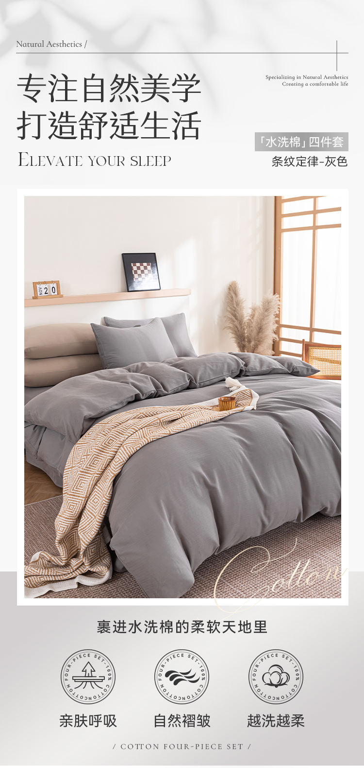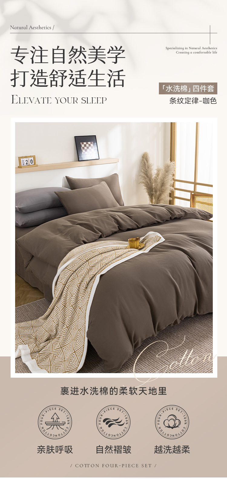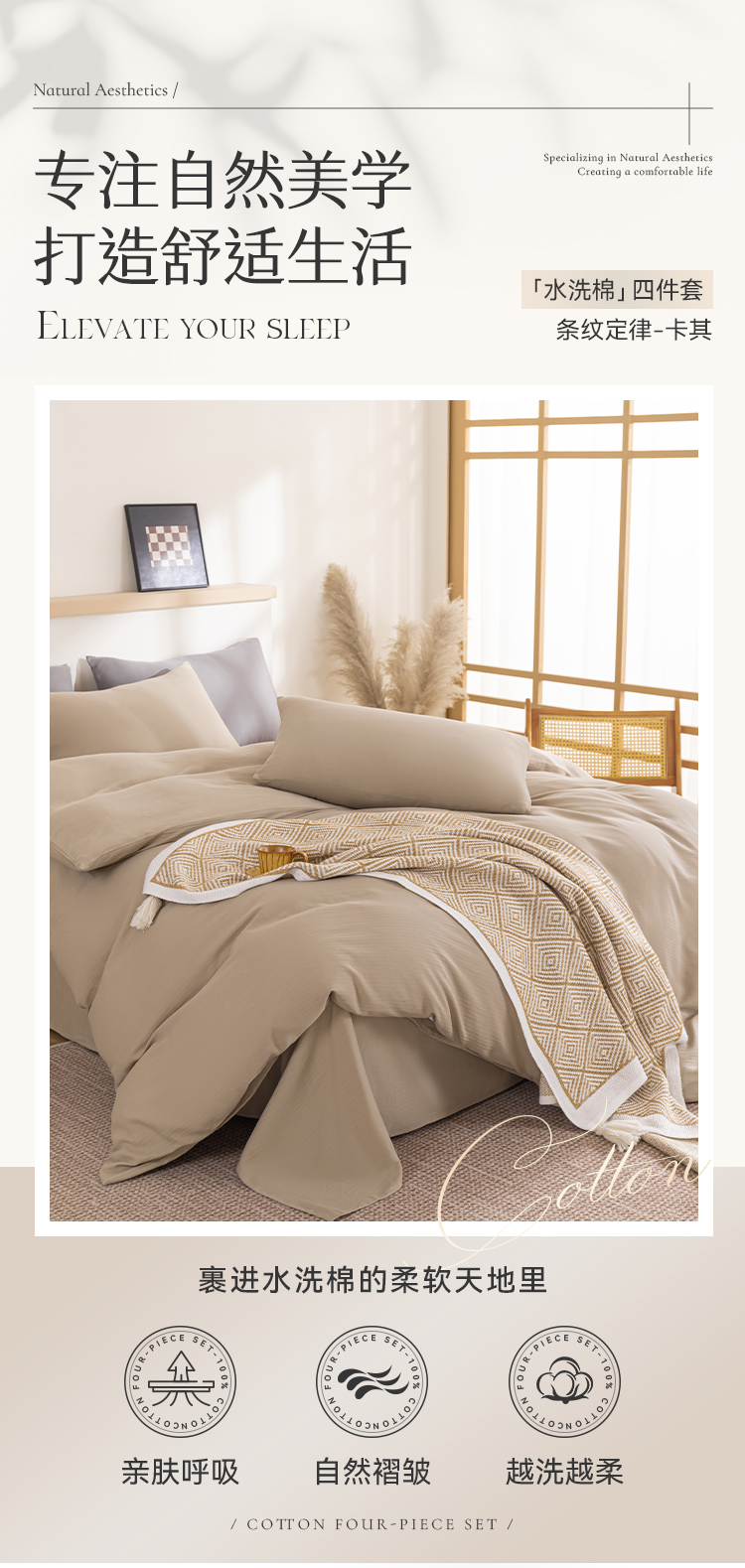 多喜爱 100%全棉简约素色系水洗棉套件 四件套 条纹定律(卡其、咖、灰)【亲肤呼吸】【越洗越柔】