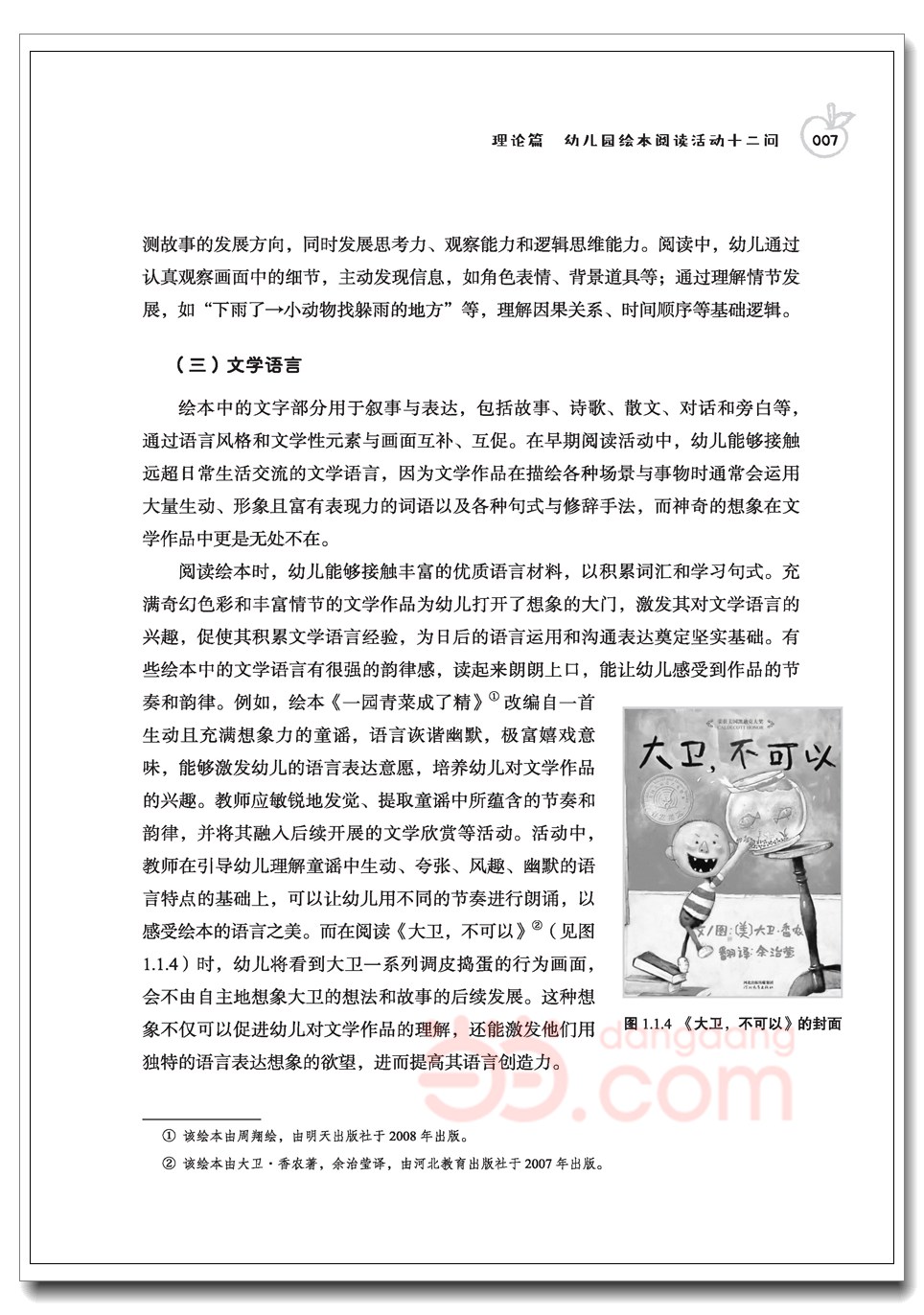 一、关注绘本中的;三种语言对于绘本中的;三种语言,即美术语言、教育语言和文学语言,很多幼儿园教师可能感到陌生。其中,美术语言是;视觉主角,教育语言是;内核目的,而文学语言是;叙述桥梁,三者相互融合,共同促进幼儿理解图书内容。教师在为幼儿选择绘本时应综合考虑绘本中的这三种语言,并根据幼儿的年龄特点、发展需求和教育目标选择;语言丰富的绘本。(一)美术语言美术语?是指绘本中的图画、色彩和版面设计,即绘本所呈现的画面内容,它们共同构成了绘本的视觉美感。以图为主的绘本主要用画面传递信息,通过绘画技法、色彩、构图和造型等视觉元素来传递内容,因此其画面是绘本的;核心叙事载体。优质的绘本往往拥有精美的插图与和谐的色彩搭配,能有效吸引幼儿的注意力,激发他们的阅读兴趣。此外,版面设计的合理性也是美术语言的重要组成部分,它影响幼儿对绘本内容的理解和接受程度。具体而言,绘本中的画面有以下作用。1.丰富幼儿的审美体验优秀的绘本,其画面往往精美细致、色彩搭配和谐、构图巧妙且富有创意、角色造型生动有趣。这些画面不仅能吸引幼儿,还能传递信息,帮助幼儿更好地理解故事内容,促进其审美能力和想象力的发展。2.促进幼儿的认知发展一方面,画面通过直观的形象呈现事物的颜色、形状和大小等特征,比如花朵的颜色、动物的形态,帮助幼儿认识自然界的动植物、了解各种生活场景,形成对这些事物的初步印象,积累认知经验;另一方面,;季节;情绪等抽象概念可通过画面具象化,比如用落叶、雪花等元素表现季节变化,便于幼儿理解。3.培养幼儿的想象力与创造力画面留白或富有创意的构图能引发幼儿联想。比如:幼儿想象半隐半现的动物的完整样子或正在做的事情;独特的画面风格、色彩运用等,可能激发幼儿的艺术创作兴趣,使他们愿意尝试用绘画等方式表达自己的想法。由瑞士插画家莫妮克弗利克斯(Monique Felix)创作的以小老鼠为主角的无字书《飞机》(见图1.1.1)是一本可任由幼儿天马行空地驰骋想象的绘本。该绘本没有文字,前几页只有一只在书页间穿梭的小老鼠,没有文字介绍,也没有多余的色彩,你甚至不知道小老鼠在什么地方、要做什么。随着翻开一页页画面,我们发现小老鼠在书页上左找右找,它开始挖呀挖、咬呀咬,当书页的一个角被咬开,小老鼠钻出头时,一个新奇的世界慢慢展开,色彩也逐渐丰富:一个;活色生香的村庄慢慢出现在其脚下。而此时,小老鼠做了一个更大胆的决定:它要用这本书的一页纸做一个纸飞机,并乘着纸飞机向美丽的村庄前进故事全部用图画讲述,未使用一个文字,其神奇的想象令人拍案叫绝。同时,每幅画面都有大量留白,给予幼儿广阔的想象空间,他们可根据画面元素充分构思情节和对话,以发展想象力和语言表达能力。4.提高幼儿的注意力与观察能力幼儿观察画面的细节时,需要集中注意力,这有助于培养幼儿注意力的稳定性。事实上,幼儿的注意力容易分散,有些幼儿经常快速翻阅绘本,有时一两分钟就翻完一本书,因此很少关注画面的细节。教师在阅读中可通过设定观察任务来引导幼儿有意识地观察,比如寻找画面中隐藏的小物件、观察画面中事物的差异和变化,以及比较不同画面中角色的服装变化。英国插画家佩特哈群斯(Pat Hutchins)的作品《母鸡萝丝去散步》(见图1.1.2),其画面经过精心雕琢,色彩丰富,有极强的视觉冲击力;美术语言非常丰富,充满了幽默和哲理。其中,母鸡的身体是鲜艳的大红色,尾巴近似扇形、整整齐齐,上面还有条理分明的花纹;无论是柳树枝、苹果树、梨子树还是房屋、蜜蜂房,其上面的树叶、果子和装饰图案都是整齐排序的,给人以独特的视觉韵律。(二)教育语言教育语言是指绘本所隐含的,旨在促进幼儿认知、情感、社会性以及行为习惯发展的功能性内涵。好的绘本不仅要有引人入胜的故事情节,还应蕴含深刻的教育意义。绘本往往通过故事主题和情节传递认知、习惯与规则、情感与社会性等教育信息,具有多方面的教育价值。这些教育信息和内涵(教育语言)往往是幼儿园教师很重视的一个方面。通过绘本,幼儿可以学习用于与人相处、面对困难等情境的生活技能。这些教育语言对于幼儿的成长和发展具有不可替代的作用,具体如下文所示。1.支持幼儿体验多元的情感与社交规则许多绘本通过温馨、感人的故事或散文诗歌传递爱与关怀等美好情感,引导幼儿通过理解角色的情感,识别角色的喜、怒、哀、乐,产生情感共鸣,从而获得积极向上的情感体验,形成良好的品德。例如:《猜猜我有多爱你》通过温暖、治愈的亲子对话,用比喻表达爱的深度,传递亲情与安全感;《爷爷一定有办法》则透过爷爷对旧物的不断改造,展现物尽其用的智慧以及祖孙之间的温情。《你睡不着吗?》(见图1.1.3)是一本以爱为主题的温馨绘本。就像年幼的孩子一样,故事中的小熊害怕黑暗,晚上睡不着觉。于是,在小熊睡觉前,大熊以无限的爱、不厌其烦地做了很多事情:先给小熊提来小灯笼,然后提来大一点的灯笼,之后又提来最大的灯笼,可是每一次小熊都还是害怕。最后,大熊只好把小熊抱到室外。故事的结局是,小熊在大熊温暖而安全的怀抱中睡着了。小熊和大熊像孩子生活中的谁和谁呢?是孩子和妈妈?还是孩子和爸爸?抑或是孩子和爷爷奶奶?孩子们看到这本