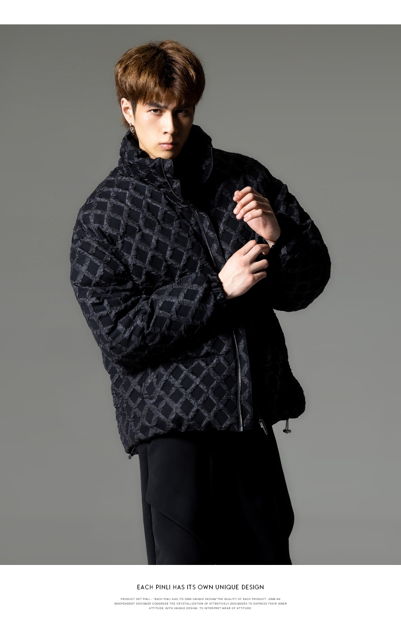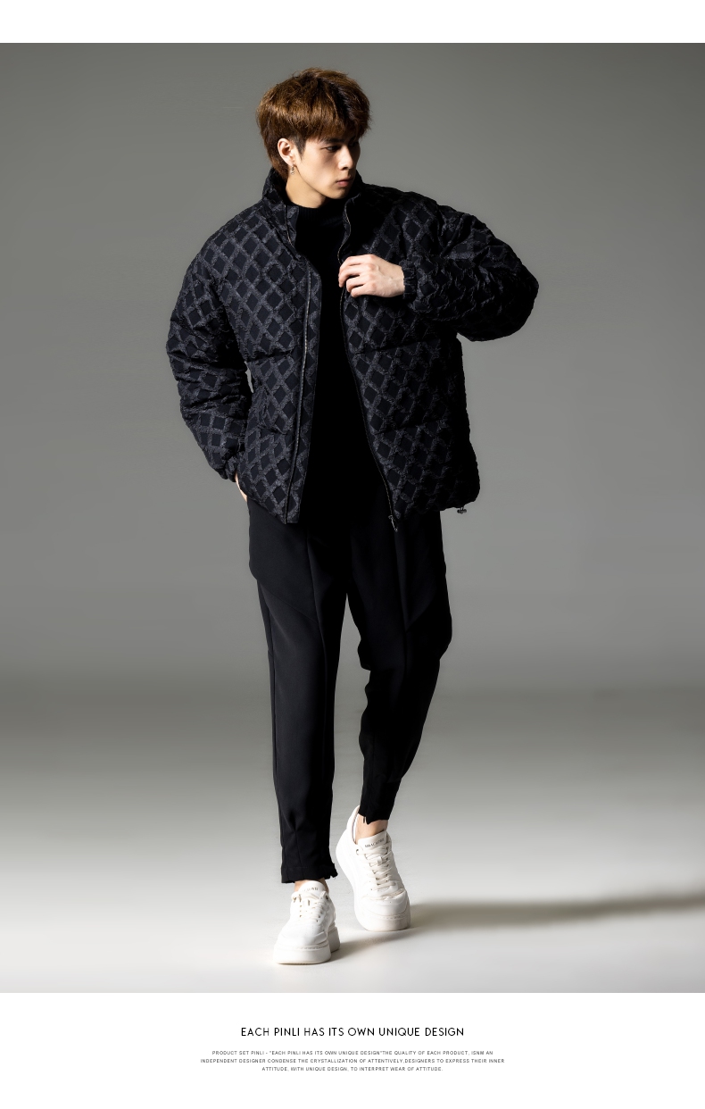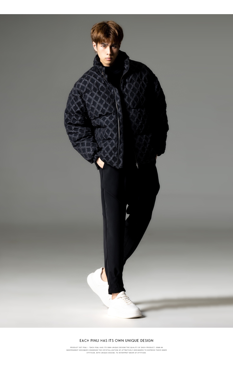 PINLI品立秋冬新品华夫格立领羽绒服潮牌短款加厚面包服外套B233208089