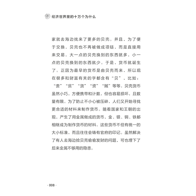 可是,因为集市上货物多项链少,于是大家就去海边找来了更多的贝壳。并且,为了便于交换,贝壳也不再被做成项链,而是直接用来交易。大一点的贝壳换到的东西就多,小一点的贝壳换到的东西就少。于是,货币就诞生了。正因为早的货币是由贝壳而来,所以现在很多和财富有关的字都含有;贝rdquo;,比如:;贵rdquo;;贫rdquo;;货rdquo;;资rdquo;;贼rdquo;等等。贝壳货币虽然小巧,方便携带和计数,但也容易损坏,且数量有限。为了防止不小心被压碎,人们又开始寻找更合适的材料来制作货币。随着国家和王朝的出现,产生了用金属做成的货币,金、银、铜、铁都相继成为了制作货币的材料。这些货币不但有统一的大小标准,而且往往会铸有官府的印记。虽然解决了有人去海边捡贝壳偷偷发财的问题,可也埋下了后来金属不够用的隐患。