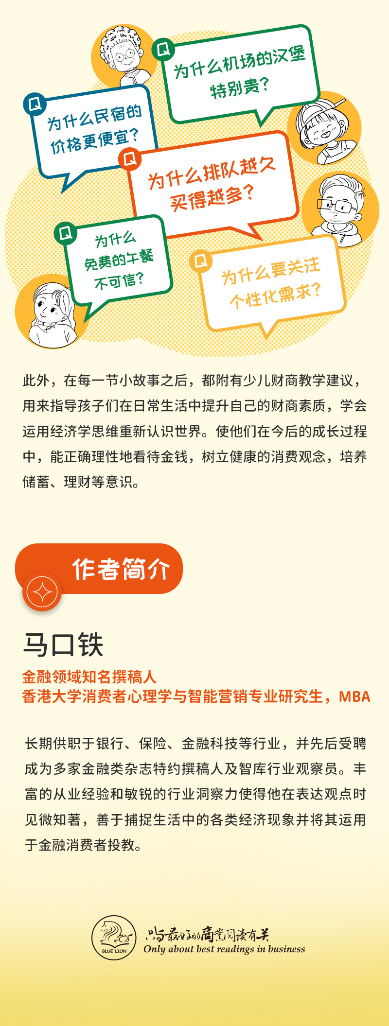 2.少儿财商教育有市场潜力:当下少儿商赛等注重孩子财商素质培养的活动越来越热门,让孩子的财、智、情三商均衡发展也越来越重要。本书内容可以帮助孩子了解基础的经济学概念,并树立正确的金钱观和健康的消费观。