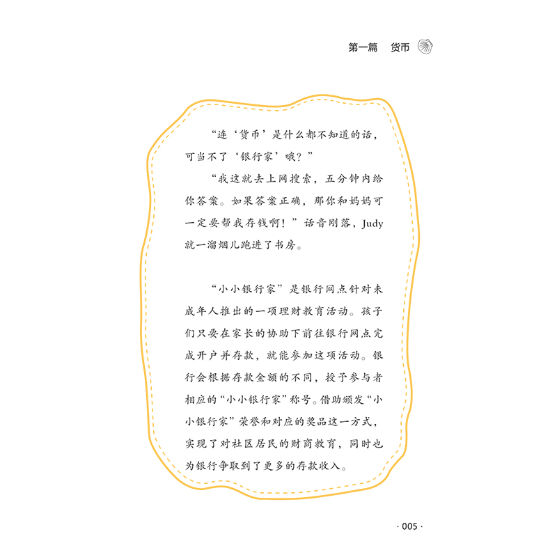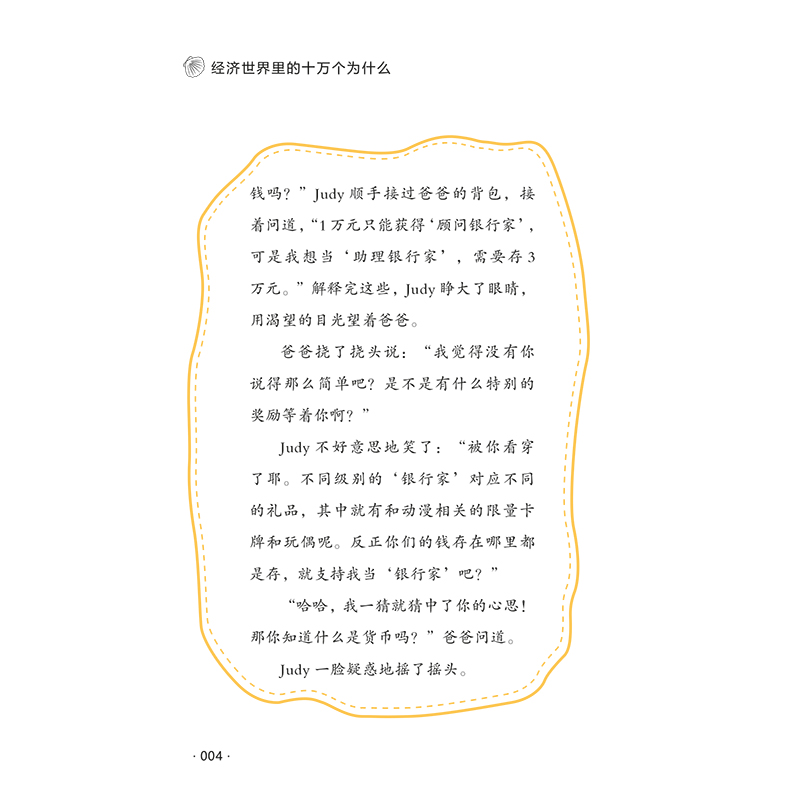 ;可是hellip;hellip;爸爸,我们能多存一点钱吗?rdquo;Judy顺手接过爸爸的背包,接着问道,;1万元只能获得lsquo;顾问银行家rsquo;,可是我想当lsquo;助理银行家rsquo;,需要存3万元。rdquo;解释完这些,Judy睁大了眼睛,用渴望的目光望着爸爸。