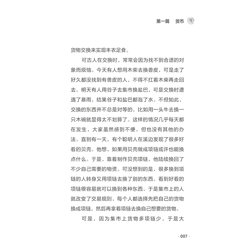 可古人在交换时,常常会因为找不到合适的对象而烦恼。今天有人想用木柴去换兽皮,可是走了好久都没找到有兽皮的人,不得不扛着木柴再走回去。明天有人用谷子去集市换盐巴,可是交换时遭遇了暴雨,结果谷子和盐巴都泡了水。不但如此,交换的东西并不总是对等的,比如用一头牛去换一只木碗就显得太不划算了。这样的情况几乎每天都在发生,大家虽然感到不便,但也没有其他的办法。直到有一天,有个聪明人在溪边发现了很多好看的贝壳。他想,如果用贝壳做成项链或许也能换点什么。于是,靠着制作贝壳项链,他陆续换回了不少自己需要的物资。可没想到的是,很多换到项链的人转身又用项链去换了别的东西。看到好看的项链很容易就可以换到各种东西,于是集市上的人就改变了交易规则,每个人都选择先把自己的货物换成项链,然后再拿着项链去换自己想要的货物。
