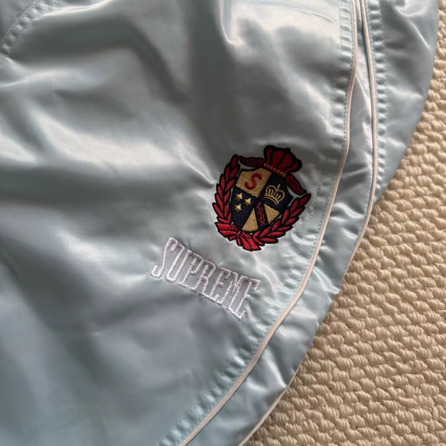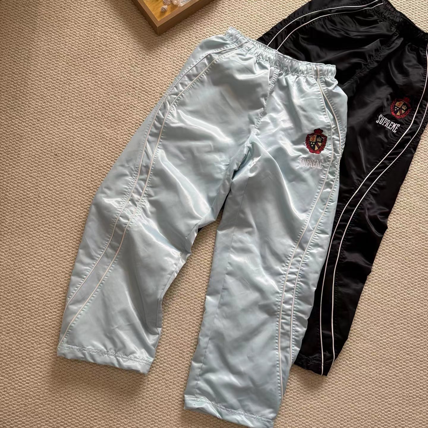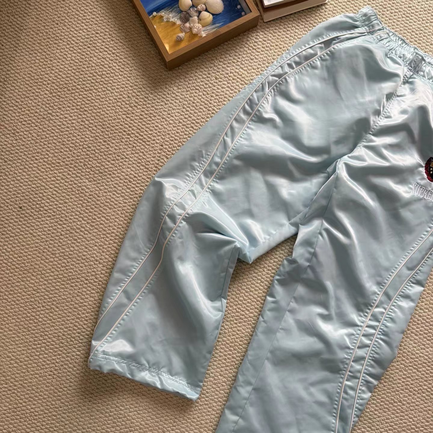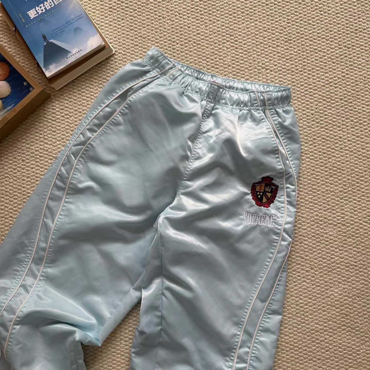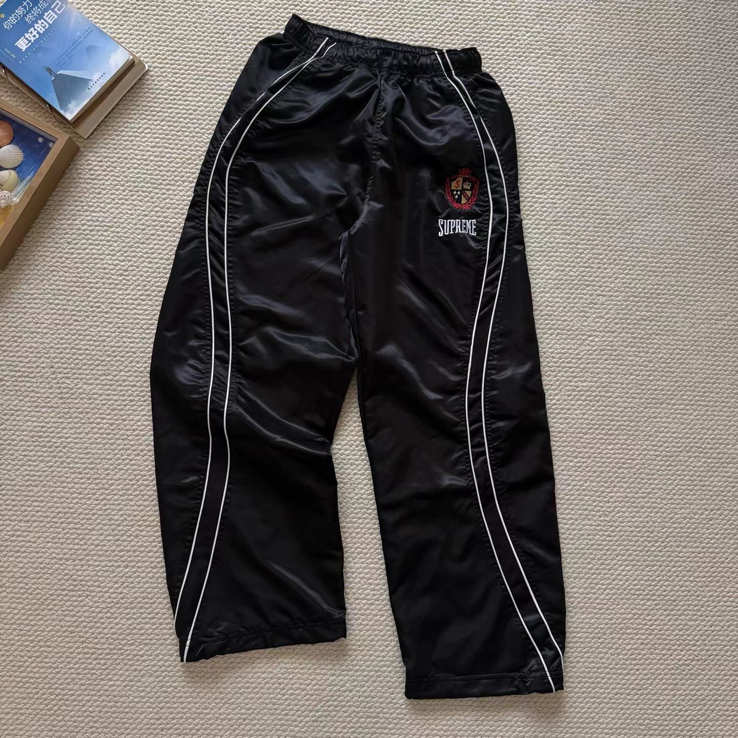 美式潮流缎面贴片logo针织运动裤 男女同款学院风刺绣运动裤,尼龙缎面材质轻便透气,日常或运动都OK!宽松八分裤型+白色条纹,复古又潮流。左腿学院风刺绣超有辨识度,细节满分。松紧腰设计,穿脱方便,舒适度在线~