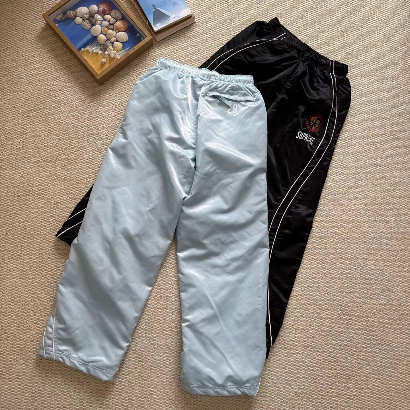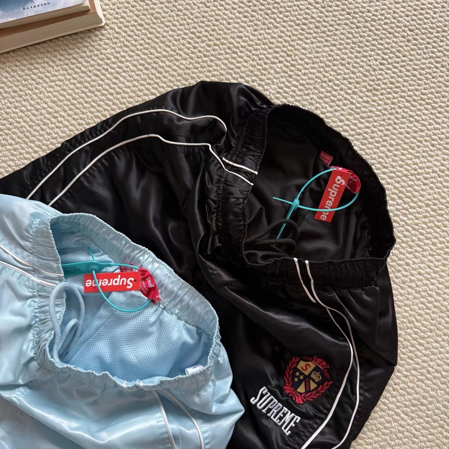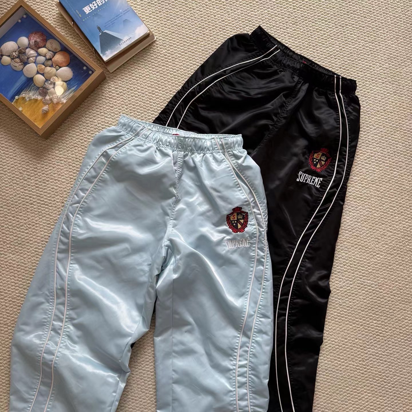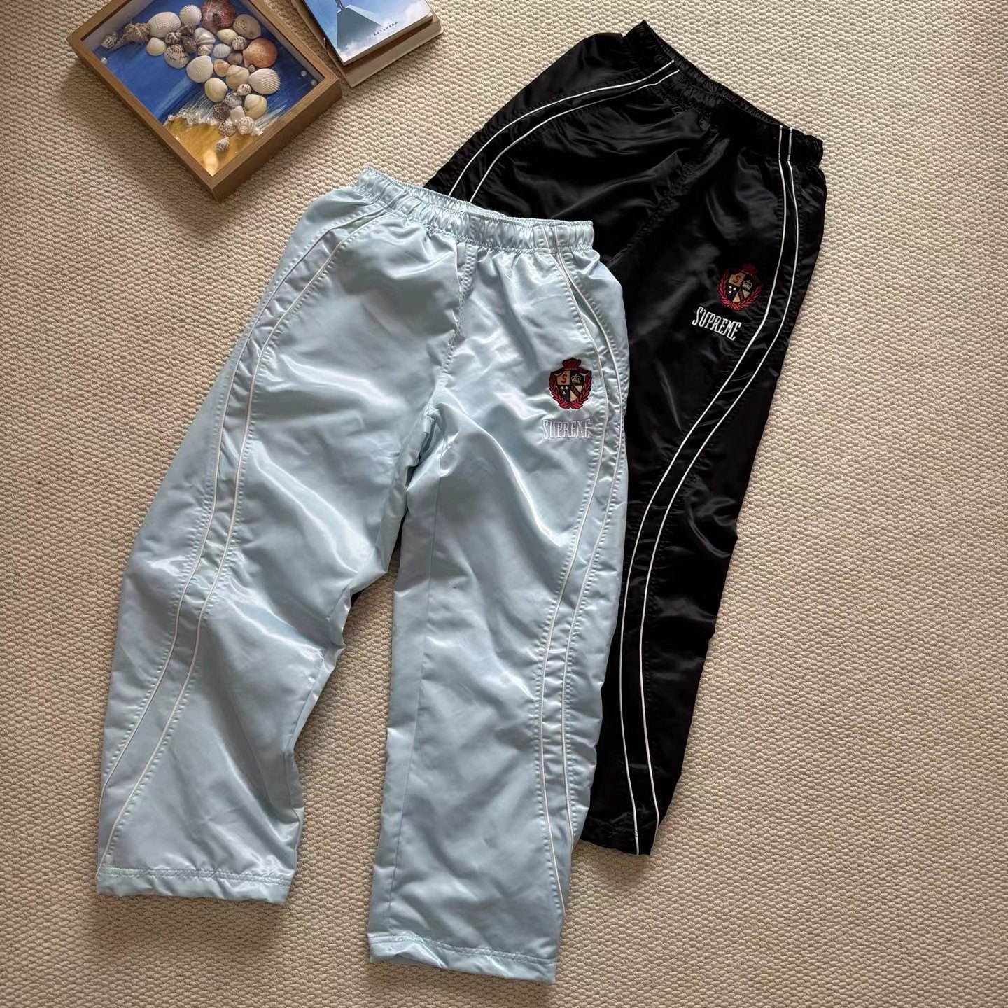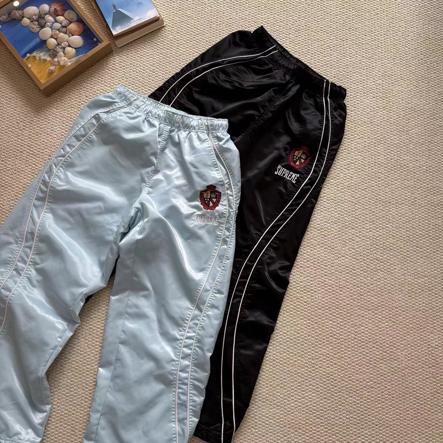 美式潮流缎面贴片logo针织运动裤 男女同款学院风刺绣运动裤,尼龙缎面材质轻便透气,日常或运动都OK!宽松八分裤型+白色条纹,复古又潮流。左腿学院风刺绣超有辨识度,细节满分。松紧腰设计,穿脱方便,舒适度在线~
