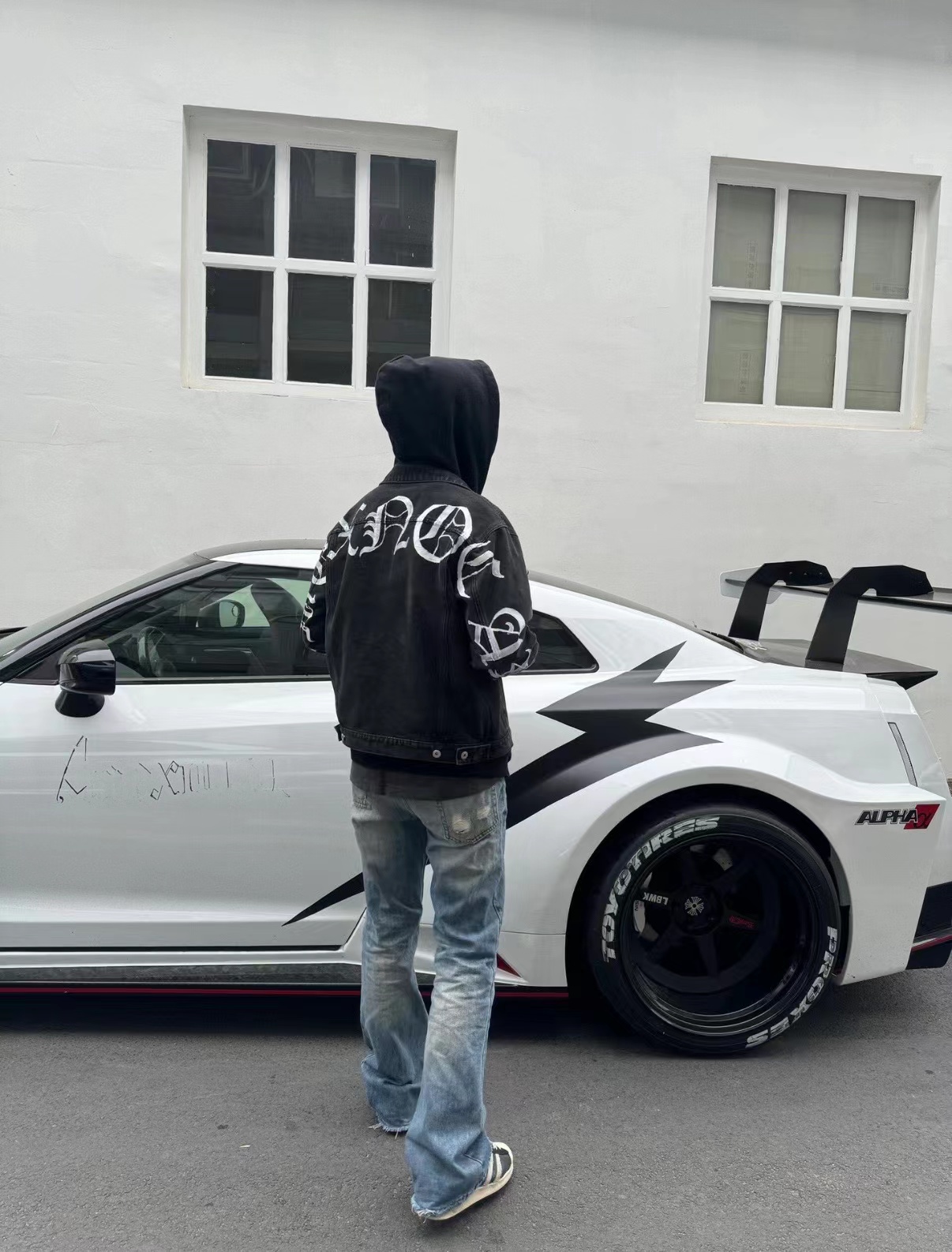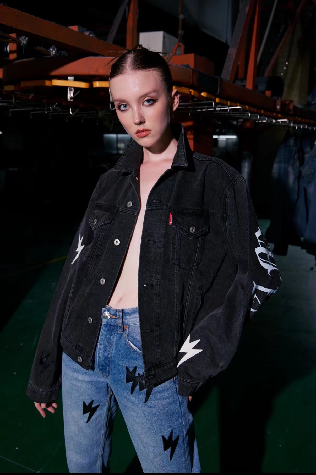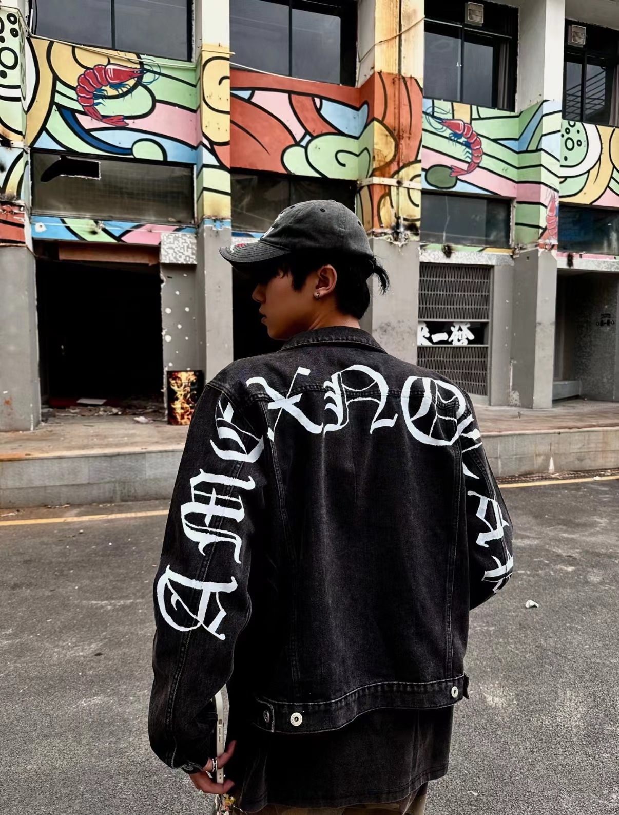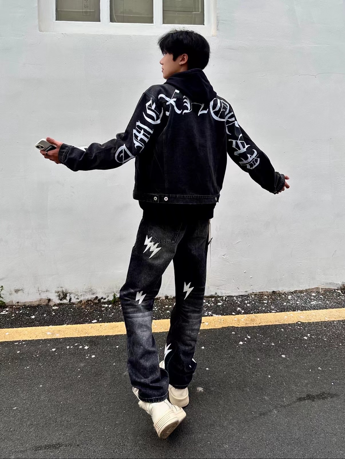 街头涂鸦背后梵文字母水洗牛仔外套!很街头的一件外套,涂鸦闪电牛。秋天牛仔外套真的百穿又不腻!水洗黑做旧复古质感太绝了。衣服上梵文印花?定制闪电皮上身超有质感。简约又不简单的时髦感拿捏住了~天气转凉的秋天穿正正好