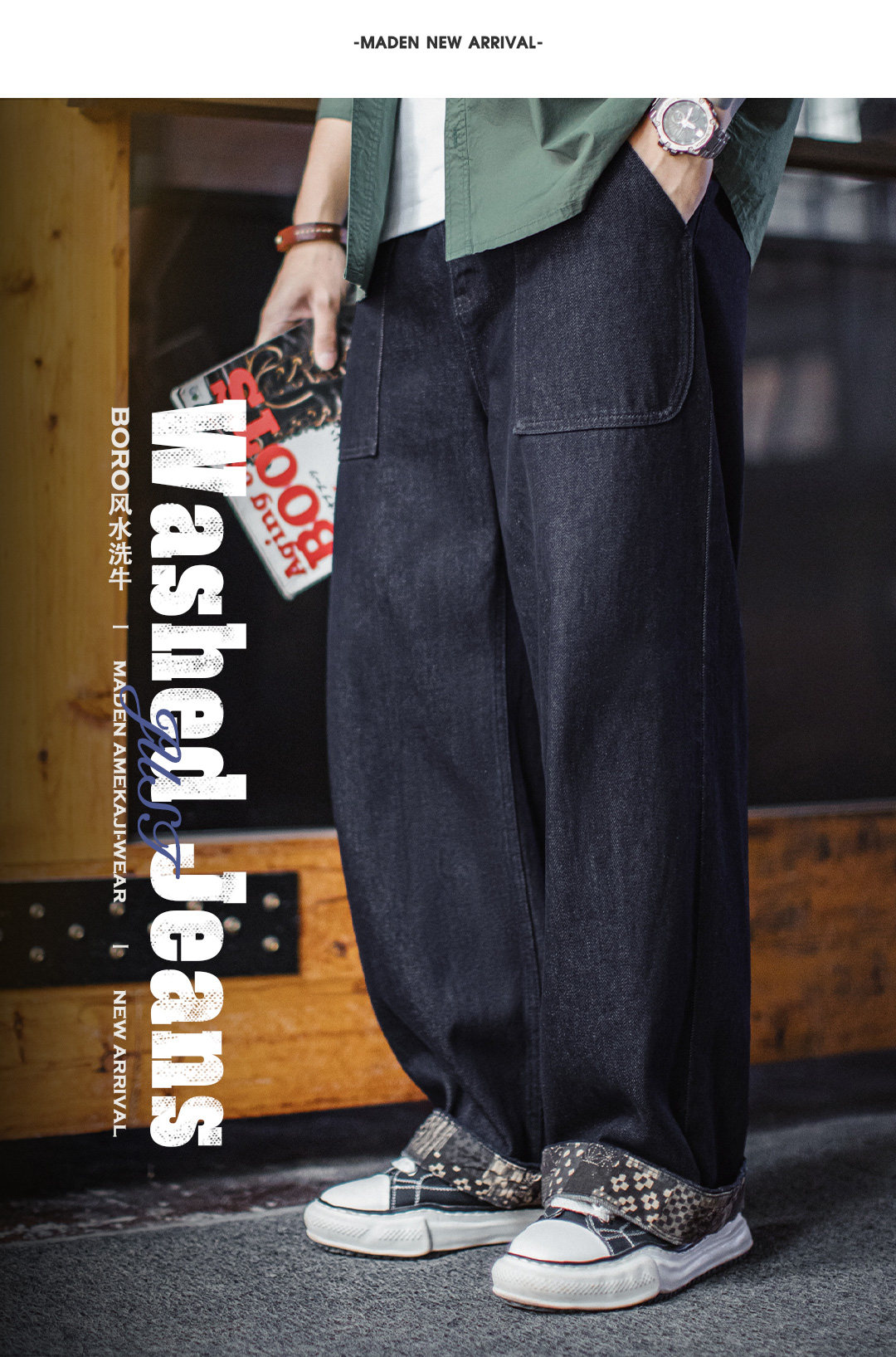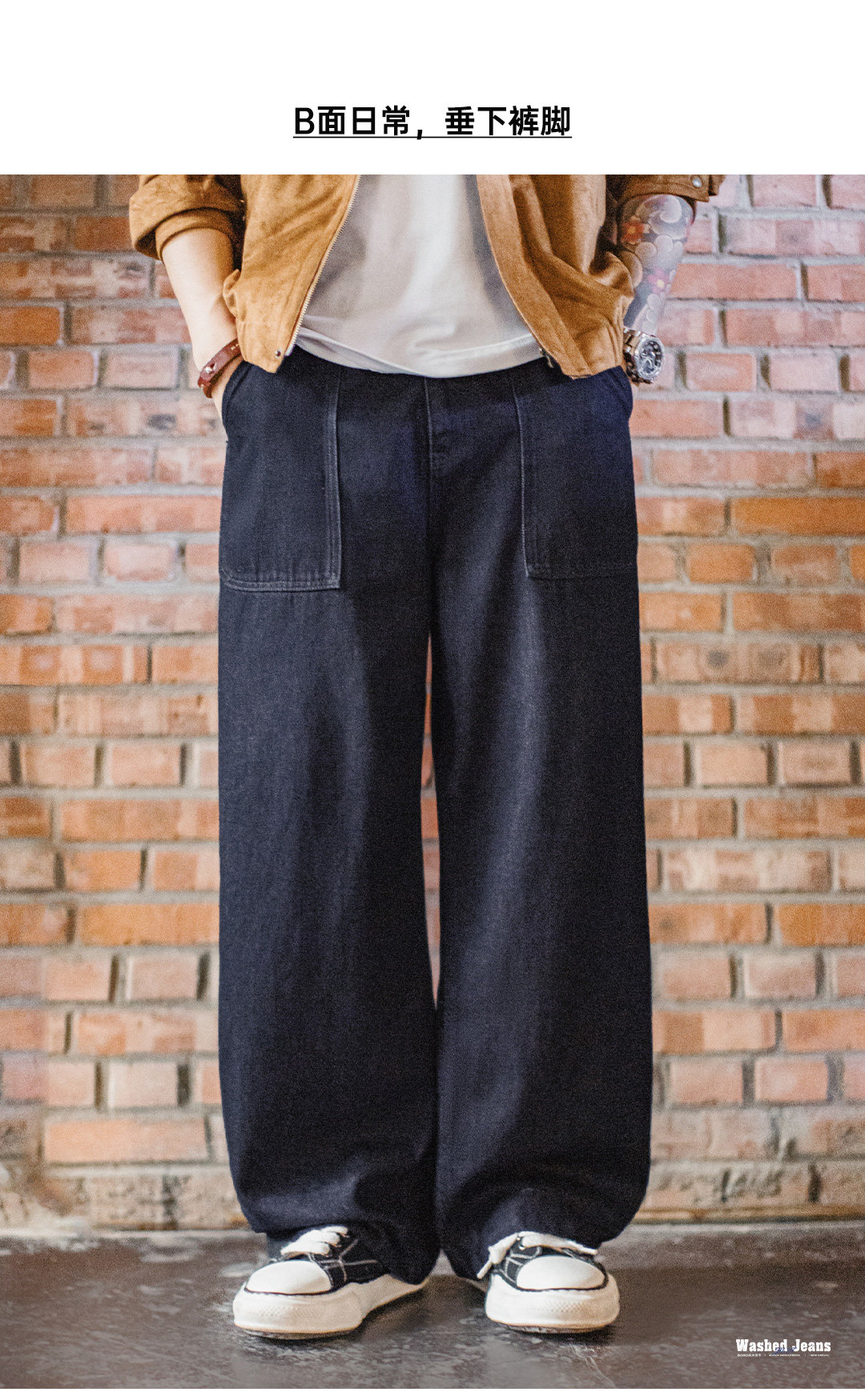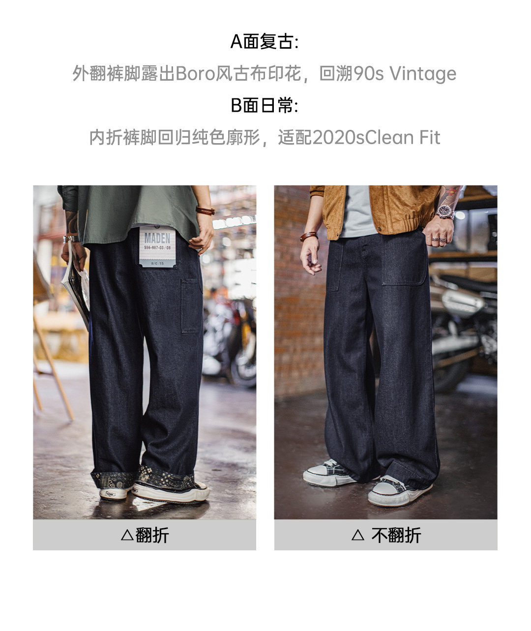 马登工装美式古布水洗牛仔裤直筒BORO阔腿深蓝色宽松休闲裤子男春