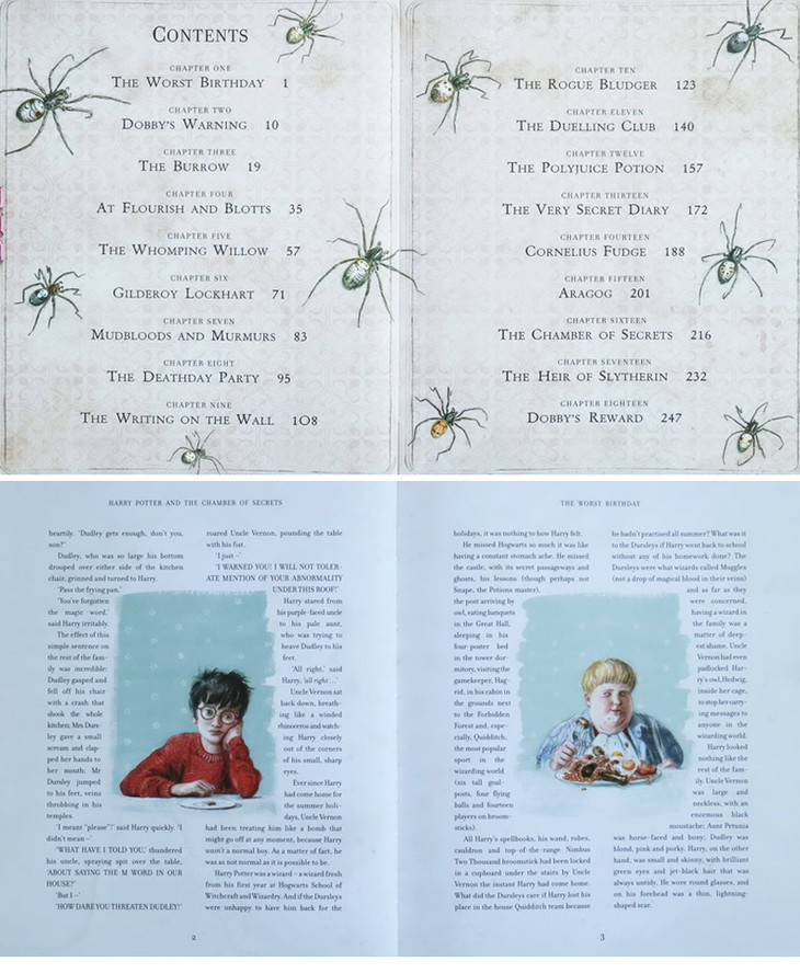 第二本书Harry Potter and Chamber of Secrets《哈利波特与密室》的插画版于2016年发行,依然由插画家Jim Kay操刀,Jim Kay以《怪物来敲门》赢得凯特格林威大奖,此次《哈利波特与密室》创作超过150张的插图。Jim Kay运用多样的媒材,水彩渲染、铅笔刻划……交错使用,时而大器地呈现魔幻场景,时而细腻刻画人物神情。
