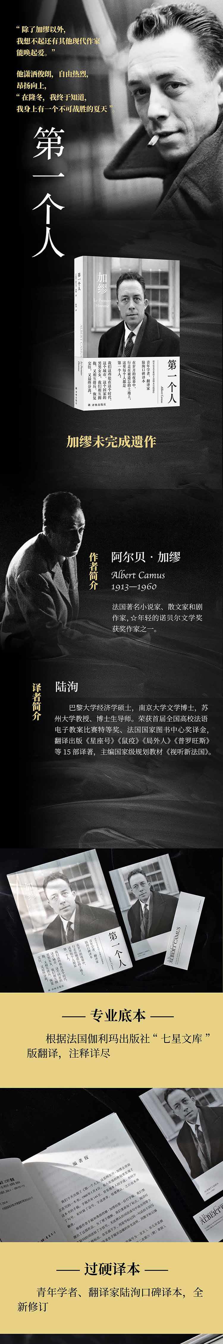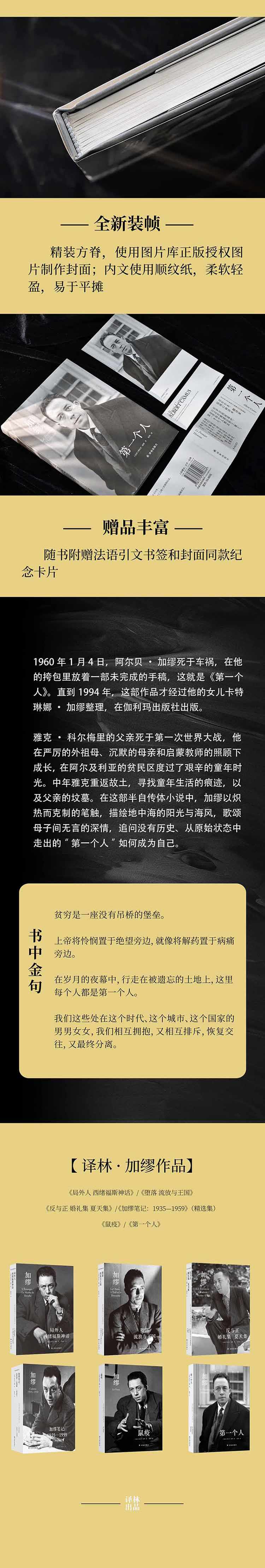 1. 诺贝尔文学奖得主加缪未完成遗作2. 青年学者、翻译家陆洵口碑译本,译文全新修订3. 精装方脊,使用图片库正版授权图片制作封面4. 随书附赠法语引文书签和封面同款纪念卡片