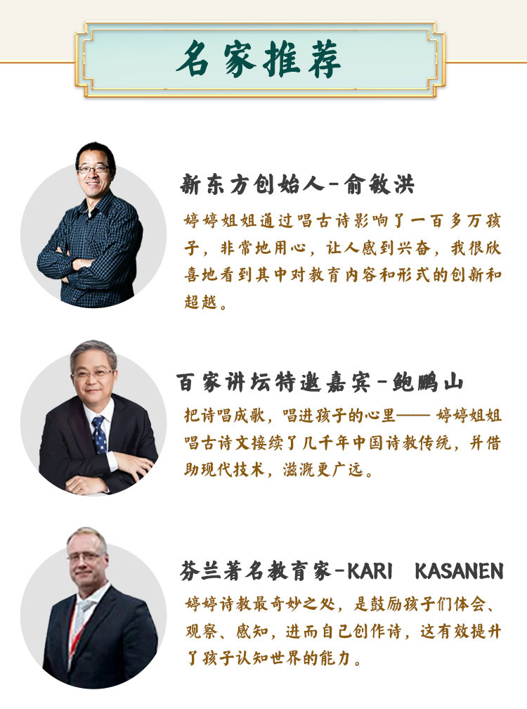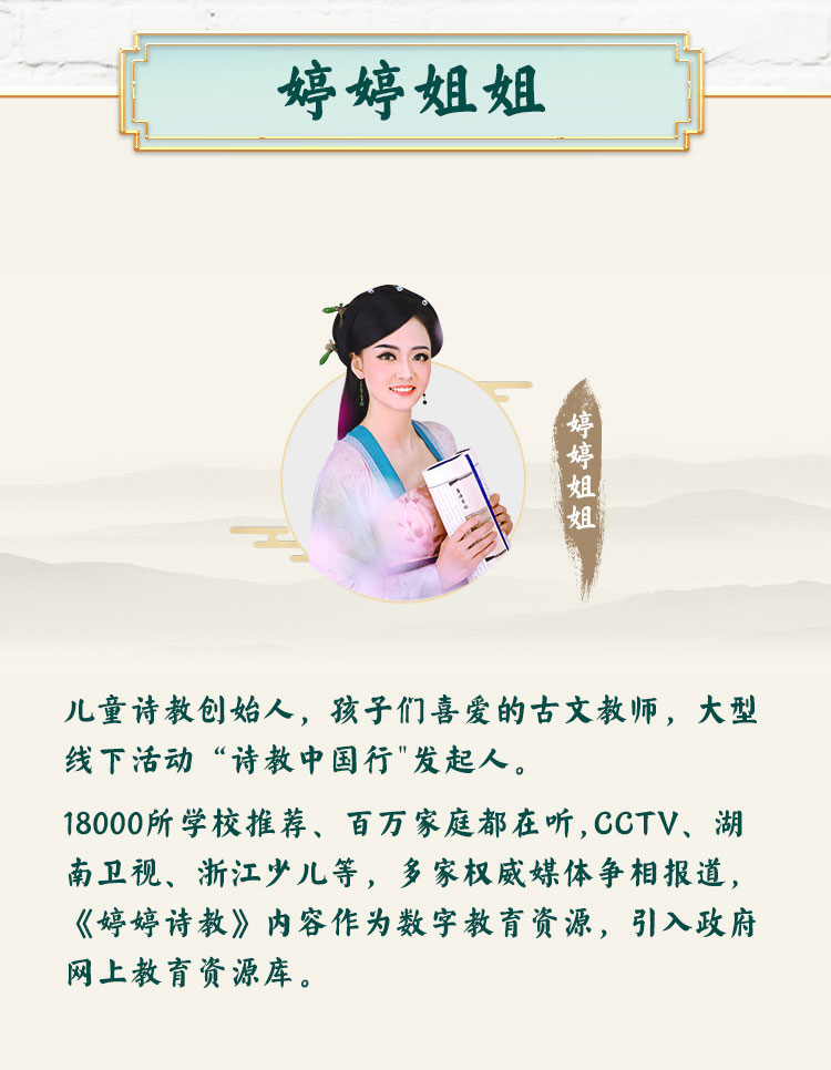 婷婷姐姐,孩子们最爱的家庭教师,已将百余首古诗词谱曲成歌,并广为流传。当下炙手可热的“婷婷唱古文”和“婷婷诗教”的专栏创作者,现代诗教开创者,倡导儿童教育从诗教开始。