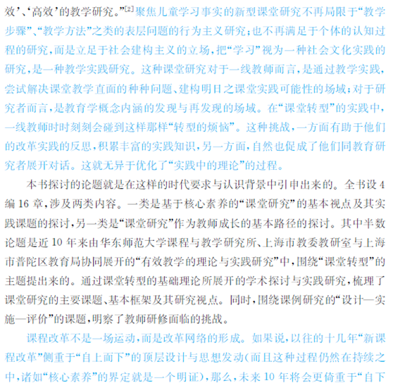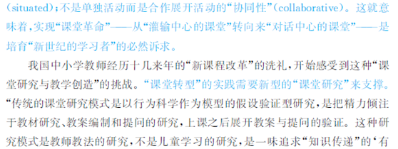 这种关联与置身其中,一定程度上反映了教育研究和课程改革实践中 :自下而上 :的潮流,也迎合了教育实践研究,特别是课堂研究的现实需要。这正是《读懂课堂》所坚信和推崇的,也是未来的《课堂转型》所依赖的。