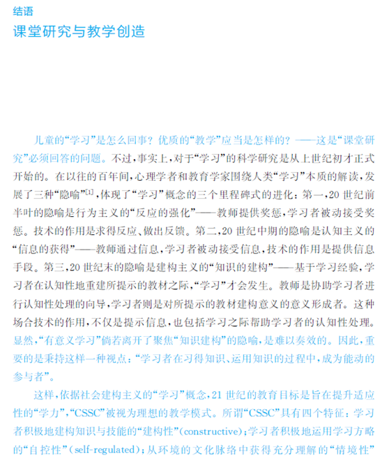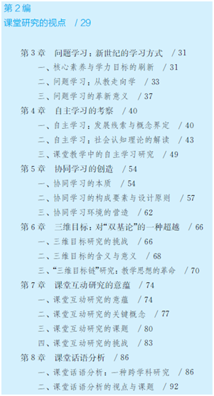 第2编课堂研究的视角分别考察了问题学习、自主学习、协同学习、三维目标、课堂互动研究、课堂话语分析等多个不同的课堂研究理论,探索教学创造的多维逻辑。