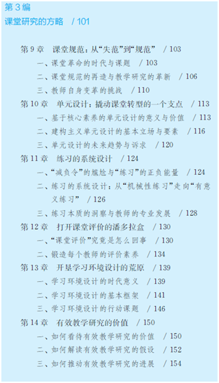 第3编 课堂研究的方略从技术层面考察了课堂研究与教学创造的方式与方法,对单元设计、练习系统设计、学习环境设计、课堂规范、有效教学等多个影响课堂教学的问题进行了理性分析并提出了操作性建议。