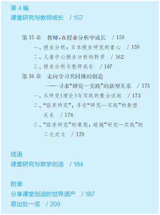 第4编 课堂研究与教师成长则考察了学习共同体和 授业分析这两种课堂研究的模式。附录 :分享课堂创造的世界遗产则系统梳理了从苏格拉底产婆术到维果茨思想的复兴热潮共12位教育家及其教育实践研究思想与成果,帮助读者从历史的脉络中探寻课堂研究与教学创造的真谛。