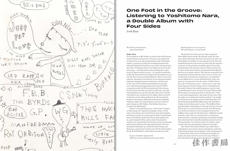 阮圆通过奈良的成长经历,解读其独特美学的源起——根植于故乡日本东北部地区的自然风土与社群生活,以及艺术家对环境与社会议题的持续关切。巴里·施瓦布斯基的专文结合画作局部细节,聚焦奈良作为油画家的创作特质。乔什·昆则探讨流行音乐对奈良的启迪——从蕴含反战思想的美国民谣、忧郁蓝调,到后来的华丽摇滚、朋克与新浪潮音乐。