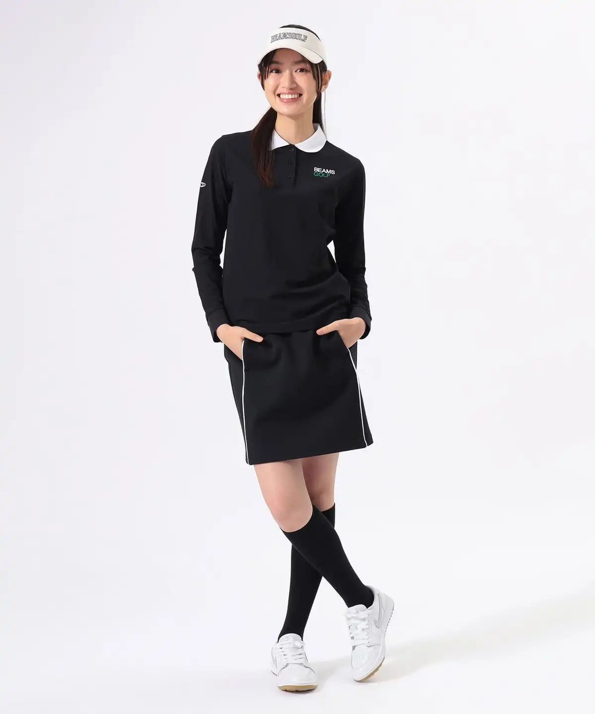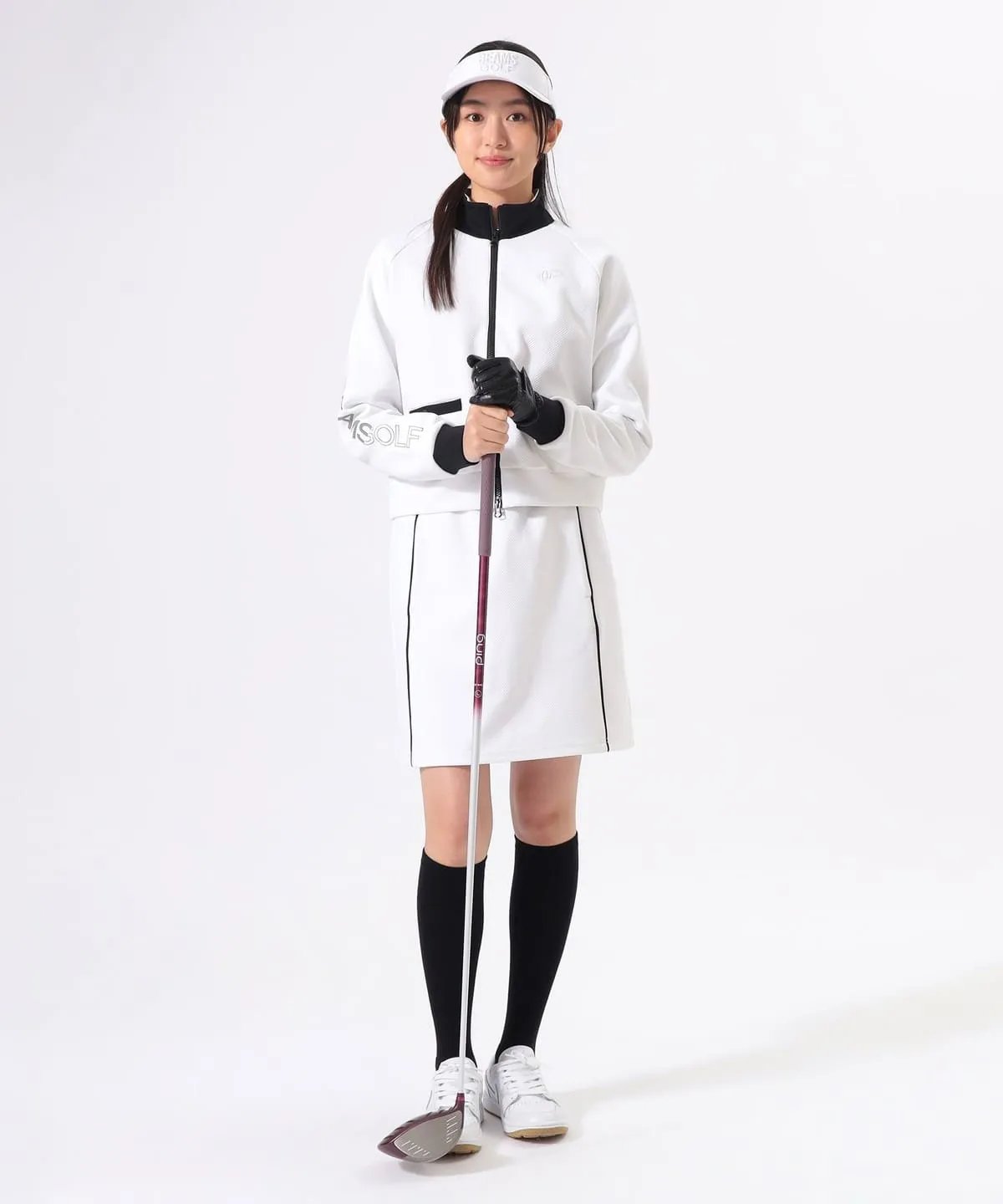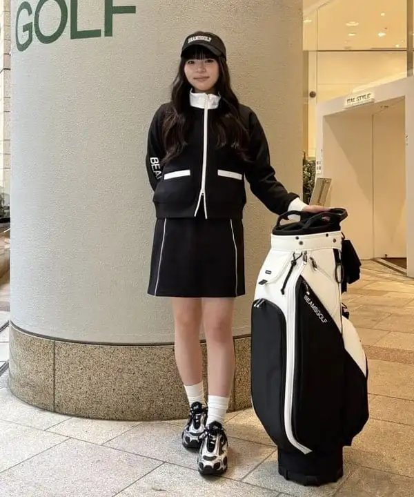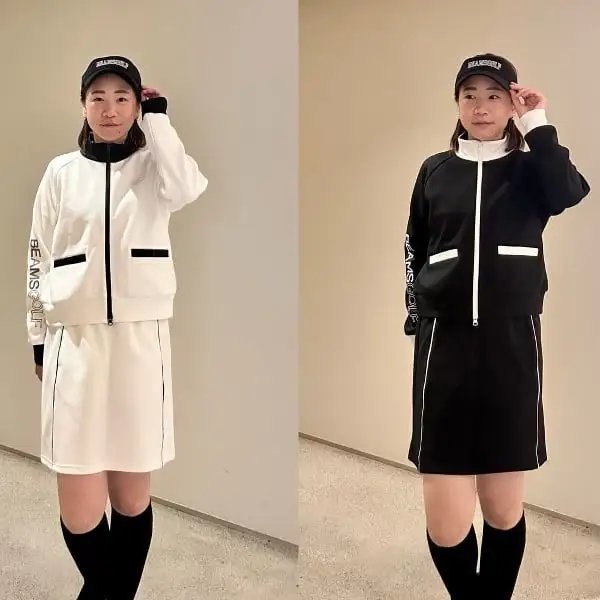 BEAMS GOLF 女款 斜纹黑白配色立领外套+抽绳短裙套装 弹力舒适防紫外线