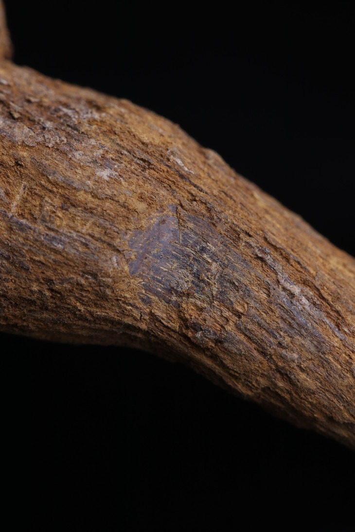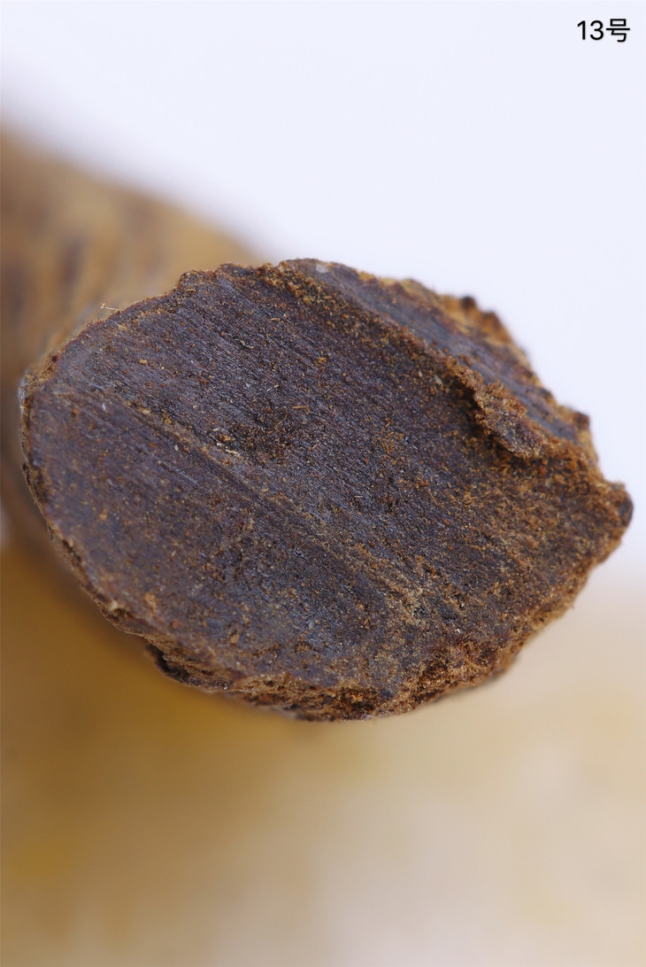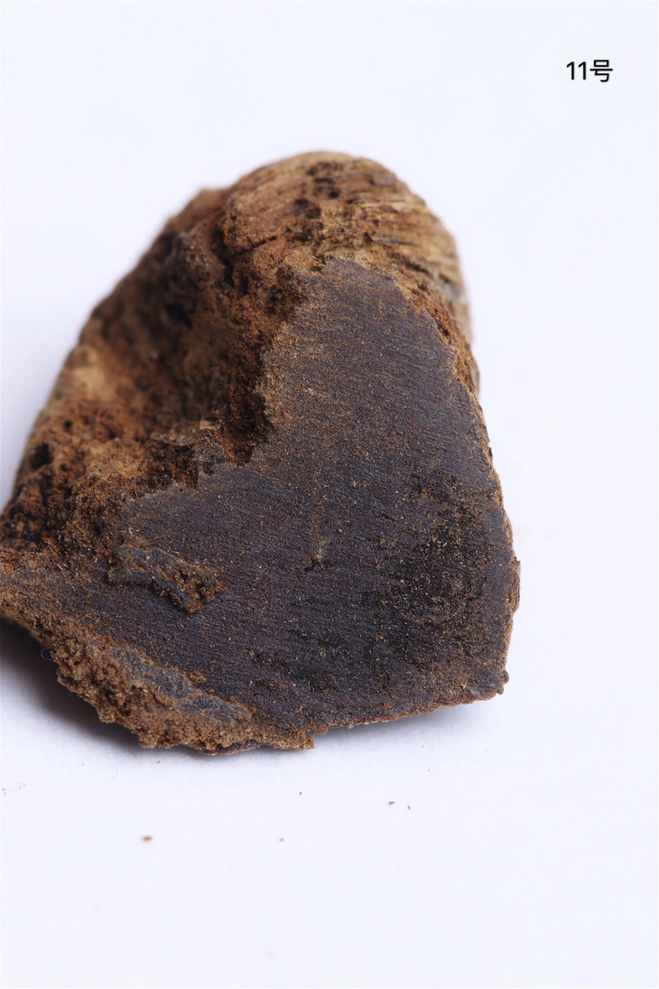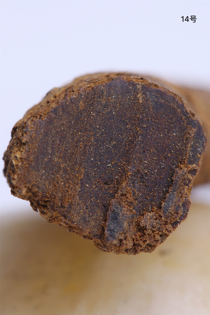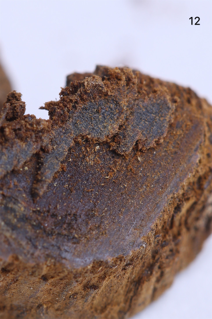 没有清理过的富森红土酥脆松软,表面为粗糙的碳化层,下为内部油脂。其味甜凉,浓重,悠远。因为这类土沉在土中掩埋的时间较长,因此外壳非常松脆,并且个别炭化严重,无法再加工,只能做为熏材使用。
