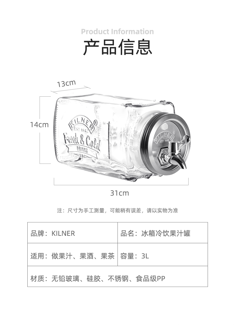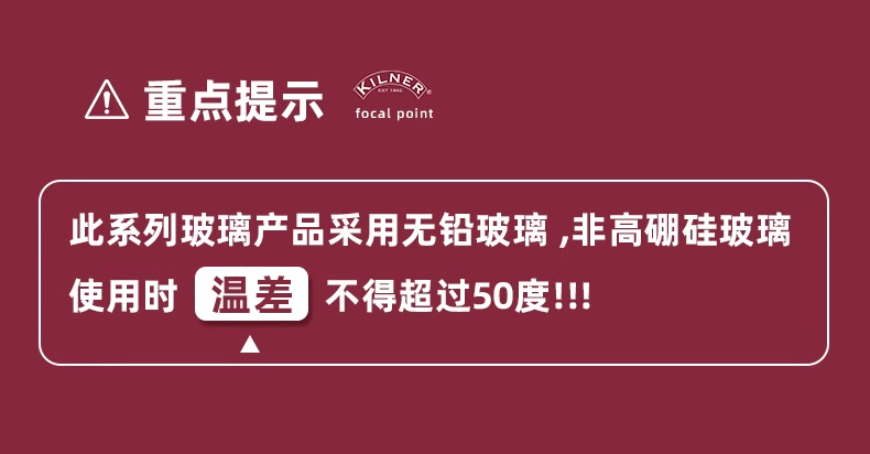 KILNER系列产品采用传统工艺,无铅玻璃,非高硼硅玻璃。使用时,温差不得超过50度。建议高温泡制饮品时,待温度降低到日常室温时再将液体灌入本产品,或然后再放入冰箱冷藏。