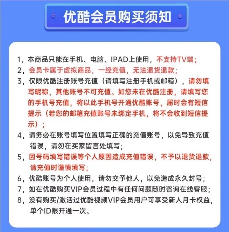 购买须知: ★ 下单前请您务必仔细阅读产品中各项说明,然后在下单订购 ★ 下单购买后,则视为您已仔细阅读本产品中的各项说明,并认同此声明以及产品规则,否则责任自负,不在售后服务之内 产品说明: 支持端口:手机、Pad、电脑【不支持电视端】 充值账号:请填写优酷登录绑定的手机号,不支持在备注填写充值号码,仅支持下单默认的充值手机号,请不要填错 充值时间:本产品为快速直充,下单后3-60分钟左右到账 购买限制:每笔订单限购1单,多次购买请分开下单 到账核实:下单后60分钟未到账,请先登录自己的账号查看,退出重新登录查看,如确实未到账,请及时联系客服 注意事项: 顾客下单后自动充值,发货状态并不会立刻变成已发货,已经充值成功无法退换 虚拟充值产品不适用于七日无理由退货条款,一经购买,不退不改 因个人原因造成充值错误,责任自负,不予退款 如遇市场断货问题,平台将无条件为客户进行退款 |