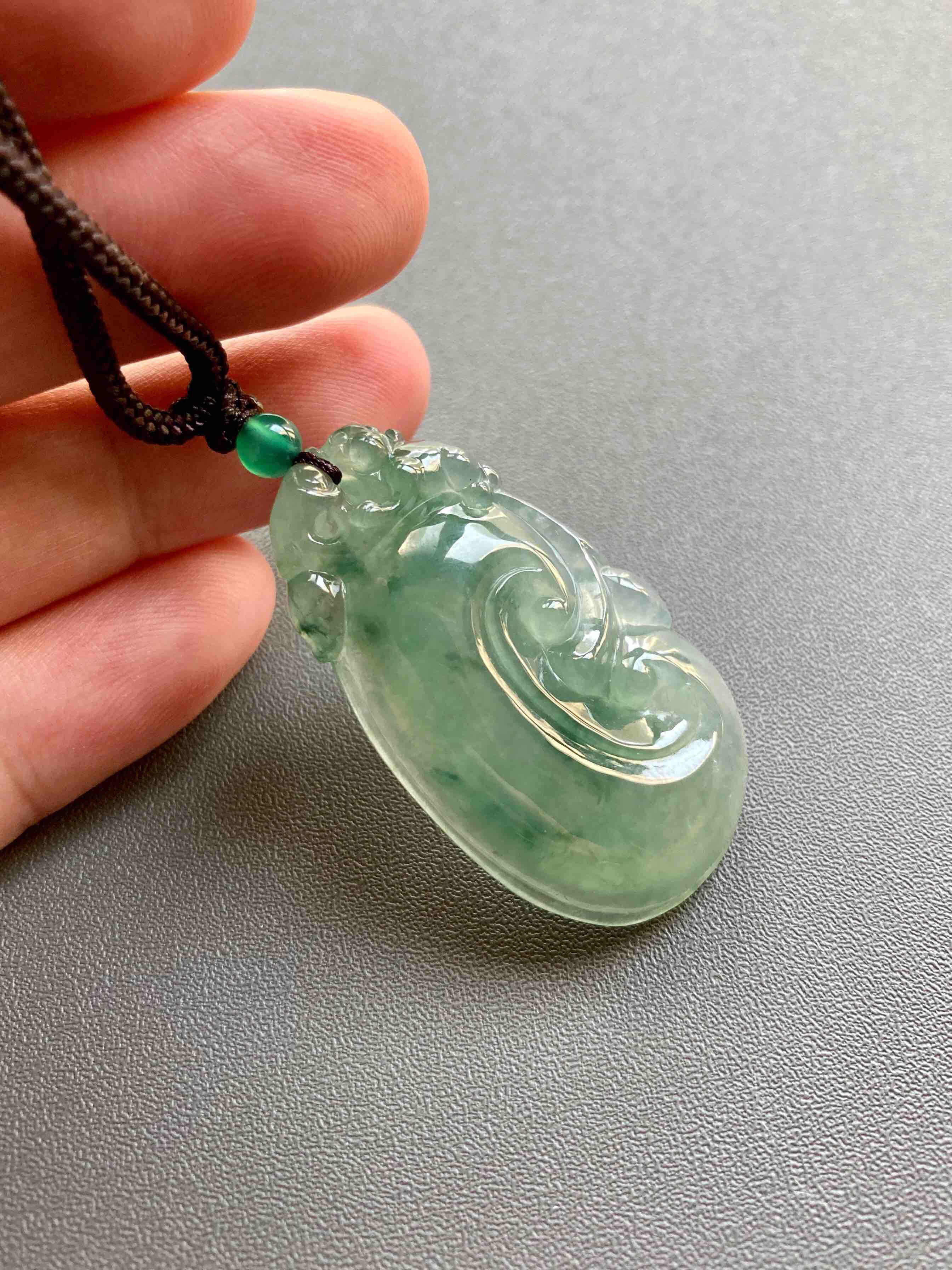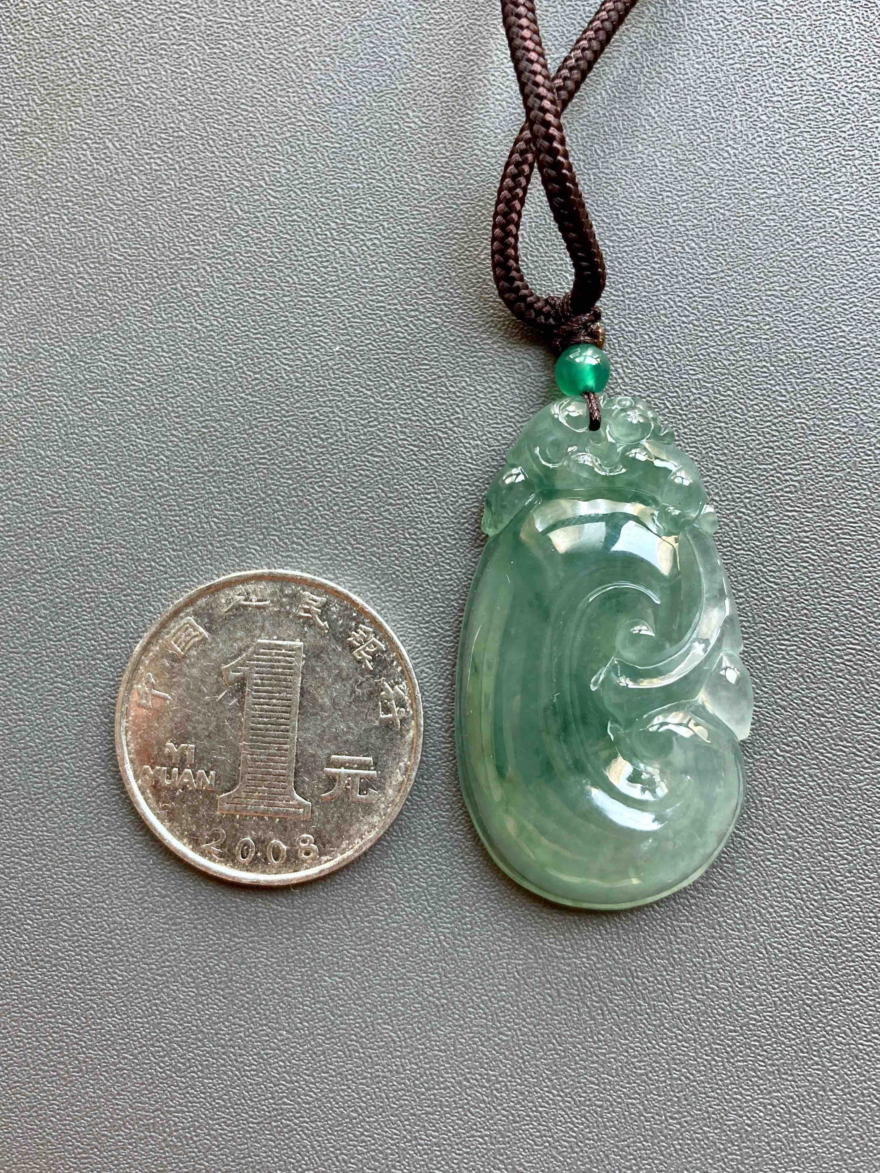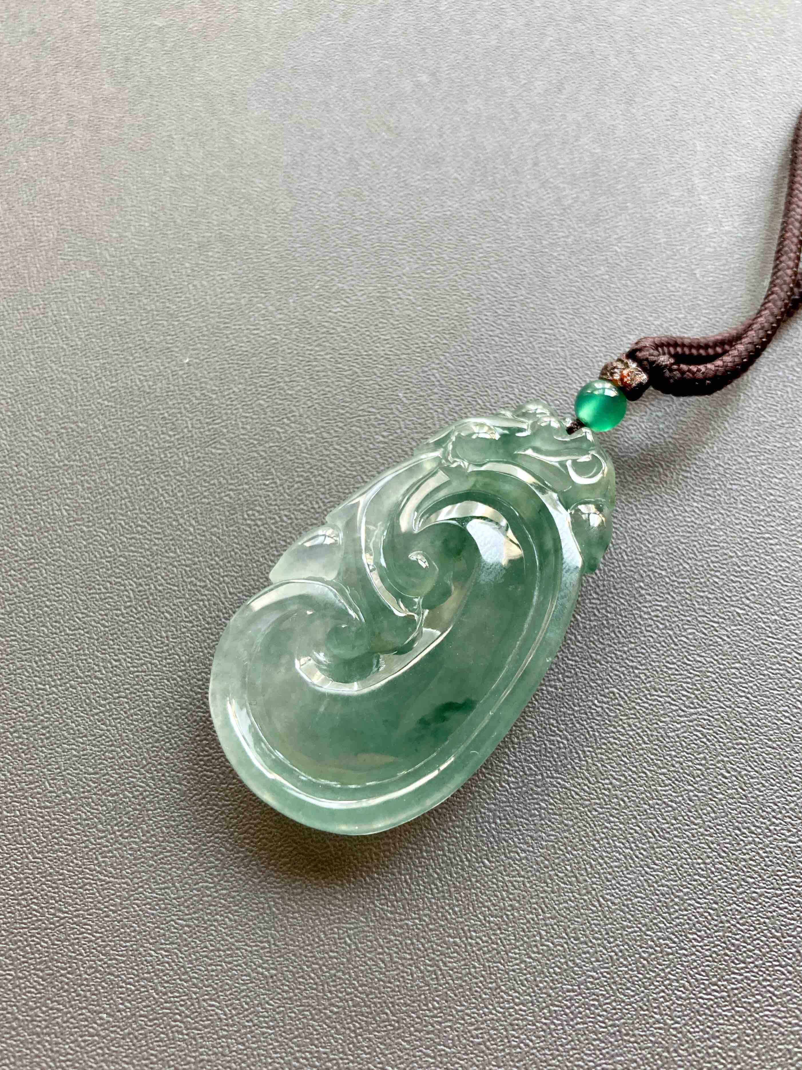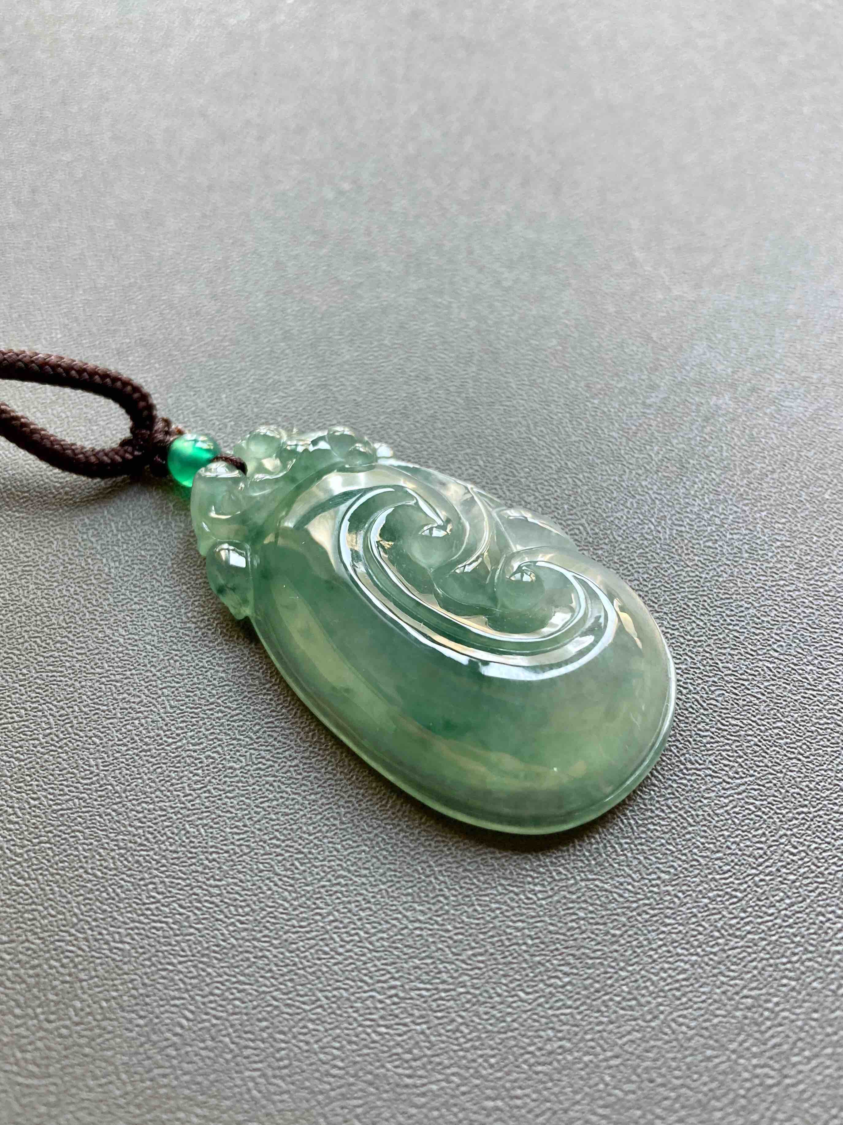 冰种晴水飘花厚庄翡翠大如意,40.1×23.2×7.7mm,放个漏,没有什么比这个更给力了,超大超厚的冰种晴水绿飘花翡翠如意,种水特别冰透,看雕工多漂亮,上面一个小猴,下面如意,寓意灵猴献瑞,福寿安康,只要小四价位,最适合送长辈,大件有福气