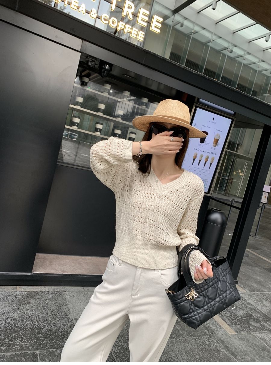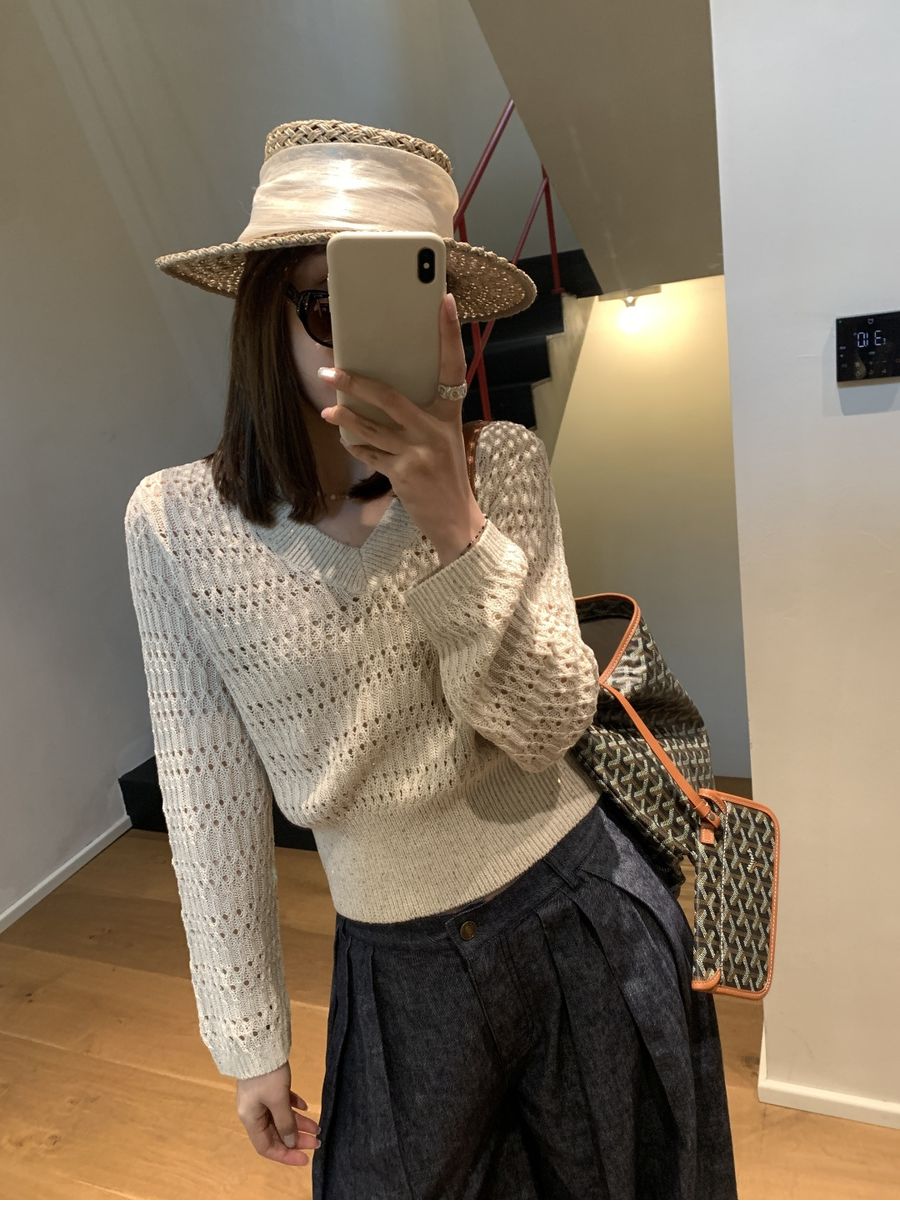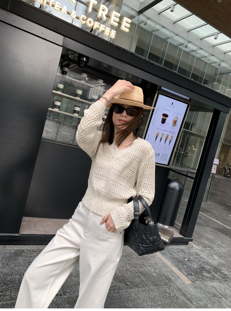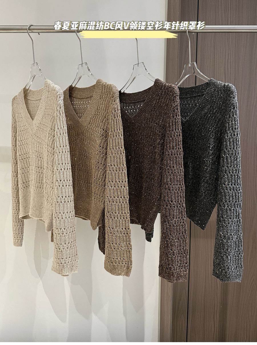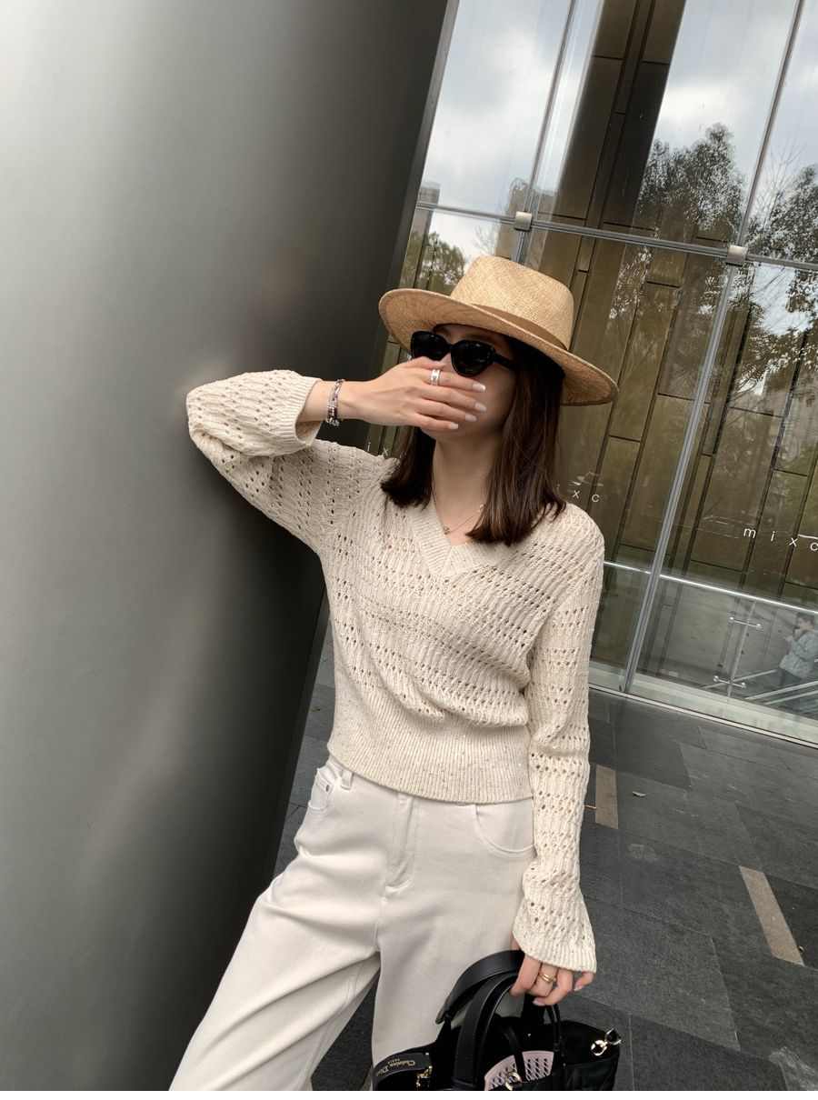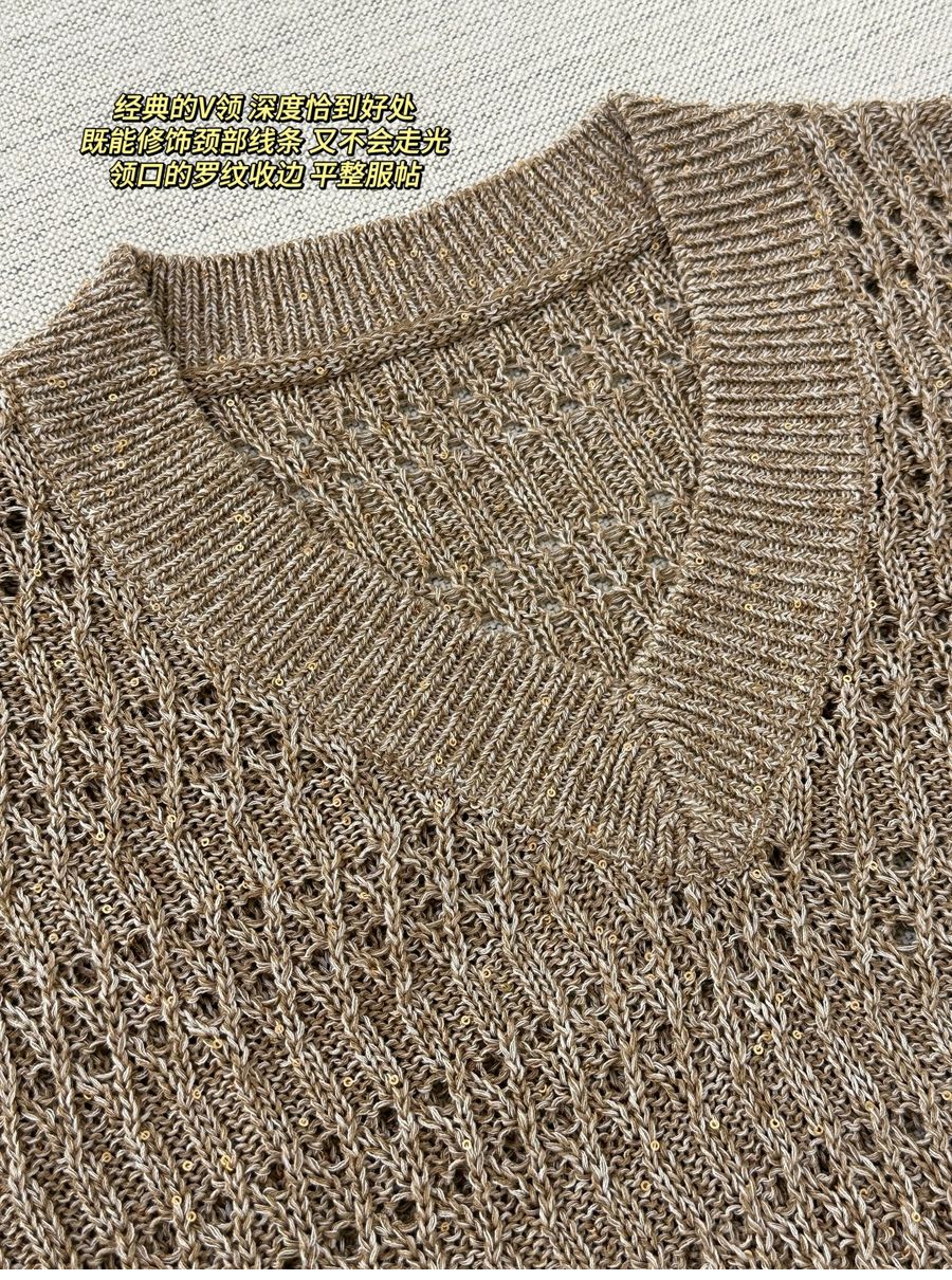 自留款。太好看了~轻奢华高质感穿❗️定制系列!春夏亚麻混纺BC风V领镂空衫年针织罩衫(售后时间:签收3天内,不合适及时申请)