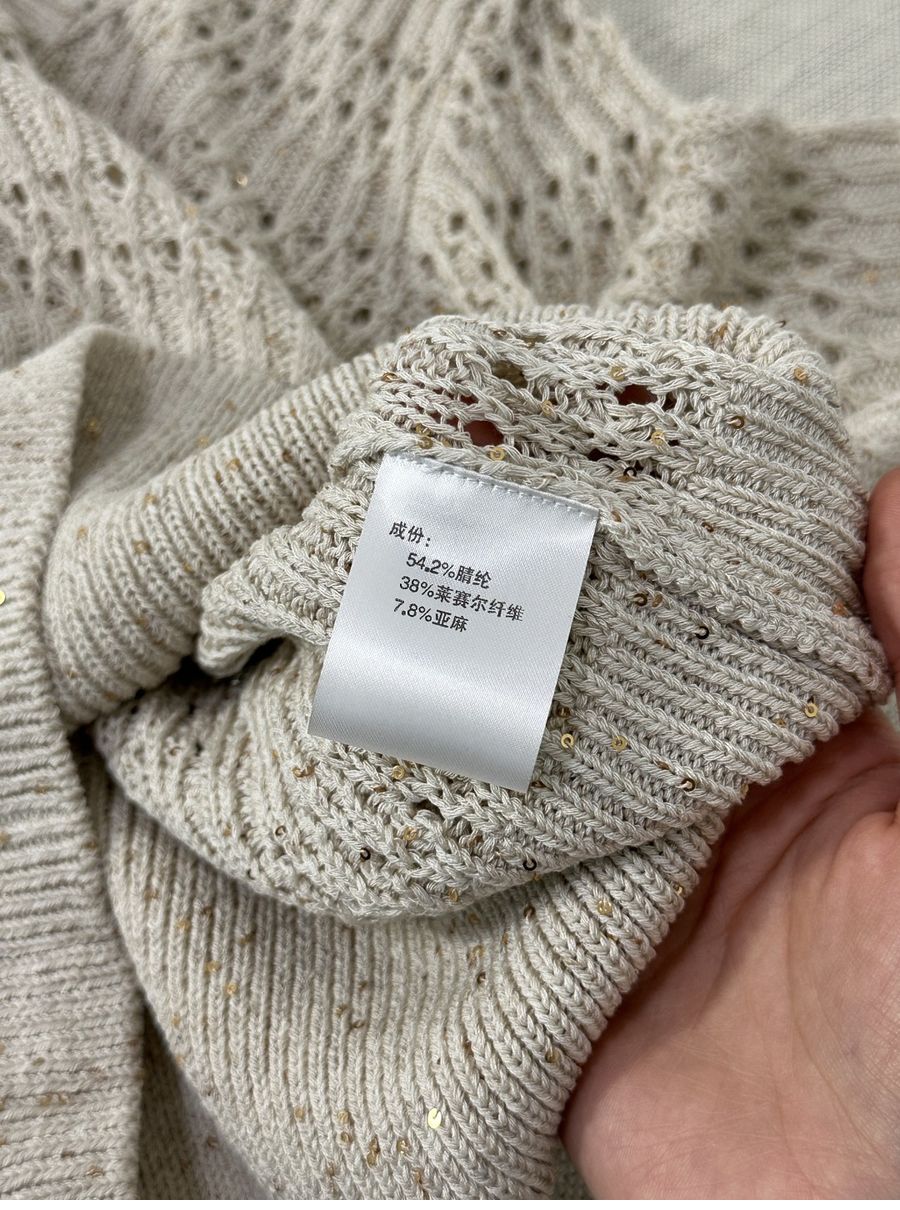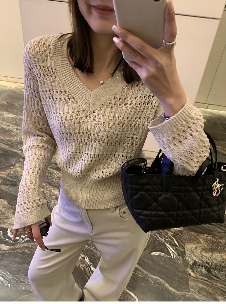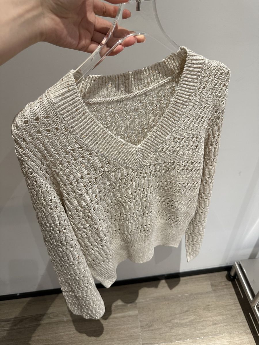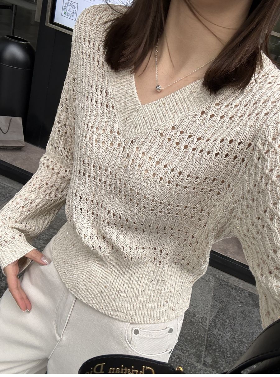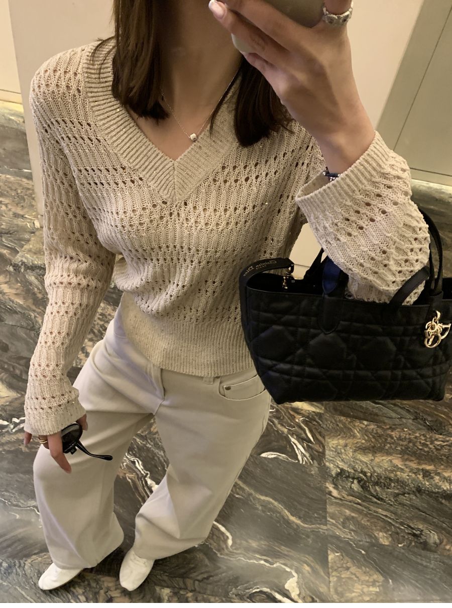自留款。太好看了~轻奢华高质感穿❗️定制系列!春夏亚麻混纺BC风V领镂空衫年针织罩衫(售后时间:签收3天内,不合适及时申请)
