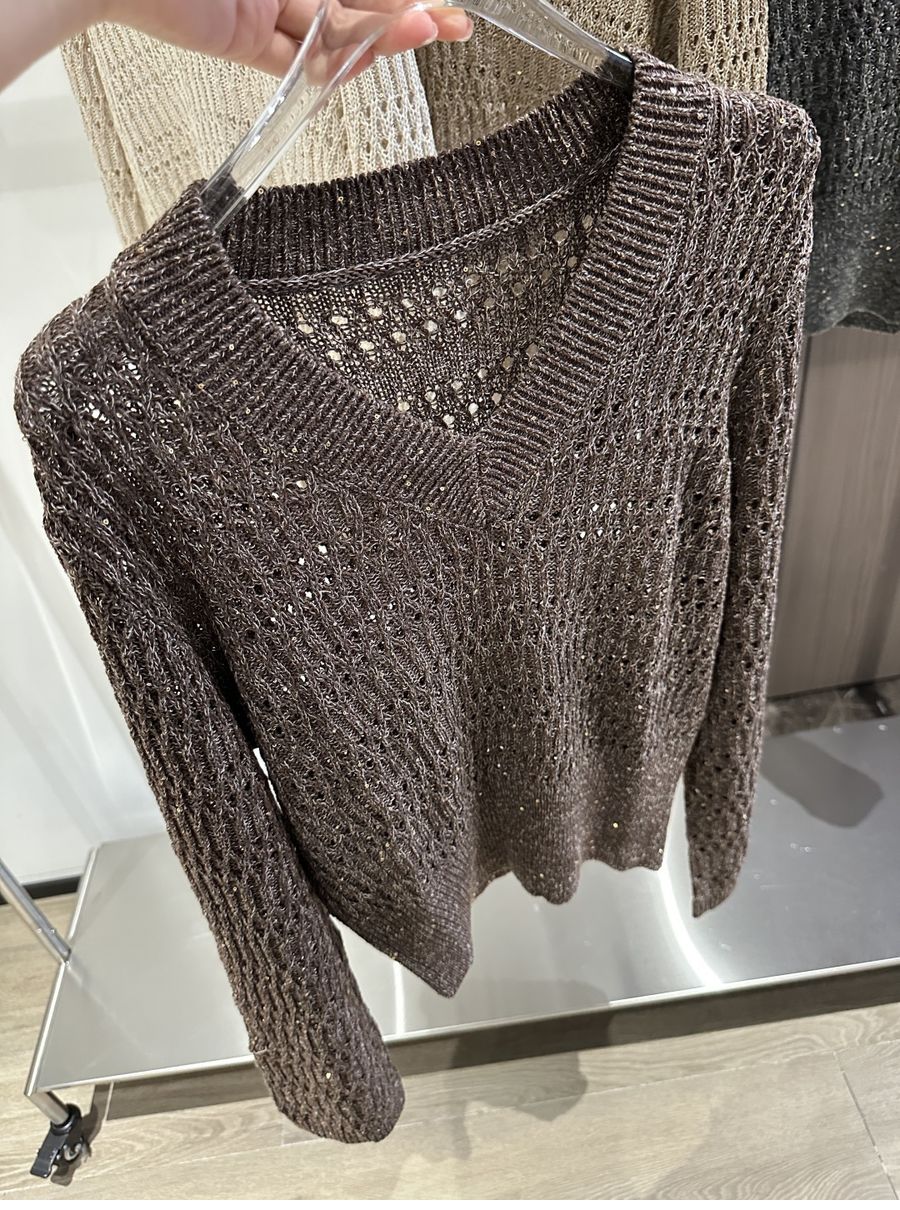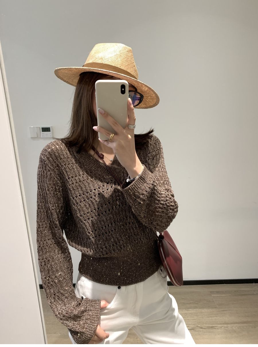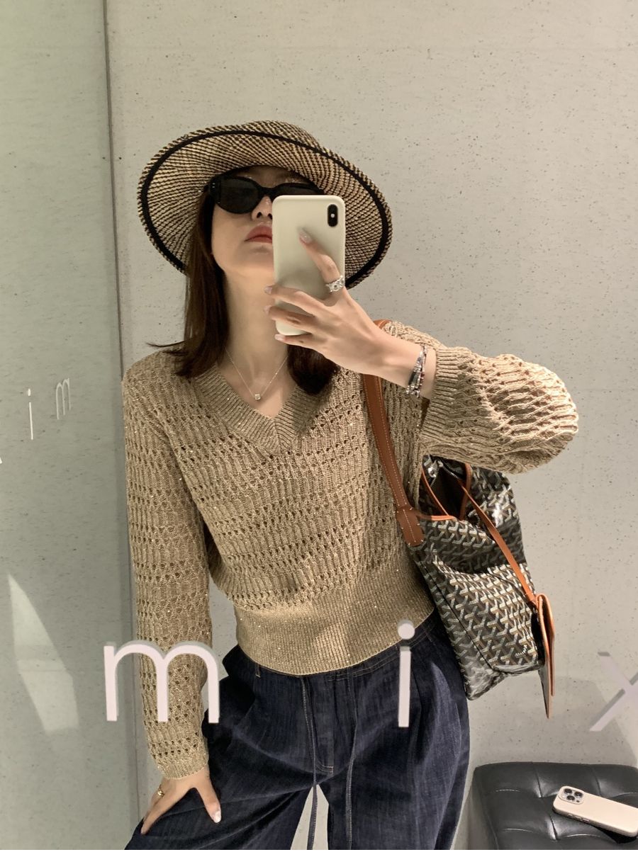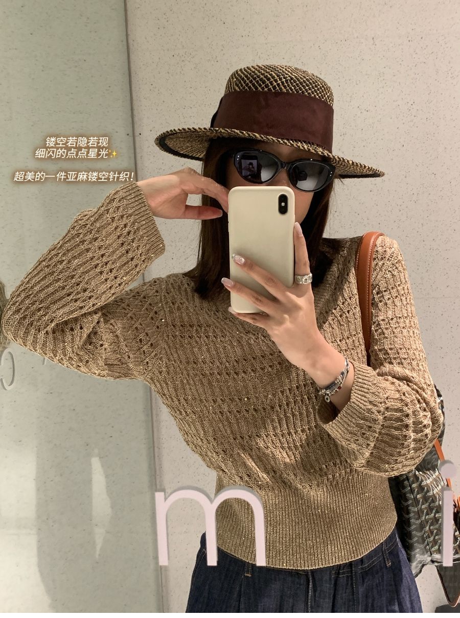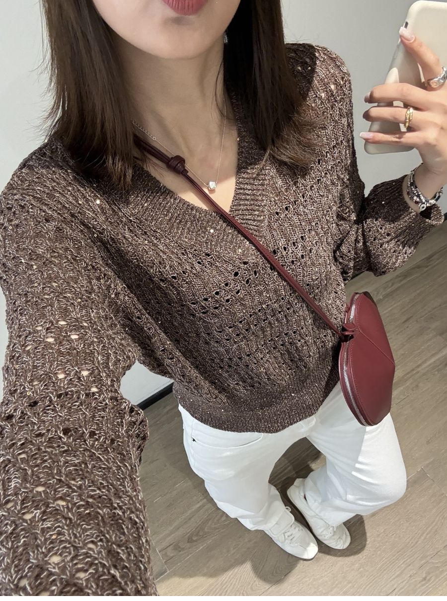 自留款。太好看了~轻奢华高质感穿❗️定制系列!春夏亚麻混纺BC风V领镂空衫年针织罩衫(售后时间:签收3天内,不合适及时申请)