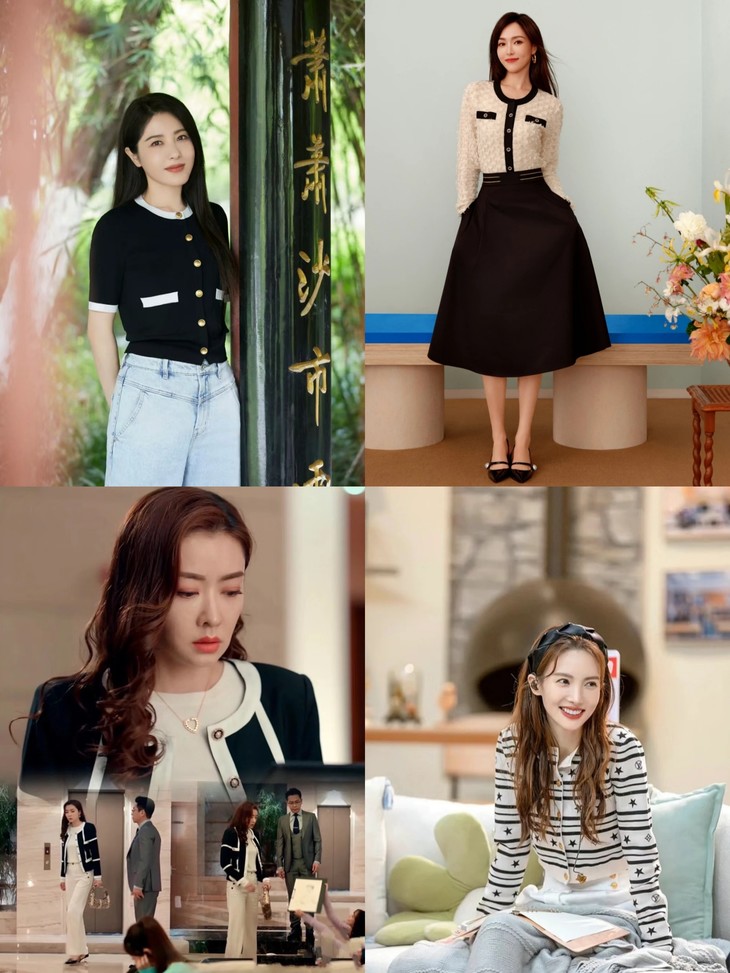 演员唐嫣,一身白色拼接黑色小香风开衫,温柔显气质!