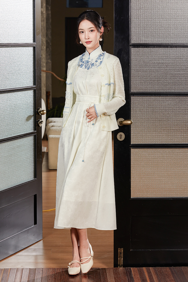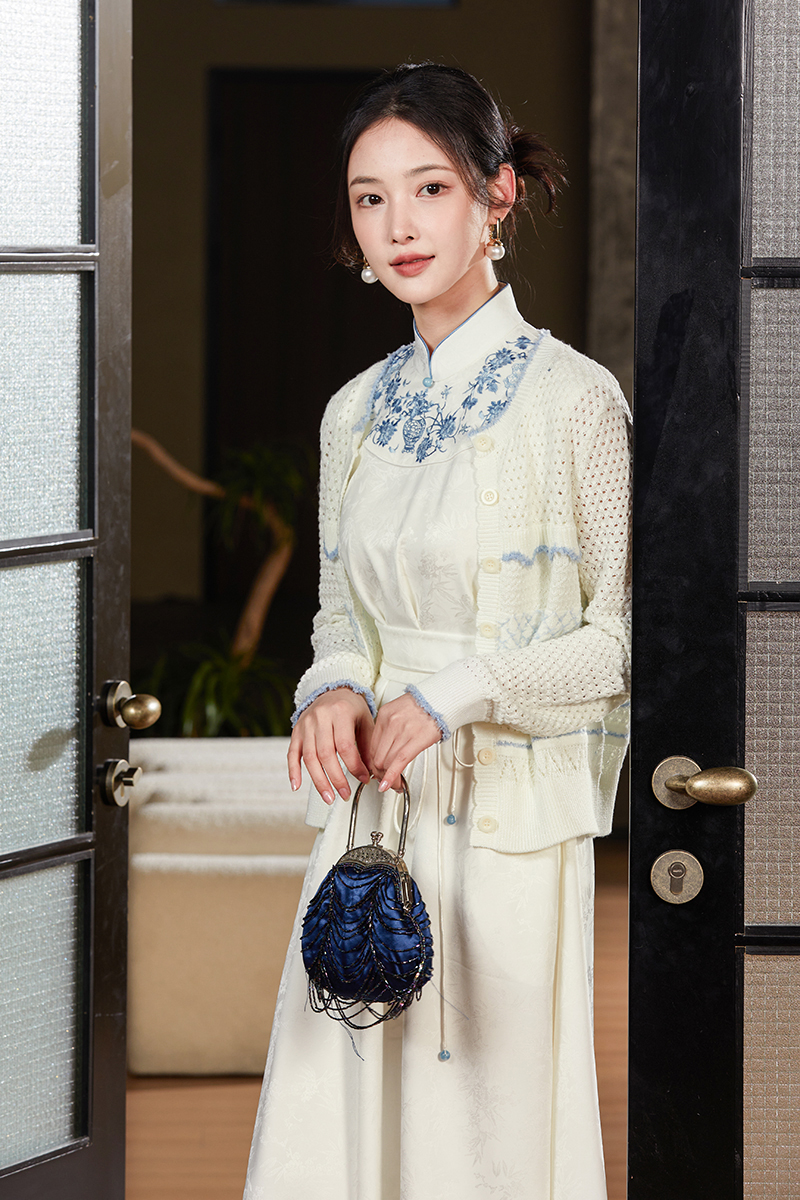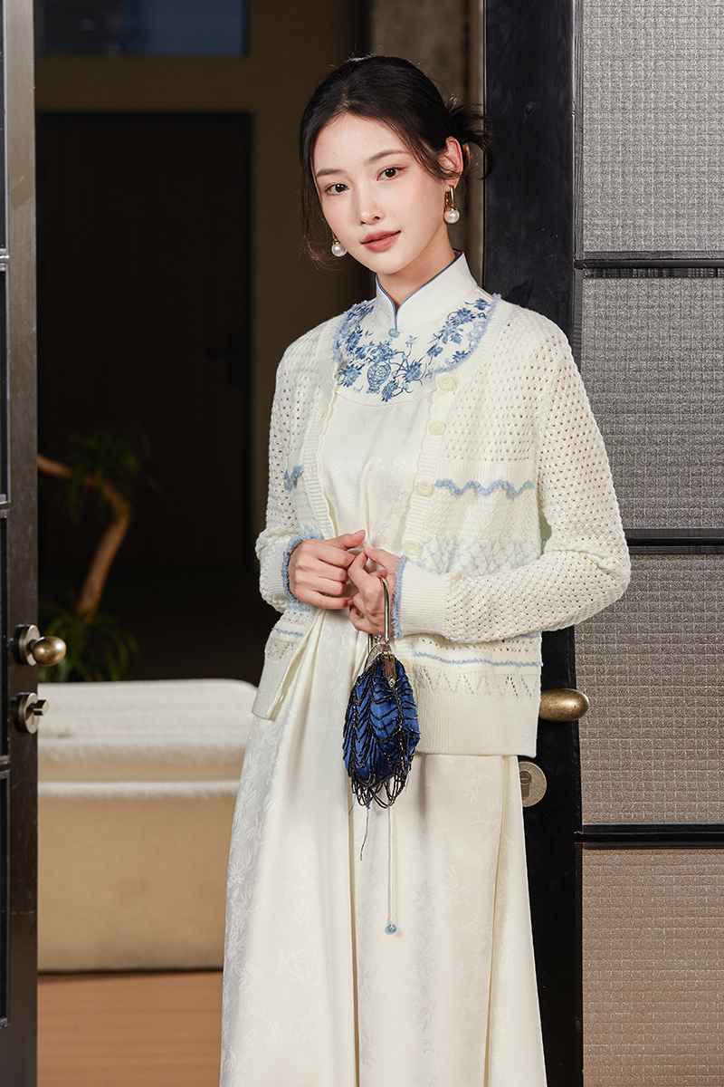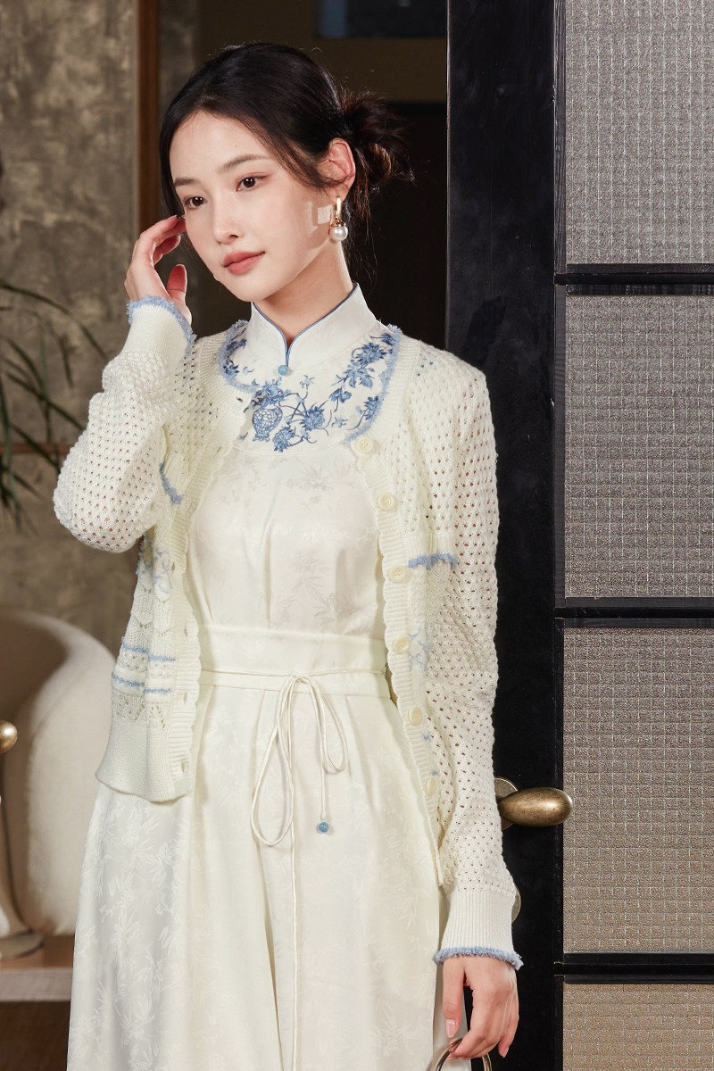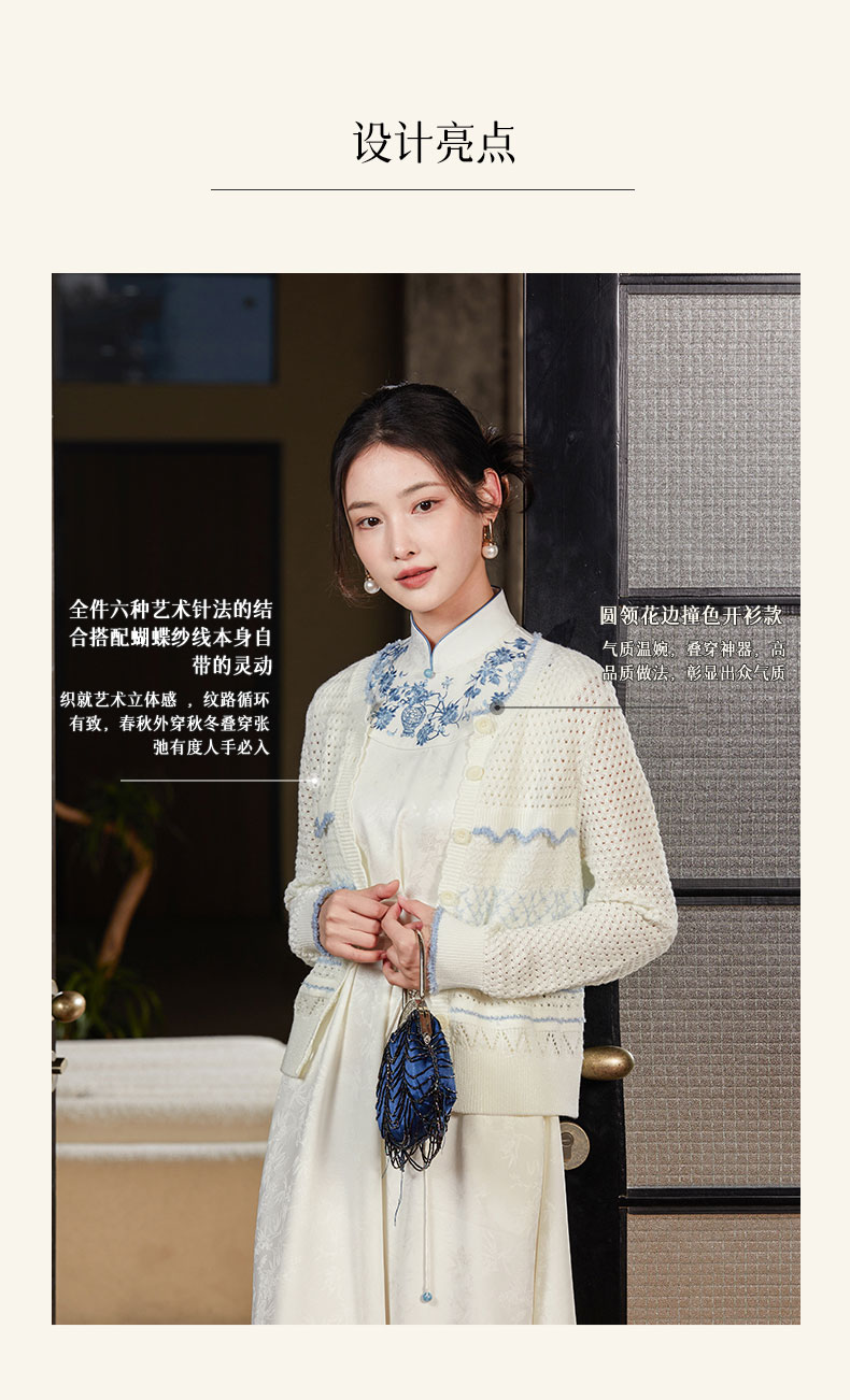 设计师巧妙地将青花瓷的纹饰转化为针织的立体纹路,使得整件开衫既有古典的温婉,又不失现代的时尚感。