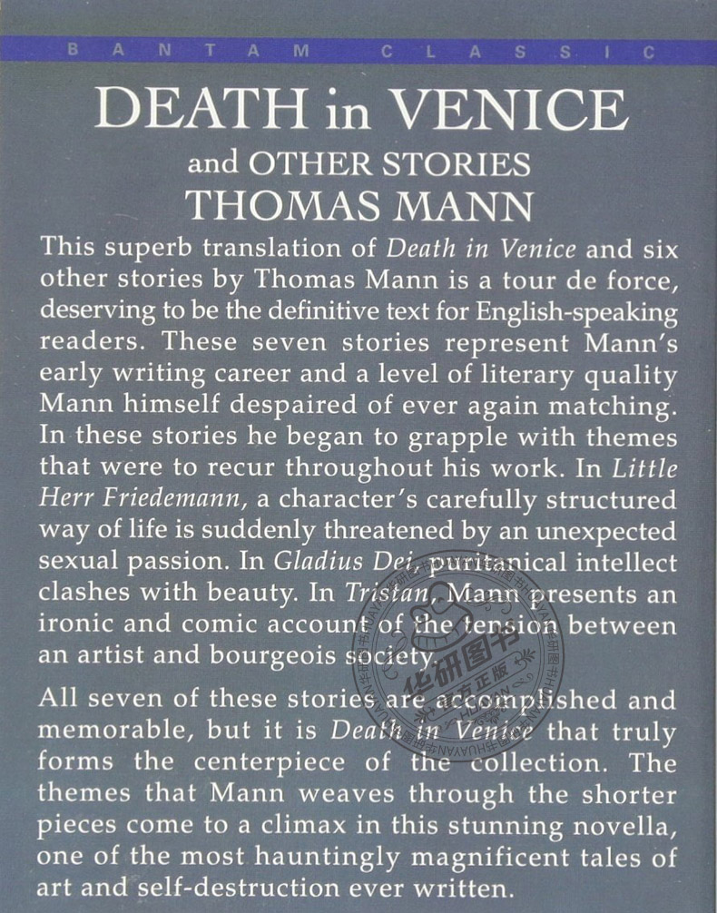 Death in Venice and Other Stories《死于威尼斯》(魂断威尼斯)是托马斯·曼著名的中篇作品,1912年在德国出版,作品蔓延着古希腊埃斯库罗斯式的古典悲剧精神,描述一位文学家在威尼斯邂逅波兰少年后骤然爆发的激情,他的理性、尊严与知识,在对美和情感的追求中被击溃。